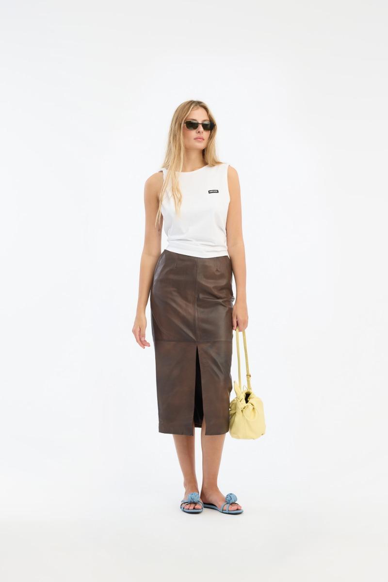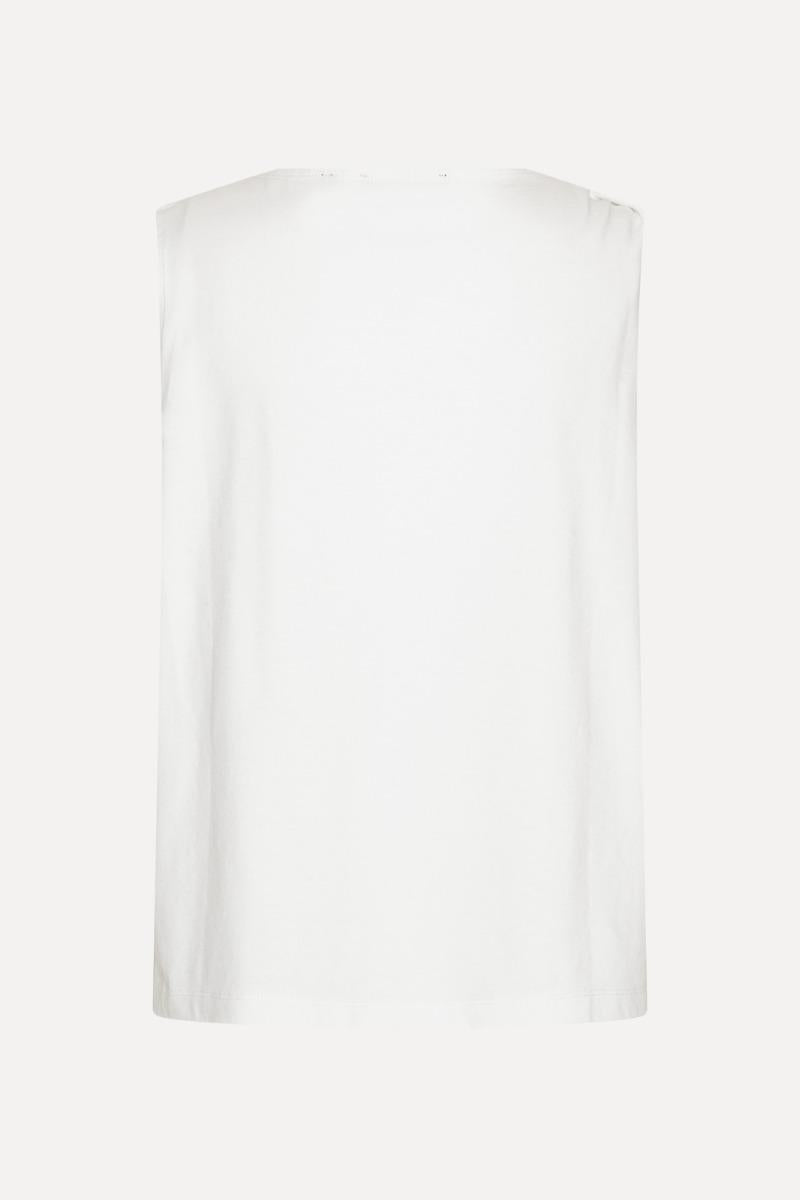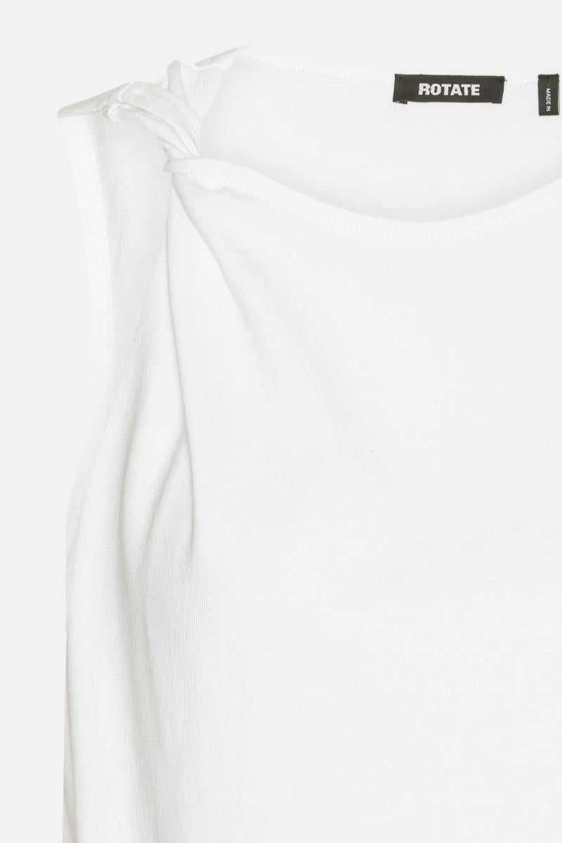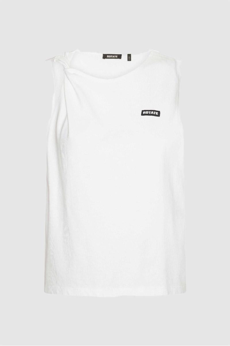 La canotta in jersey Bright White è una canotta senza maniche realizzata in morbido jersey di cotone. Presenta uno scollo rotondo con un piccolo nodo arricciato su una spalla, che aggiunge una texture discreta alla silhouette pulita. La canotta è rifinita con una piccola toppa con logo ROTATE sul petto.