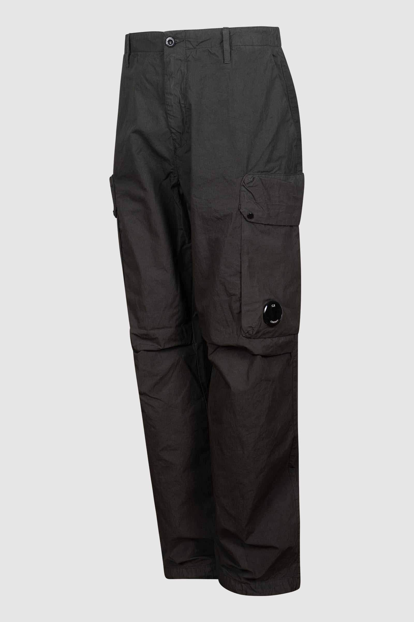 Pantaloni cargo realizzati in Micro-Reps, un tessuto di cotone ad alta densità caratterizzato da una struttura compatta e una mano morbida. Il modello presenta chiusura con bottone e zip, passanti per cintura e tasche laterali. Dettagli funzionali includono tasche con patta e bottoni automatici con l'iconica Lente di C.P. Company, una tasca posteriore con patta e un'etichetta con logo applicata sul retro. L'orlo regolabile con coulisse completa il design. Made in Italy. Boxy fit.