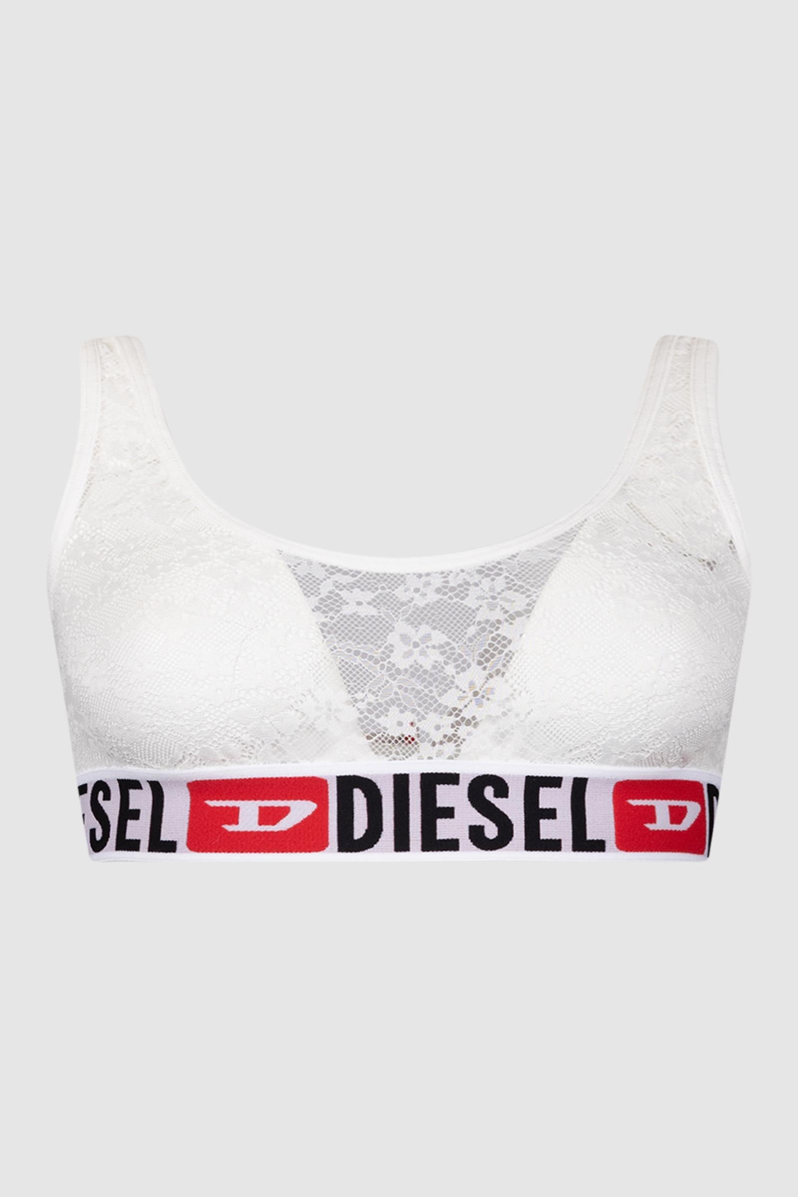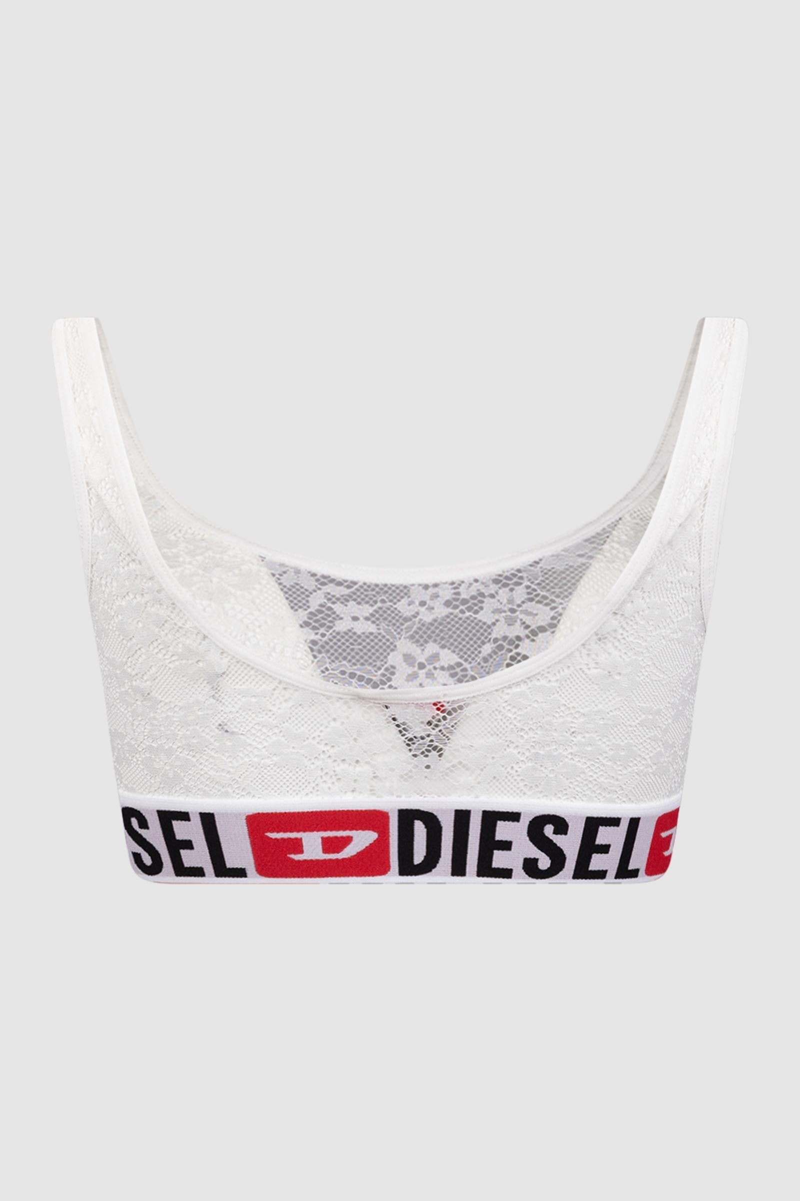 Questo bralette presenta un delicato motivo floreale in pizzo realizzato con una miscela di nylon ed elastan, completato da una fascia elastica con logo Diesel per una vestibilità sicura.