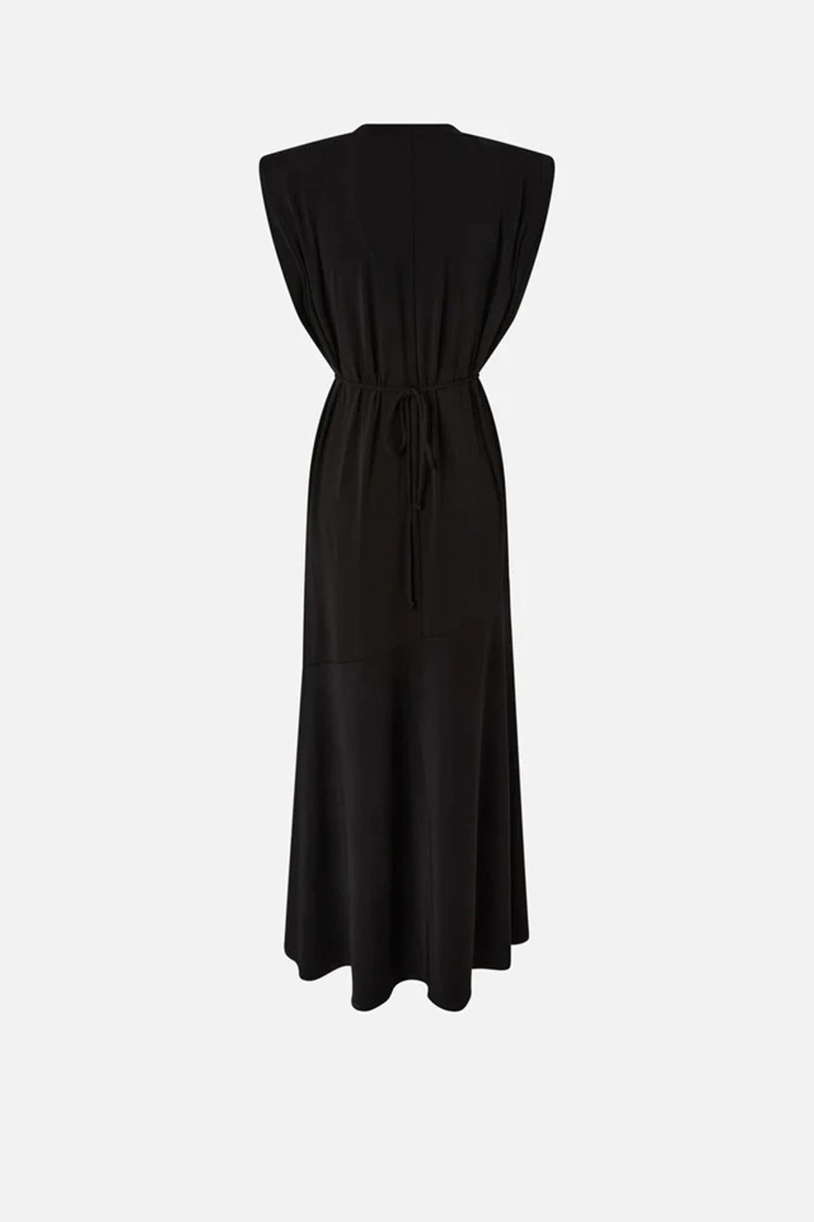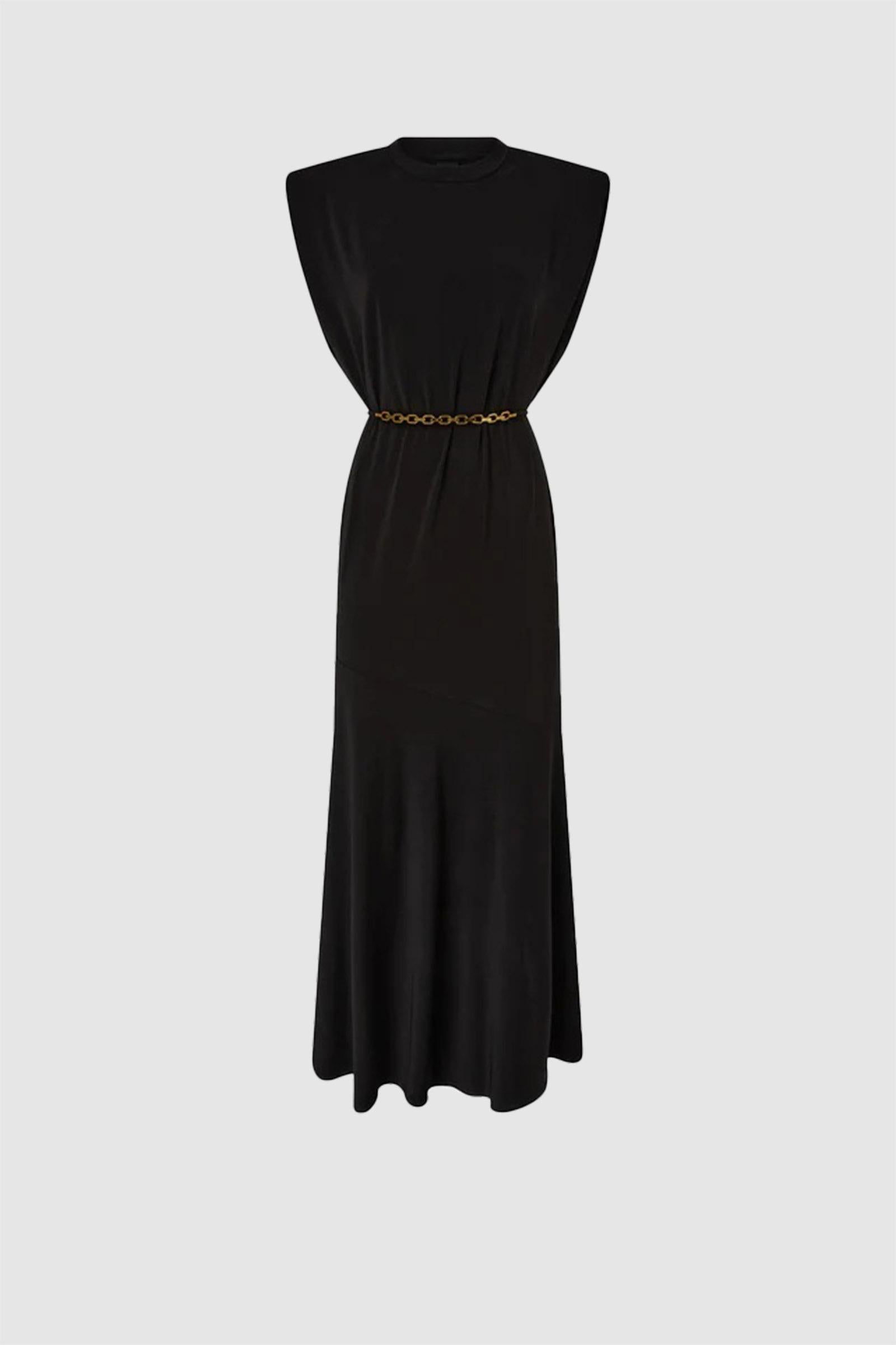 Abito lungo girocollo dal design smanicato, realizzato in jersey crêpe stretch dall'aspetto lucido simile alla seta. Il capo presenta una silhouette morbida, accentuata dall'orlo dall'effetto ondulato, ed è completo di una cinturina rimovibile in vita con parte frontale in tessuto, da annodare a proprio gusto, e parte posteriore a catena, per un dettaglio grintoso che esprime il DNA PINKO. Questo vestito diventerà il tuo alleato ideale sia per un look da giorno femminile, con un paio di scarpe basse, sia per una serata speciale, con un paio di décolleté.Tessuto Esterno: ACETATO 76% NYLON 21% ELASTAN 3% - Accessorio: Zinco 100%
