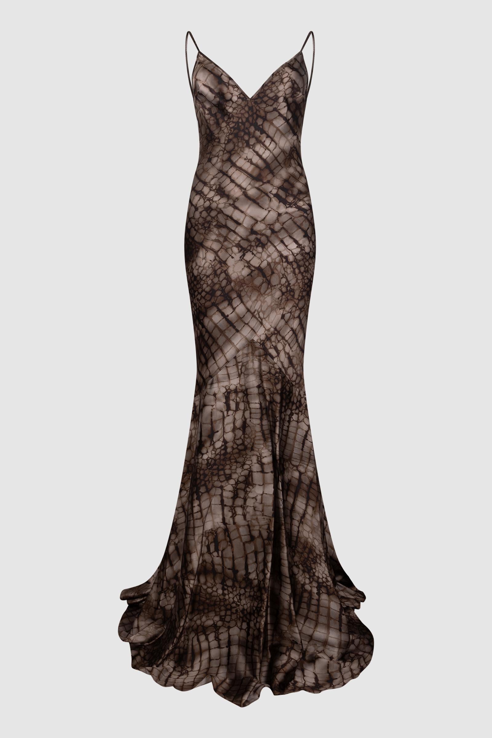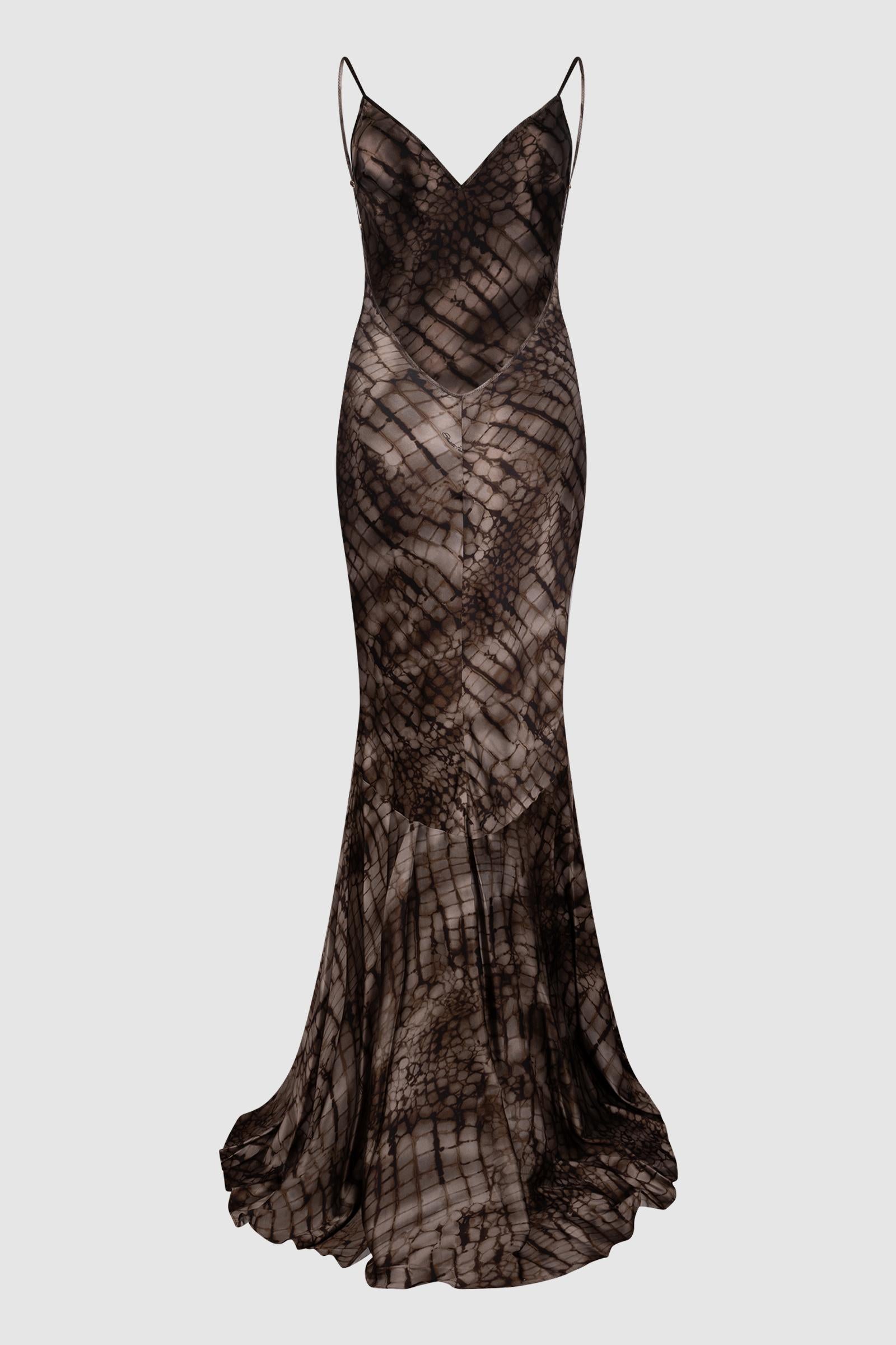 Abito da sera in raso stretch dalla vestibilità slim. Il vestito ha spalline sottili e il retro rivela la schiena nuda. Protagonista è la stampa all-over a tema alligatore, ispirata a forme e geometrie naturali. La gonna con taglio a spicchio si apre in leggiadri volumi al fondo.
