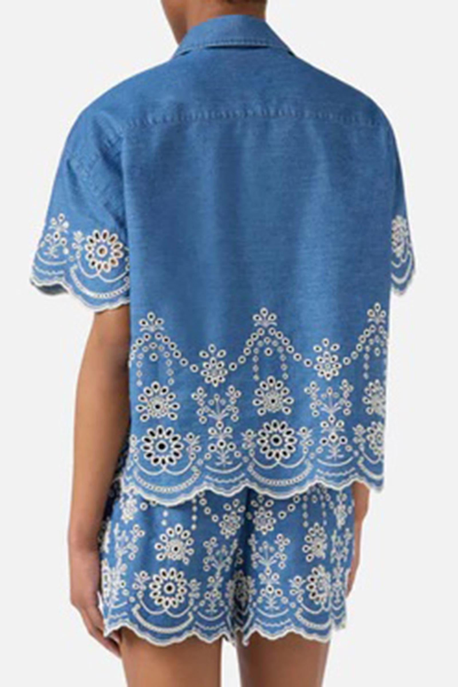 La camicia Clementine è realizzata in cotone chambray, un tessuto leggero e traspirante pensato per offrire comfort e freschezza. Il design blu tinta unita effetto denim valorizza l'estetica essenziale del modello. Il capo presenta collo classico e abbottonatura frontale con bottoni logati. Il modello è caratterizzato da ricamo floreale a contrasto sul fondo e sulle maniche, completato da fondo smerlato ricamato che definisce il capo con un dettaglio decorativo distintivo. La linea ampia è progettata per offrire una vestibilità comoda e rilassata.