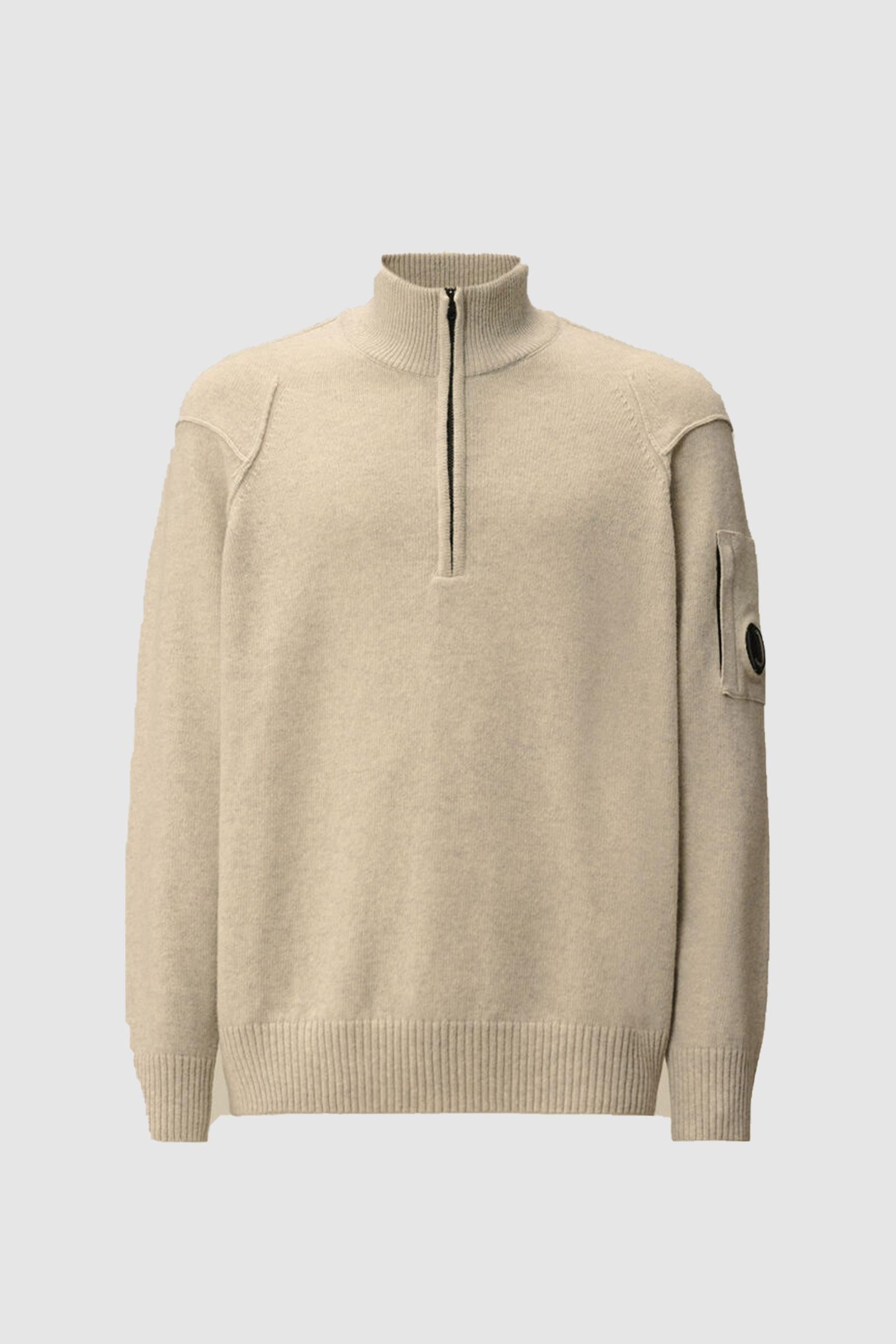 Maglione half zip realizzato in Lambswool GRS. La certificazione Global Recycled Standard garantisce il rispetto di criteri ambientali e sociali in tutte le fasi della filiera. Il capo presenta collo a costine, cuciture a contrasto, l'iconica Lente di C.P. Company e finiture a costine. Finezza 7. Regular fit.