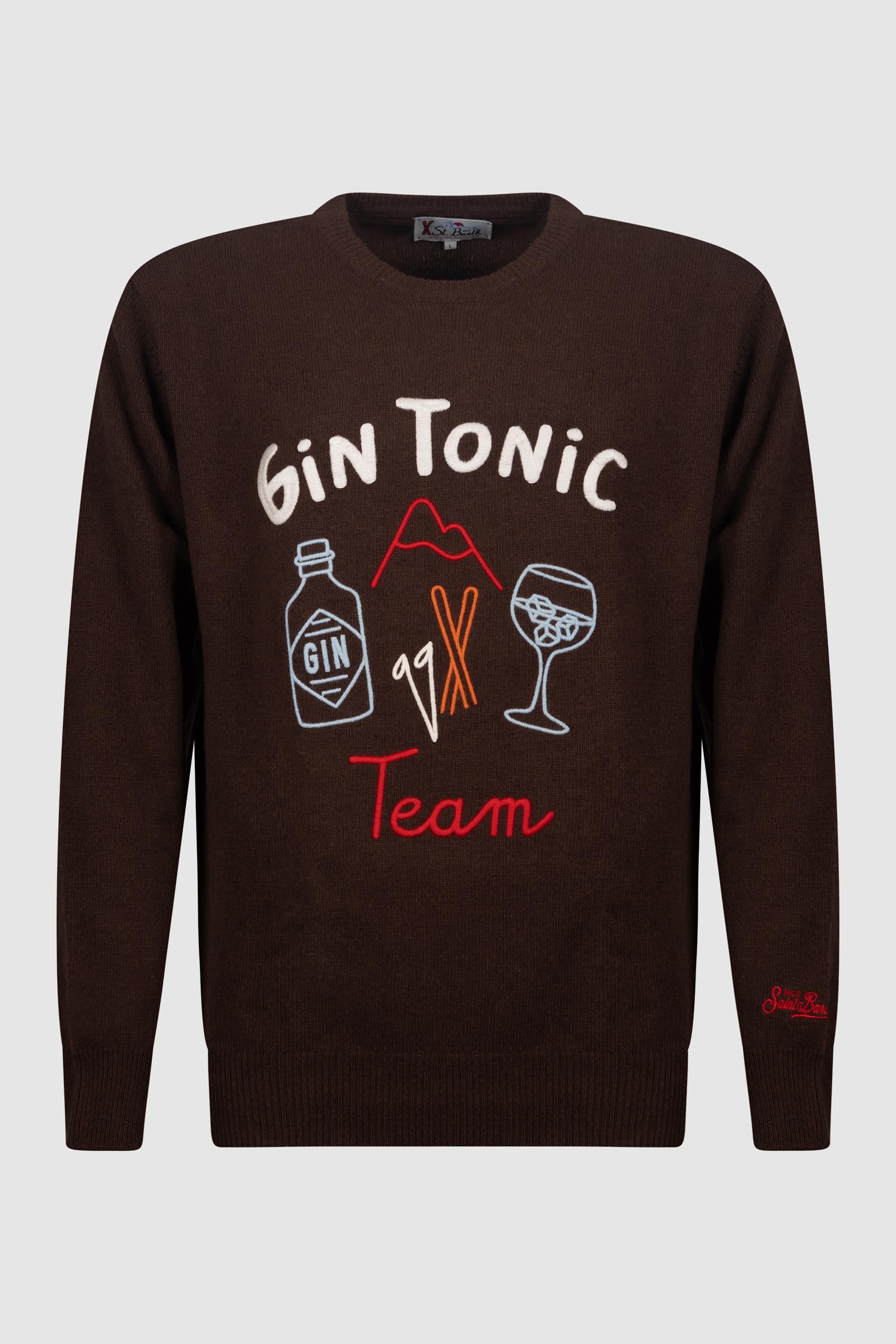 Divertente, originale e perfettamente in stile St. Barth, il maglione "Gin Tonic Team" è il capo perfetto per chi ama unire comfort e ironia. Realizzato in una morbida maglia color marrone scuro, presenta sul davanti una grafica ricamata con scritta bianca e rossa, bottiglia di gin e bicchiere, per un look unico e disinvolto.