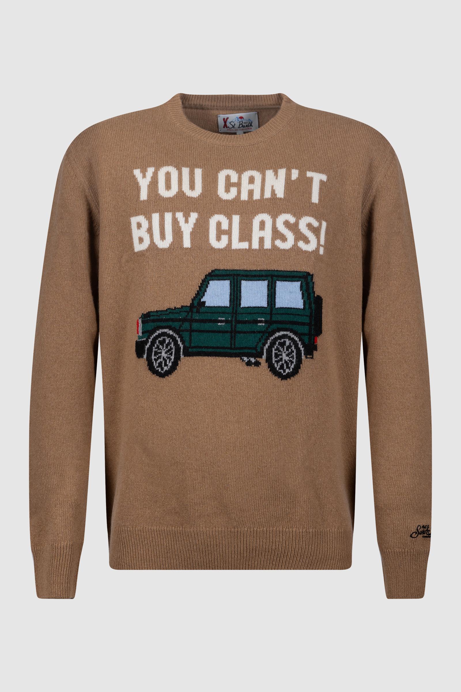 Con il suo stile ironico e distintivo, il maglione "You Can't Buy Class!" firmato St. Barth è il capo perfetto per chi ama distinguersi con un tocco di umorismo e personalità. Realizzato in morbida maglia color cammello, presenta una grafica jacquard con scritta in bianco e un'auto verde sul davanti, per un look originale e di carattere.