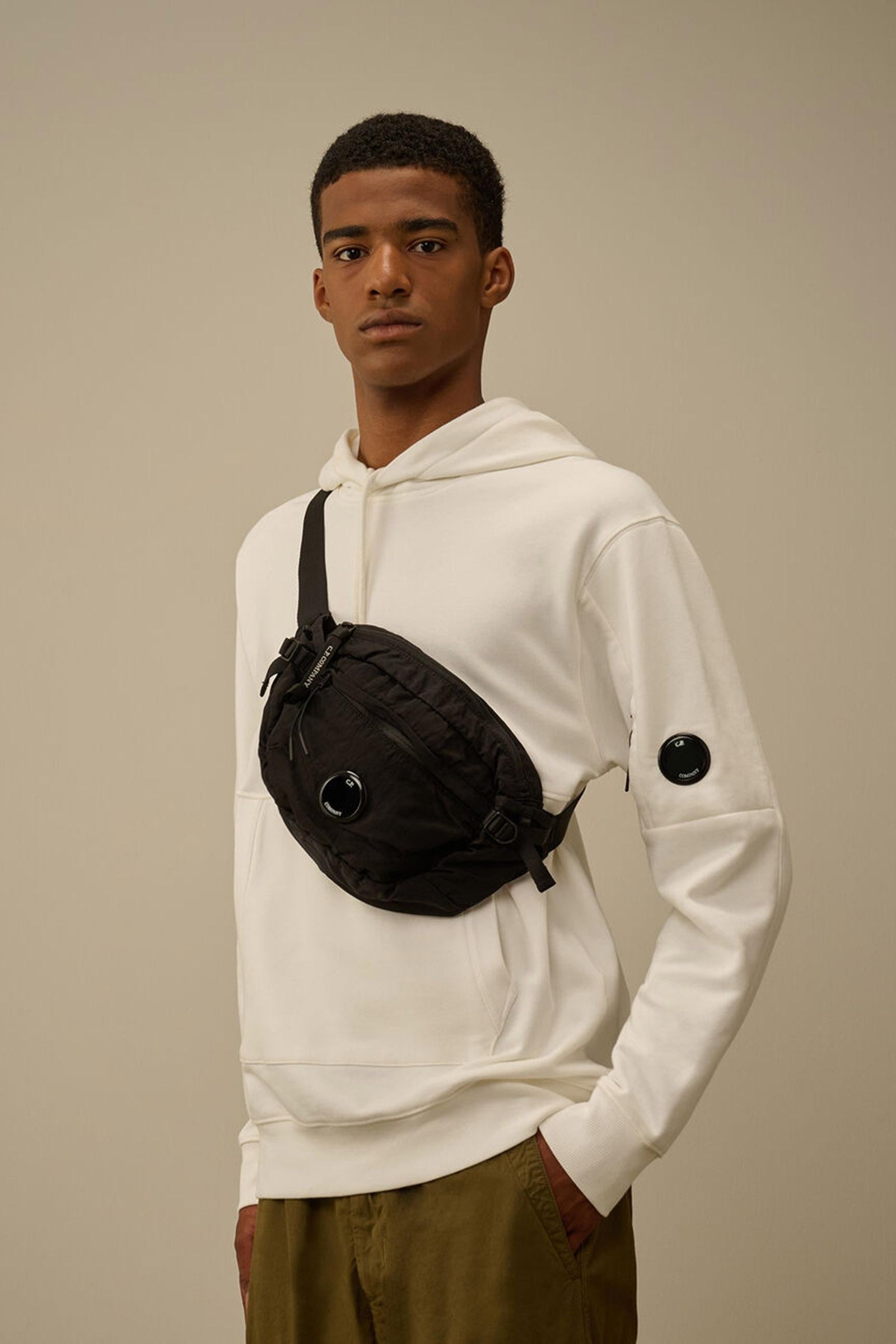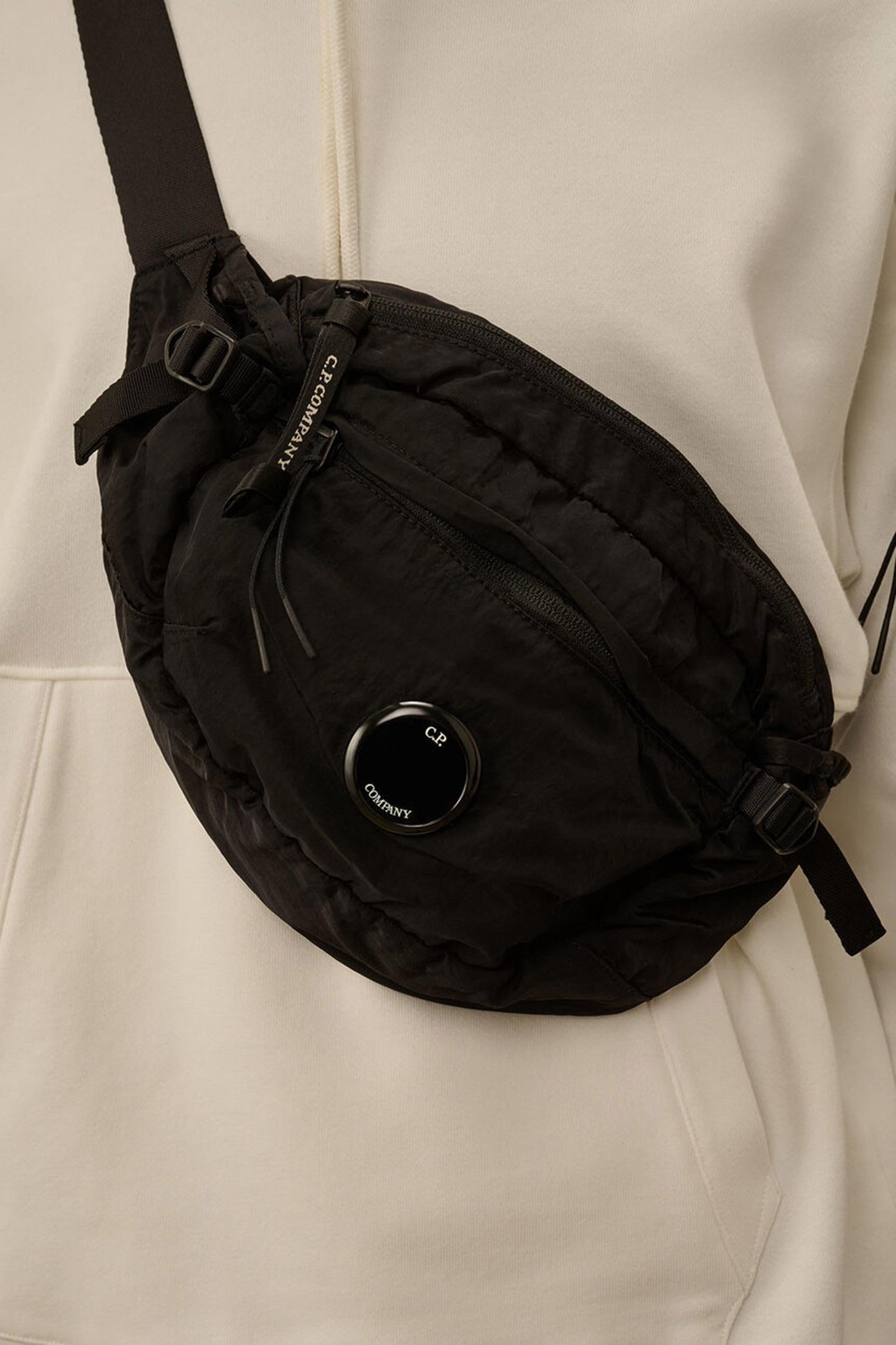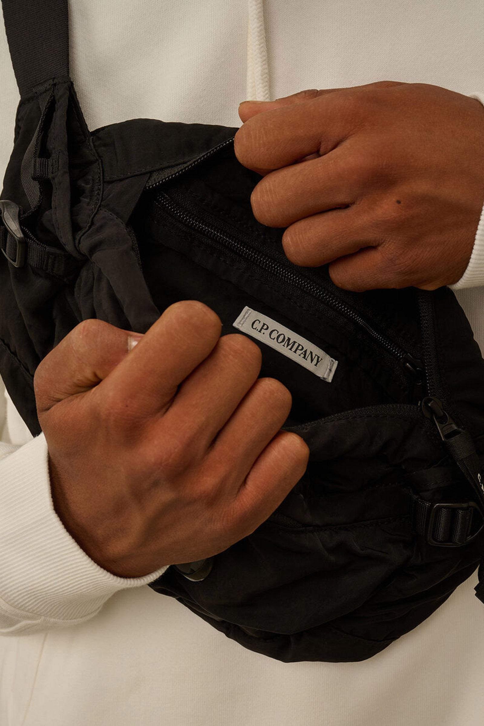 Marsupio a tracolla realizzato in Nylon B, un nylon multi-filamento raso di ispirazione militare. È dotata di una tracolla regolabile con fibbia, impugnatura e tasche esterne con zip. All'interno, una tasca zip e logo. Rifinito con l'iconica lente di C.P. Company. Tinto in capo e trattato antigoccia.