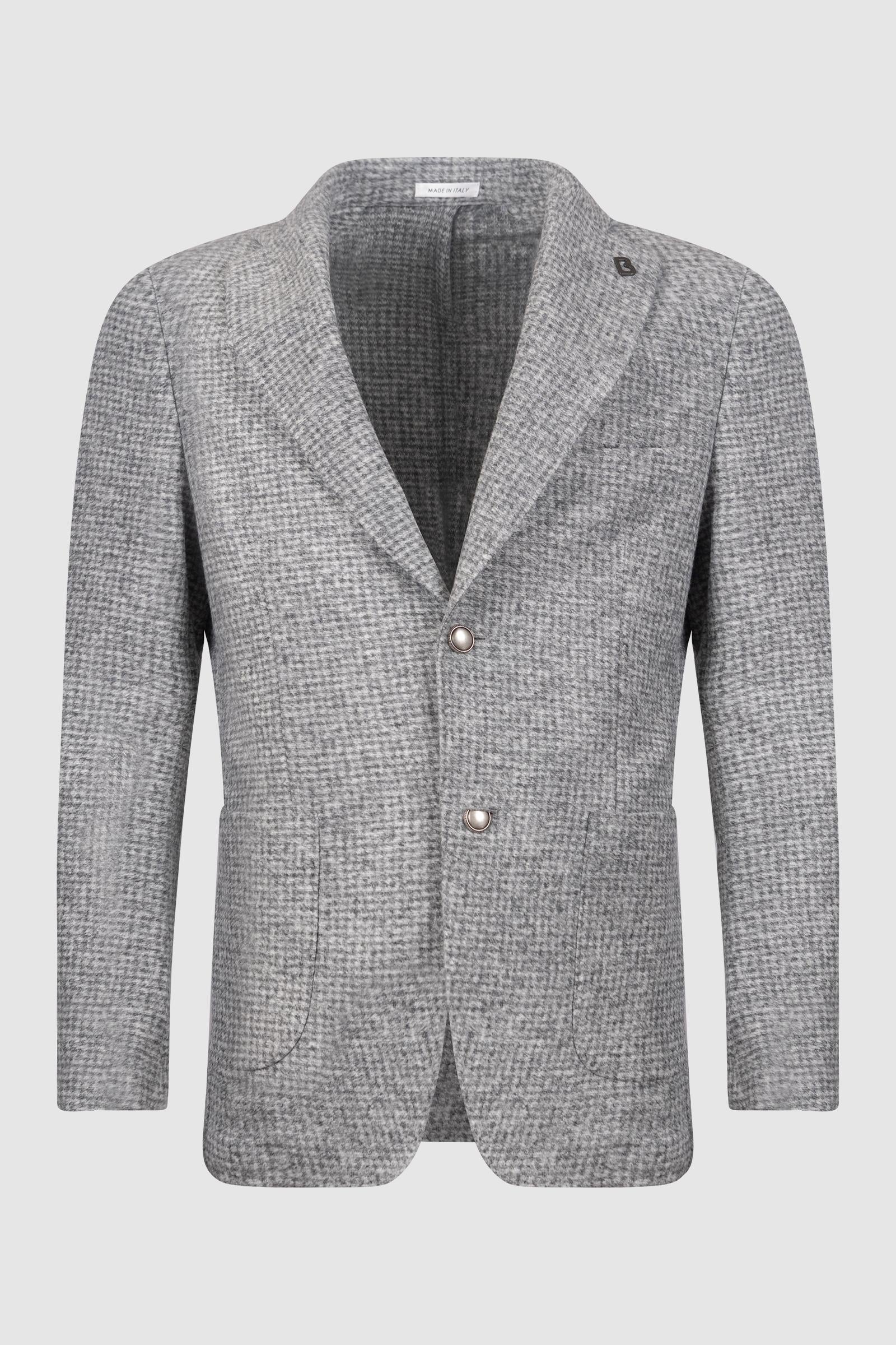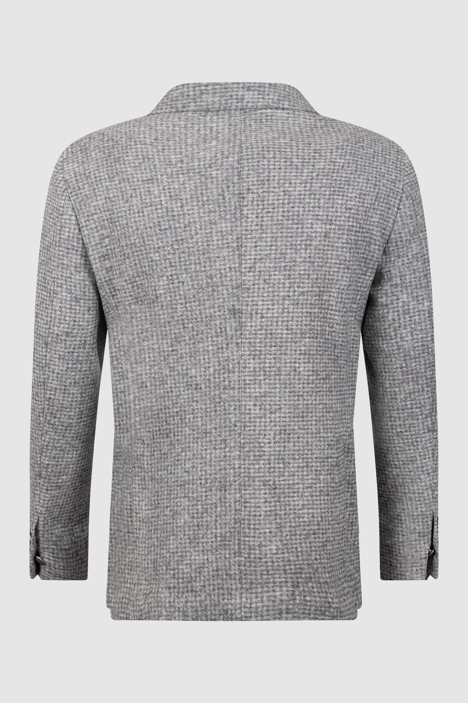 Giacca Breras realizzata in lana italiana con lavorazione a micro pied de poule, dal taglio monopetto con due bottoni.