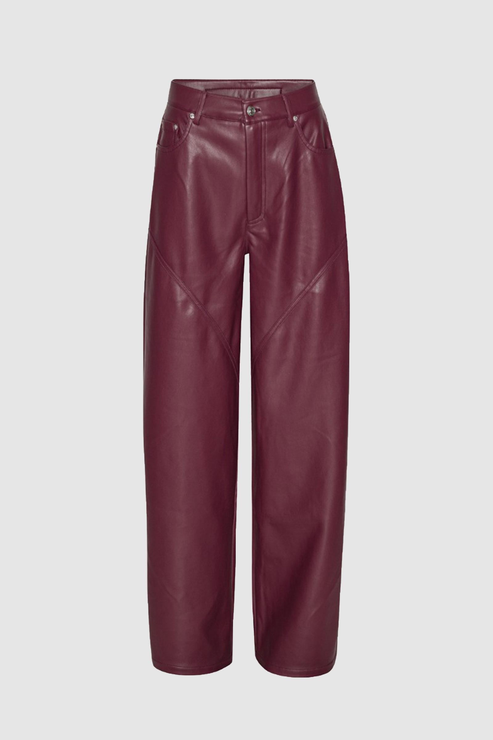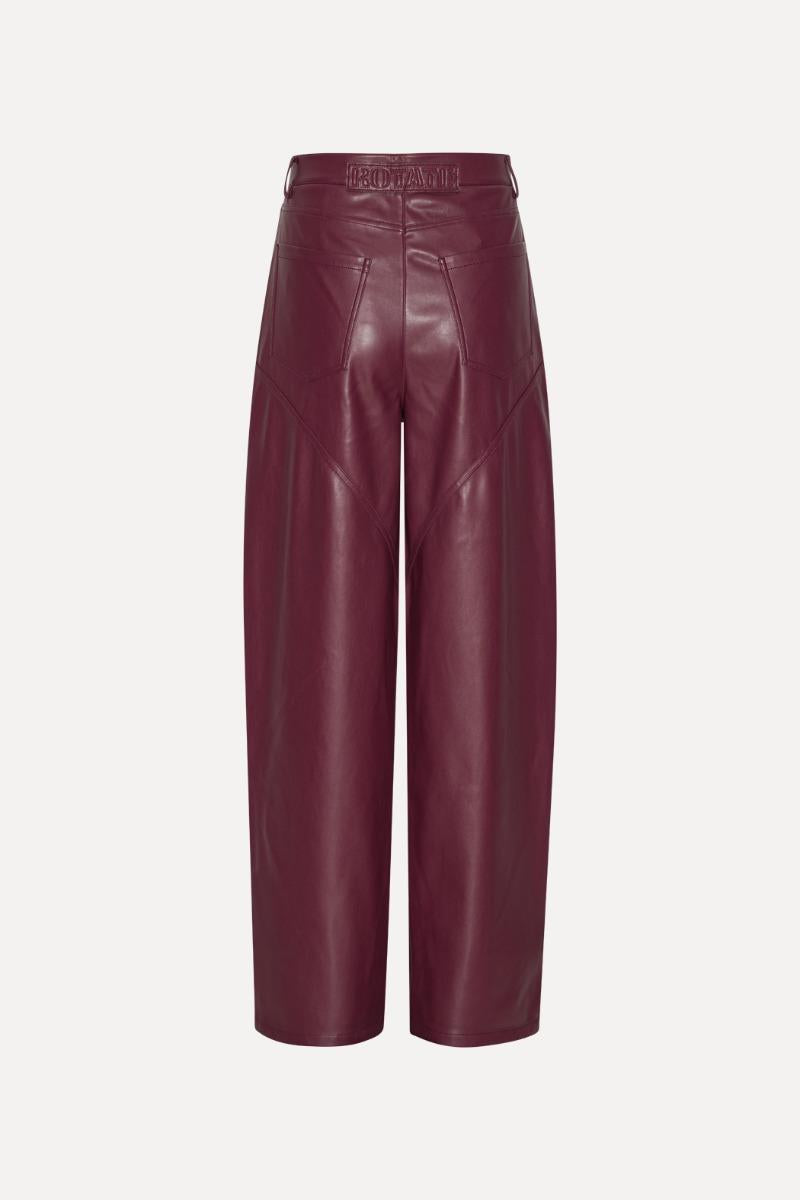 I pantaloni a vita media con piping bordeaux presentano una vita media strutturata con passanti per cintura e chiusura con bottone. La silhouette a gamba larga è definita da dettagli piping curvi che corrono lungo il davanti e il dietro. Il classico stile a cinque tasche include due tasche anteriori arrotondate, un taschino portamonete e due tasche posteriori applicate. Una patch con logo in rilievo sulla cintura posteriore completa il design. Composizione 1: 100% poliestere (riciclato) - Composizione 2: 100% poliuretano - Fodera: 92% poliestere 8% elastan.