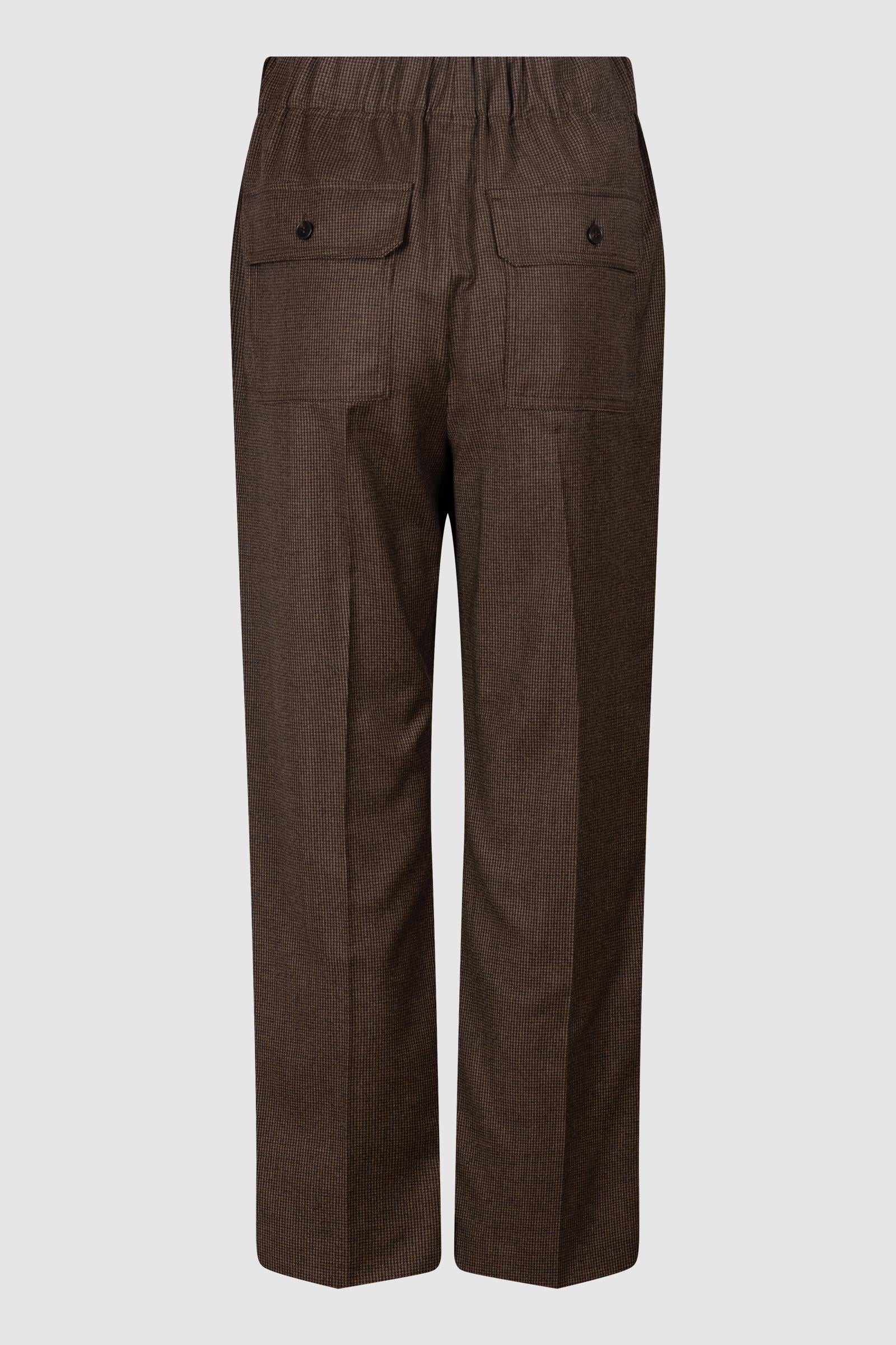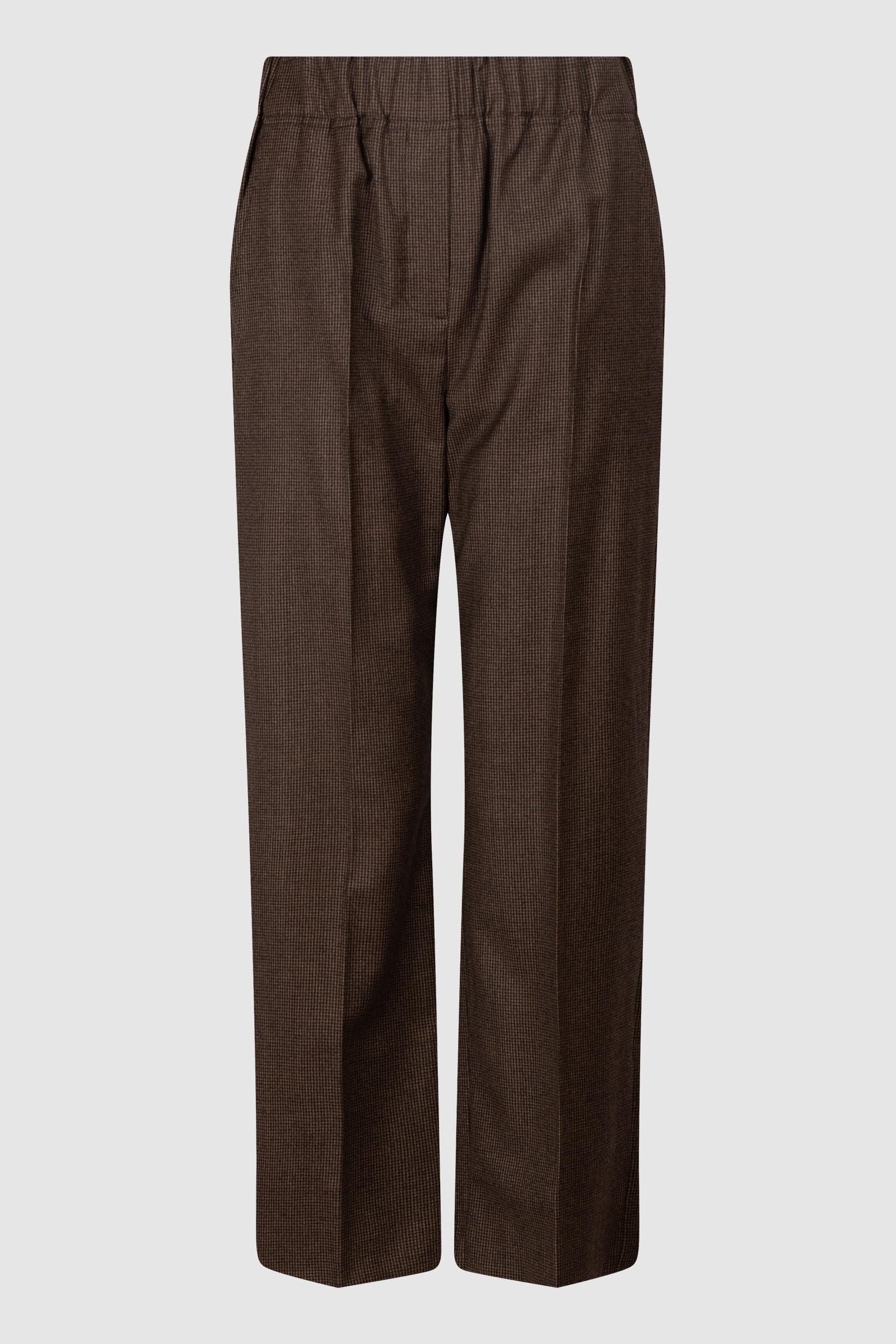 Pantaloni Max Mara realizzati in tessuto di lana marrone con micro-fantasia check. Modello a vita media con elastico in cintura, linea dritta e piega stirata frontale per uno stile elegante e versatile.