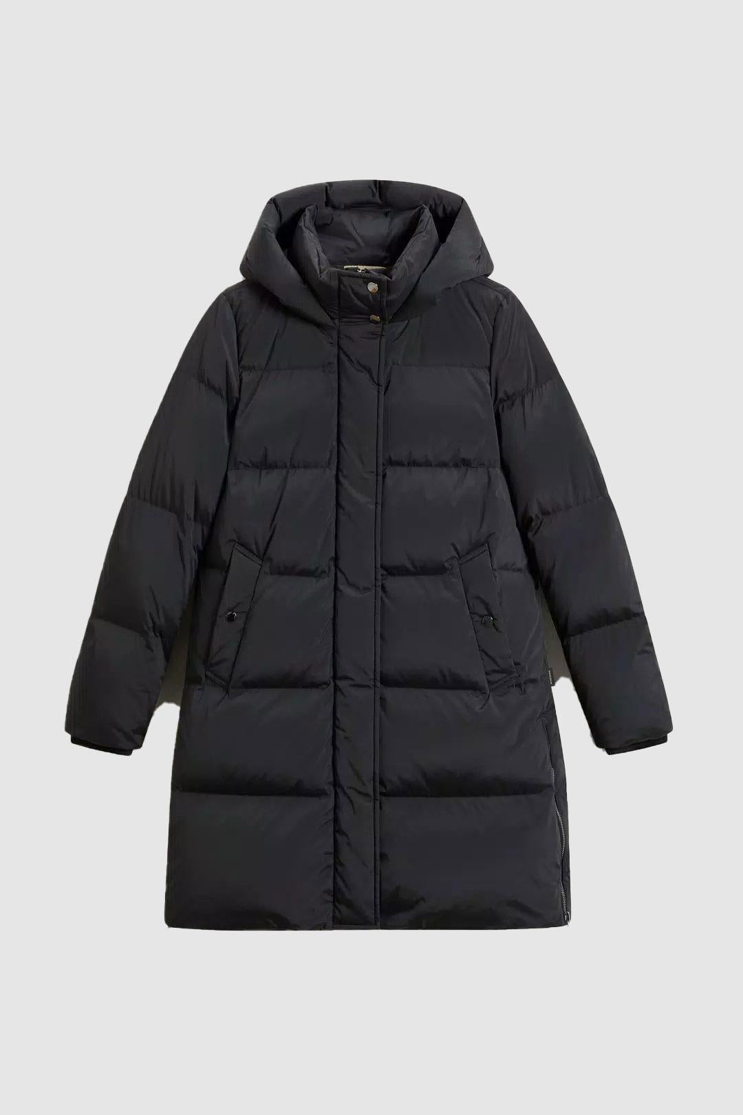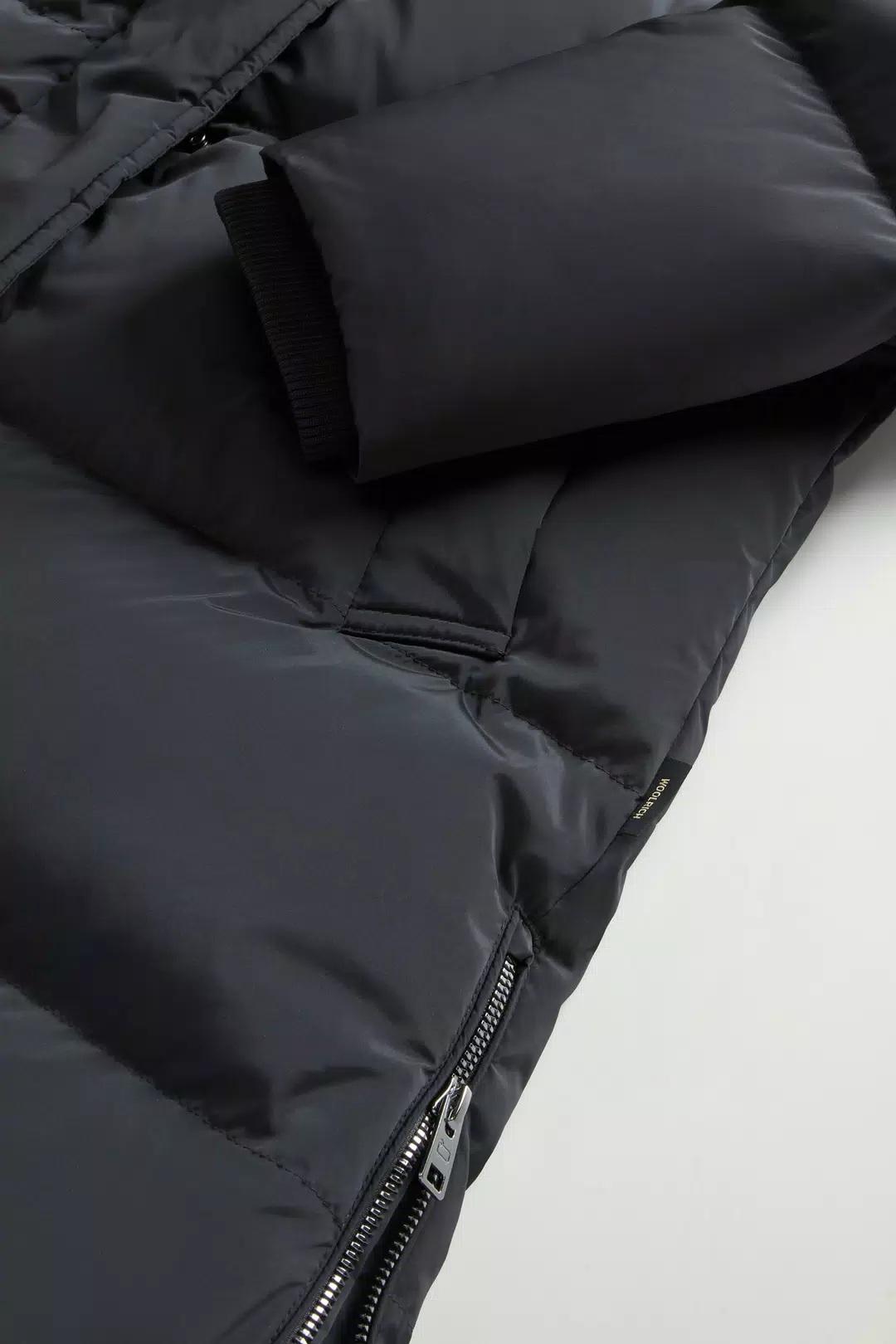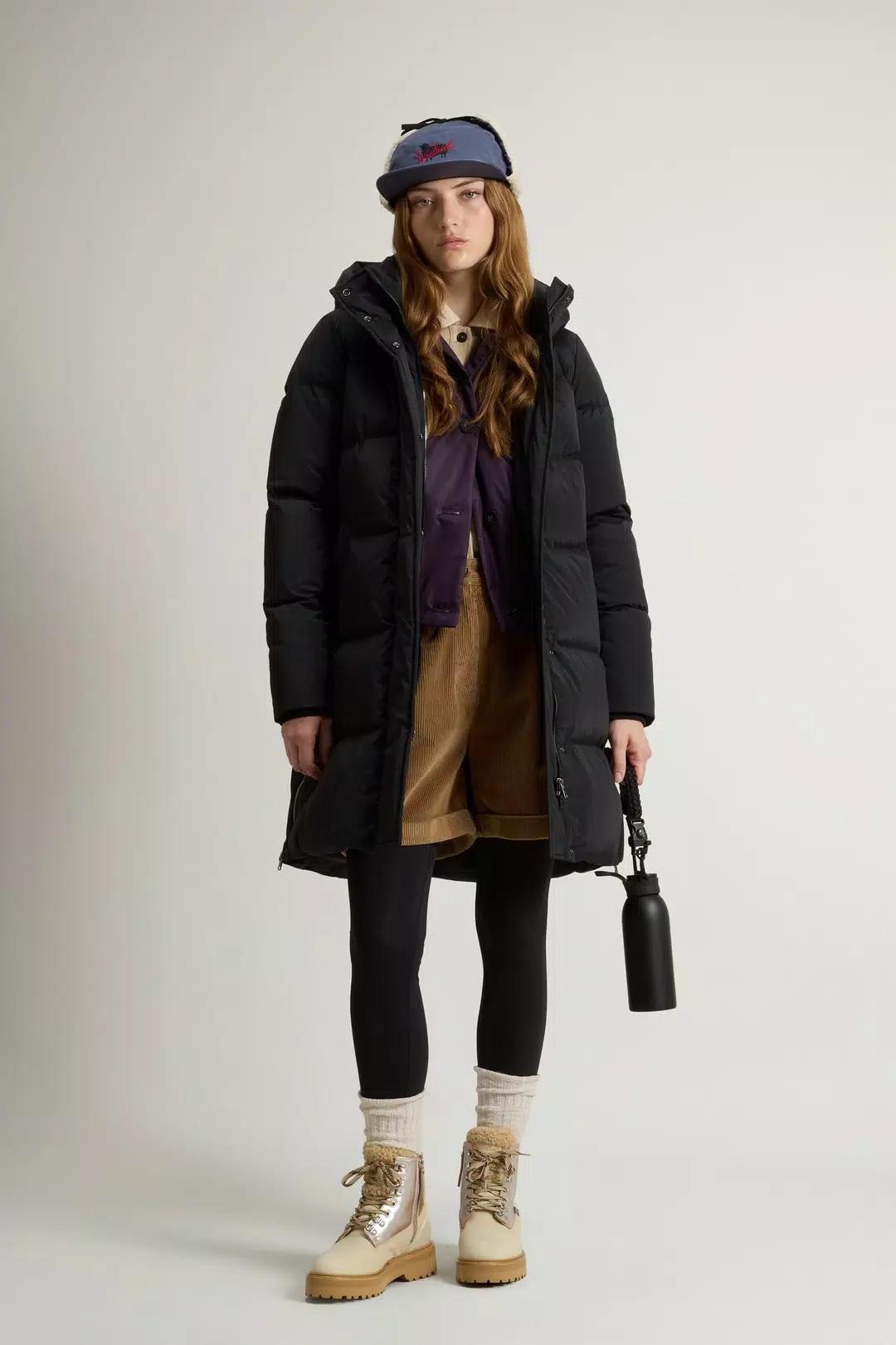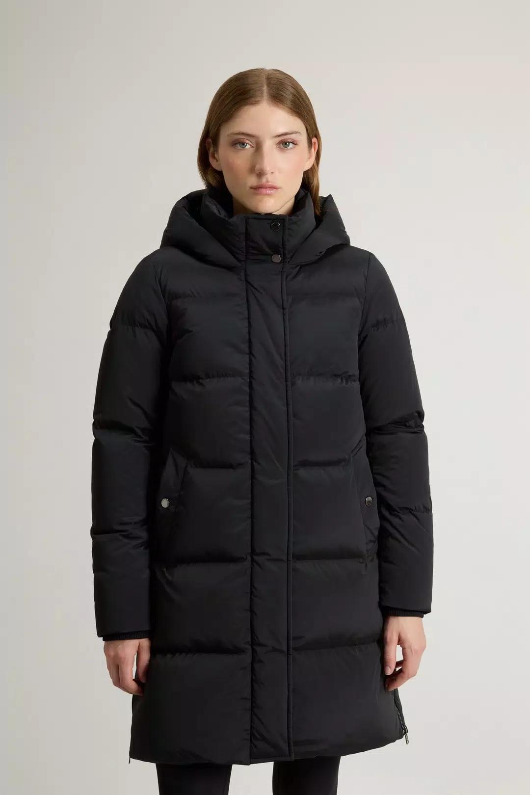 Un capo avvolgente che ti garantisce protezione e comfort nelle giornate fredde. Questo piumino è realizzato in morbido nylon elasticizzato, resistente al vento e trattato con una finitura idrorepellente. L'imbottitura in piuma d'anatra garantisce calore e leggerezza, ideale per affrontare l'inverno con il massimo comfort. Il modello è dotato di cappuccio e collo alto con bottoni a pressione per una maggiore protezione, chiusura frontale con zip e bottoni a pressione nascosti, tasche a filetto con chiusura a pressione e una pratica tasca interna. I polsini a costine nascosti aiutano a trattenere il calore, mentre gli spacchi laterali con zip offrono maggiore libertà di movimento.Realizzato in tessuto Premium Down