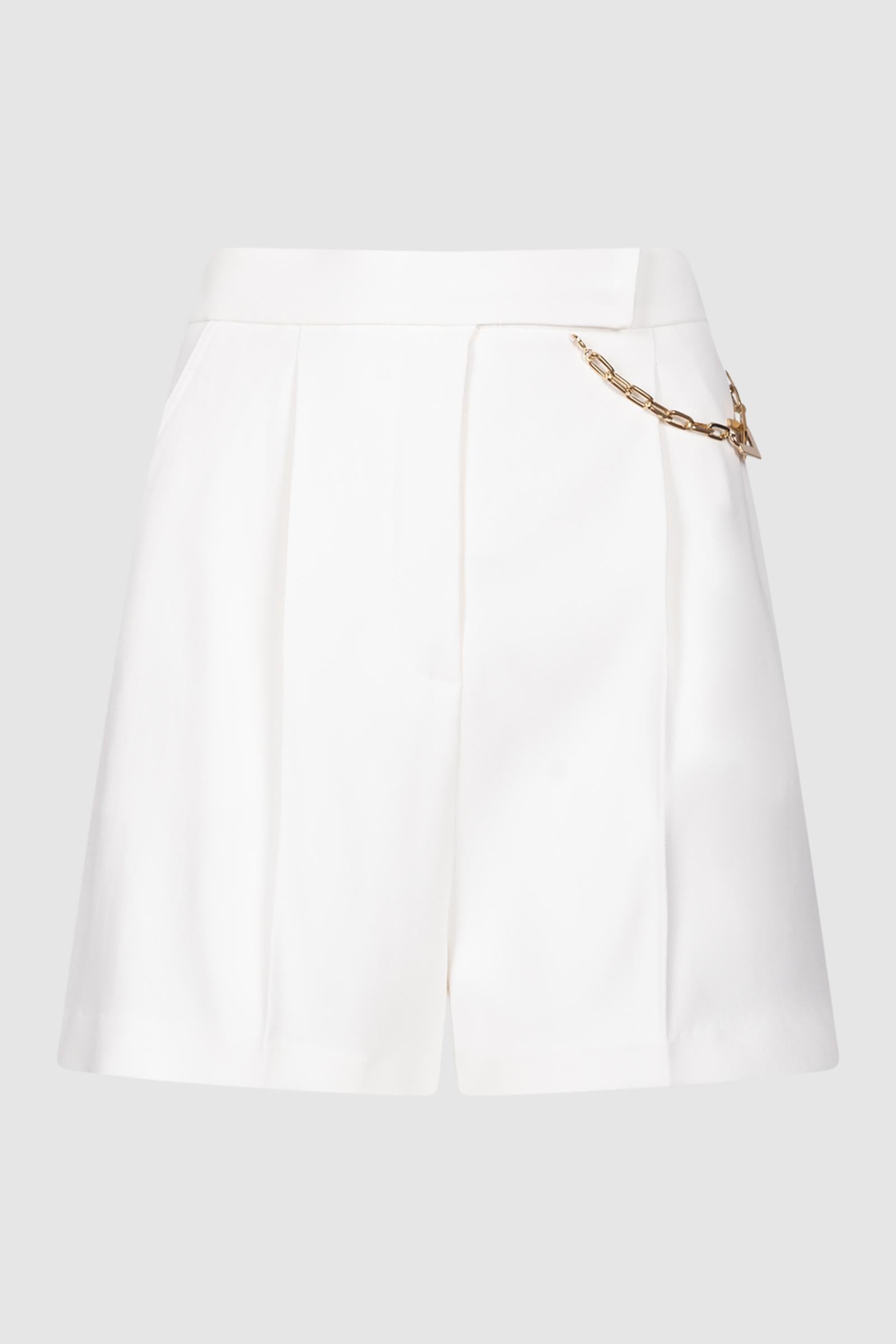 Shorts in gabardina con tasche alla francese e filetti sul retro. Sono impreziositi dal dettaglio gioiello della catenella con logo in metallo dorato, a brillare su un fianco. Vestibilità regular.Accessorio in metallo dorato con logo