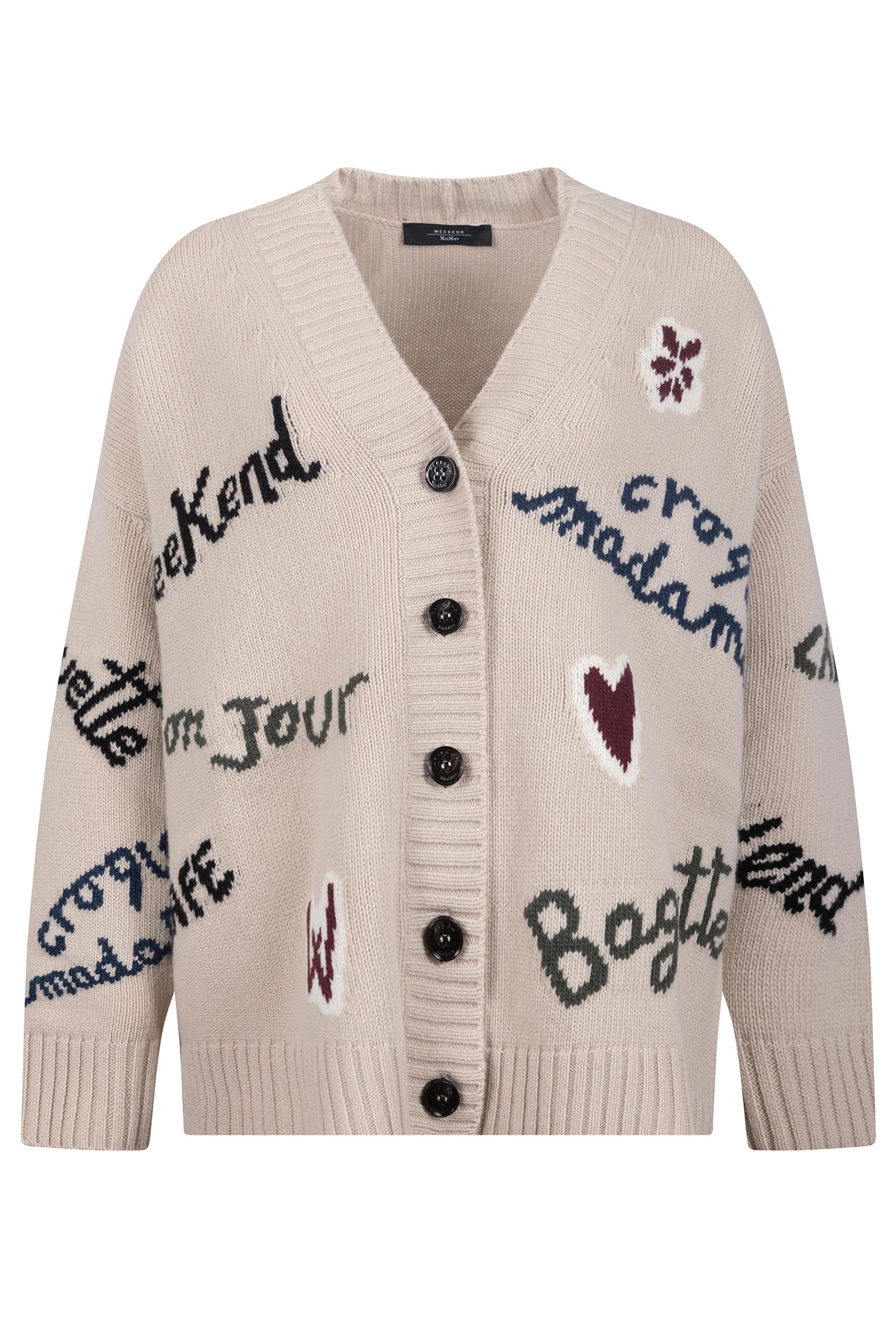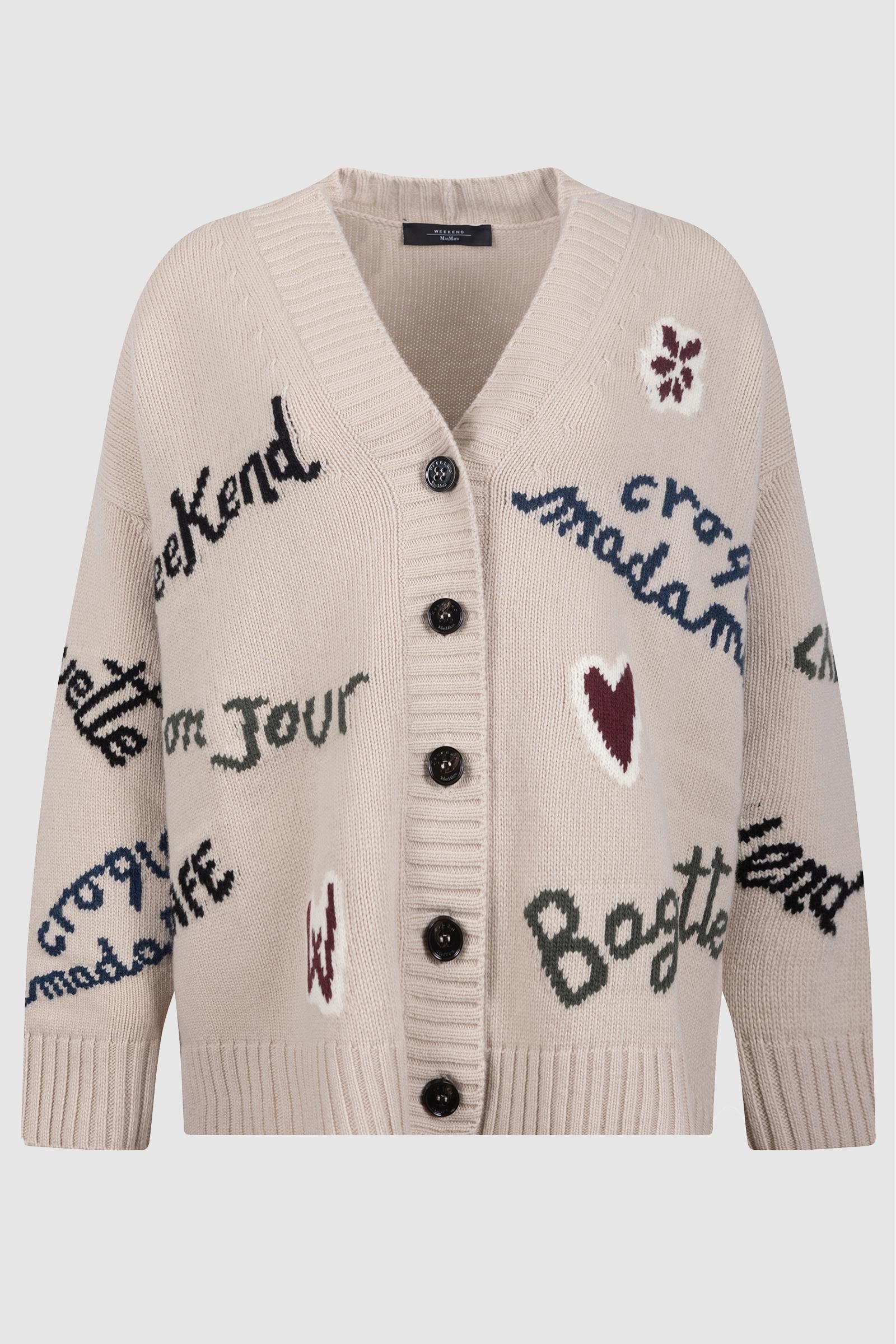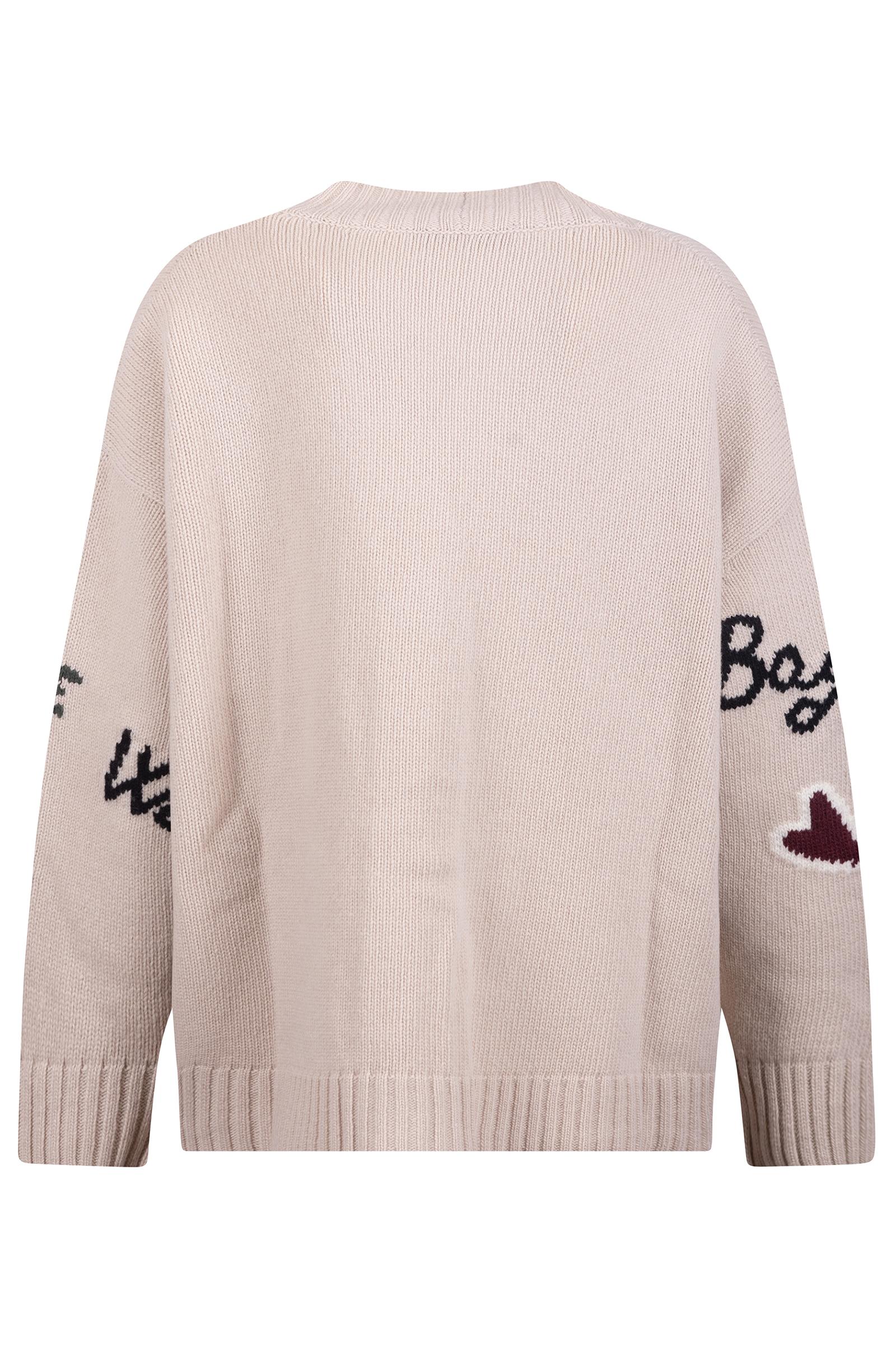 Dettagli artigianali: lavorazione in maglia intarsiata decorata con scritte e motivi grafici, che arricchiscono il capo con personalità e modernità.