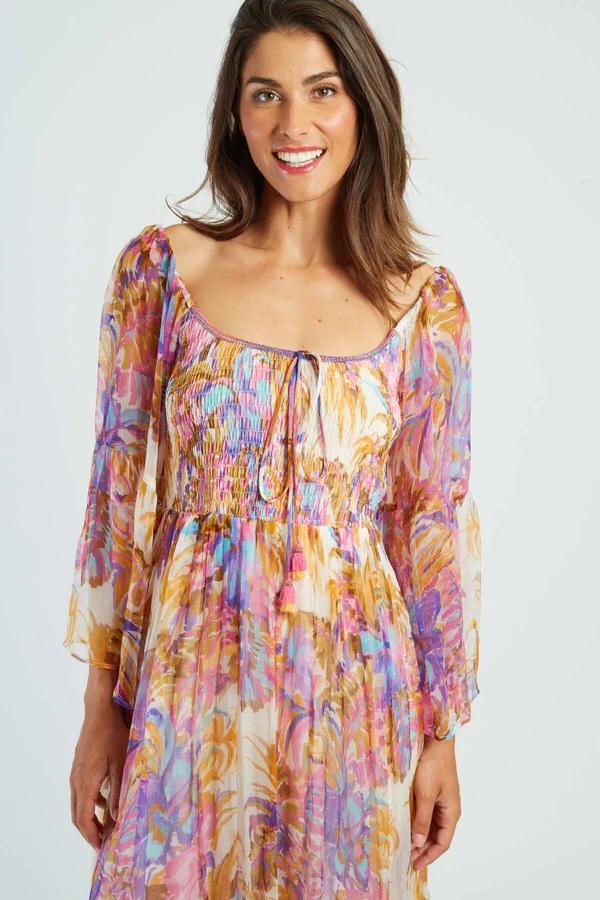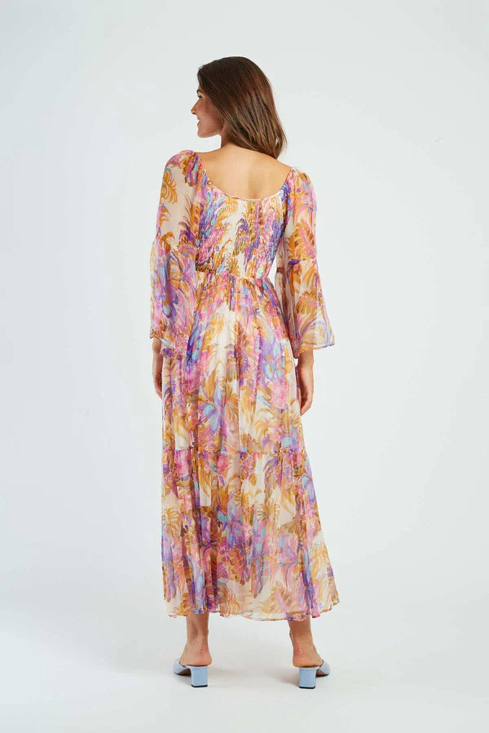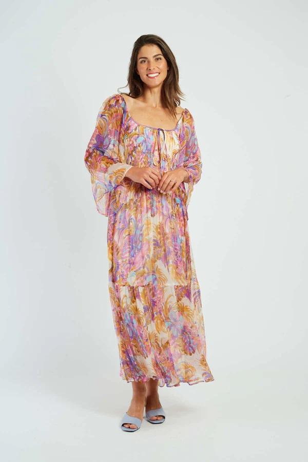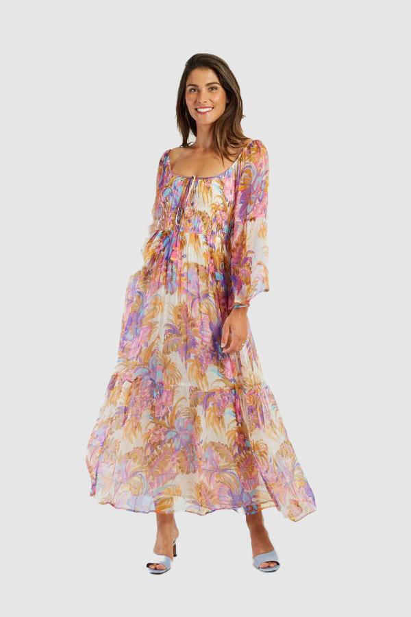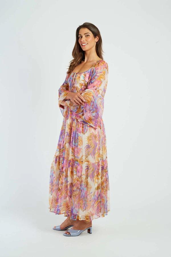 Abito lungo con maniche a tre quarti svasate. Scollo quadrato. Stampa floreale e vestibilità comoda. Tessuto fluido e leggero. Silhouette bohémien e femminile. Questo capo estivo unisce comfort ed eleganza per un look rilassato ma chic.