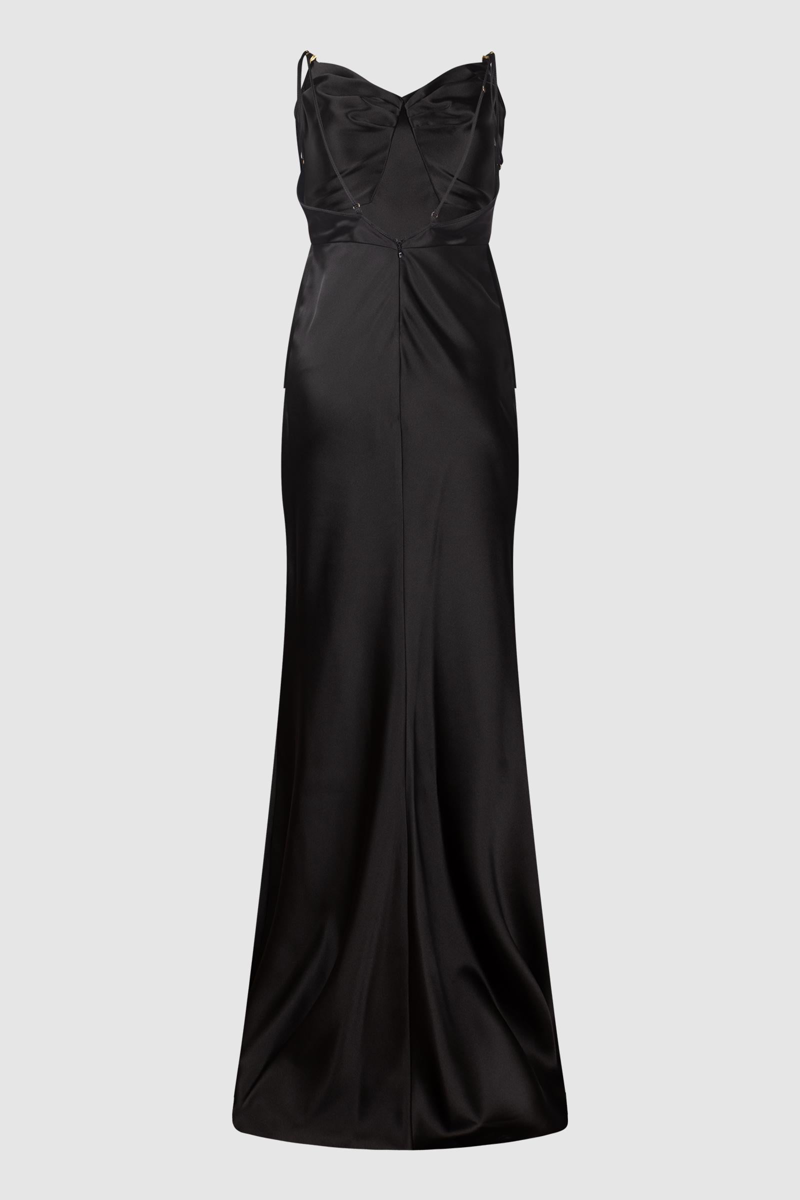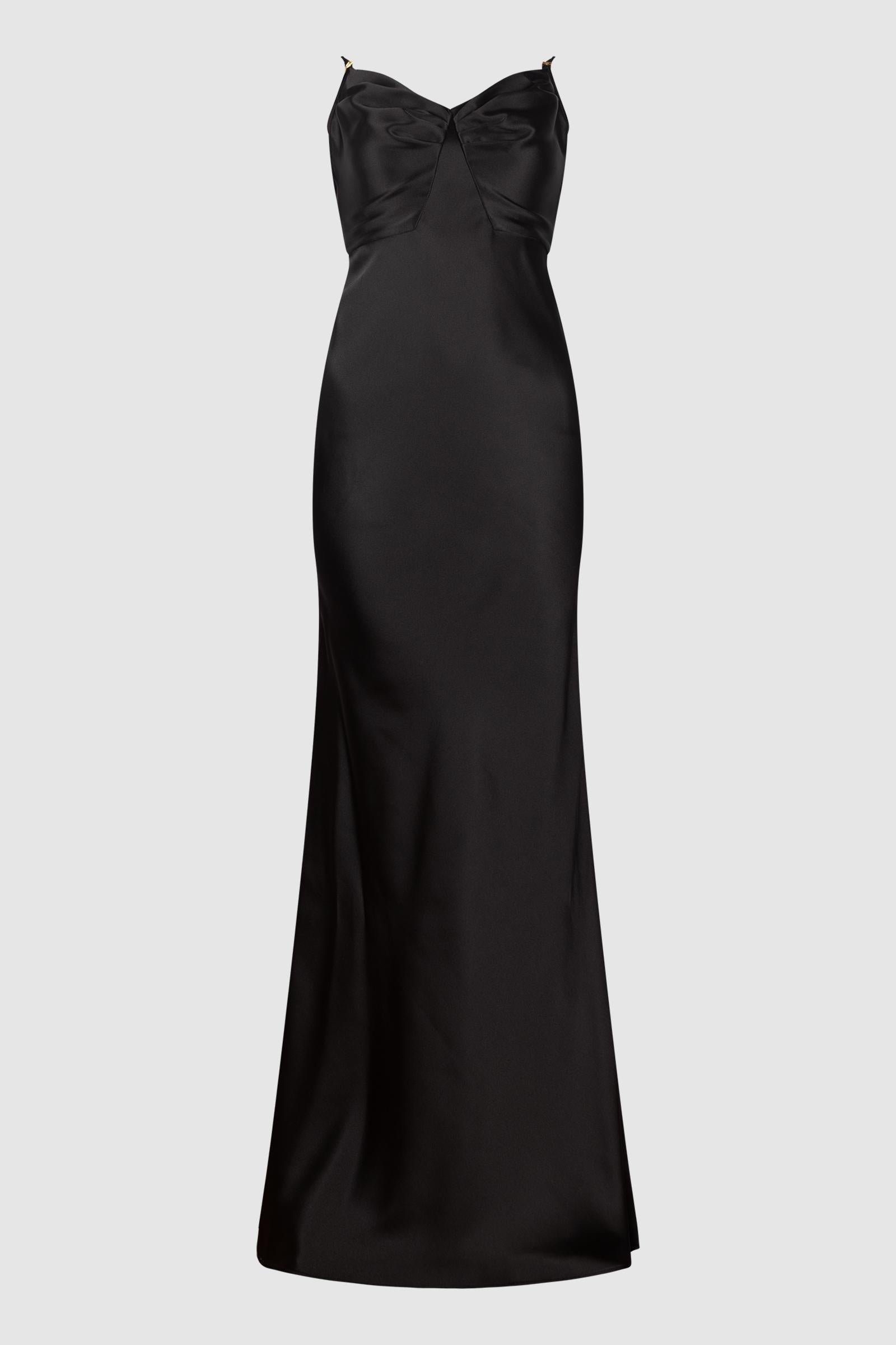 Abito da sera in raso dalla vestibilità slim. Il vestito ha doppie spalline, trattenute dal dettaglio in metallo dorato con logo. Si distingue per le coppe ingentilite da motivi di arricciatura e per la gonna lunga con coda a sirena, per una silhouette d'impatto.Fodera in georgette