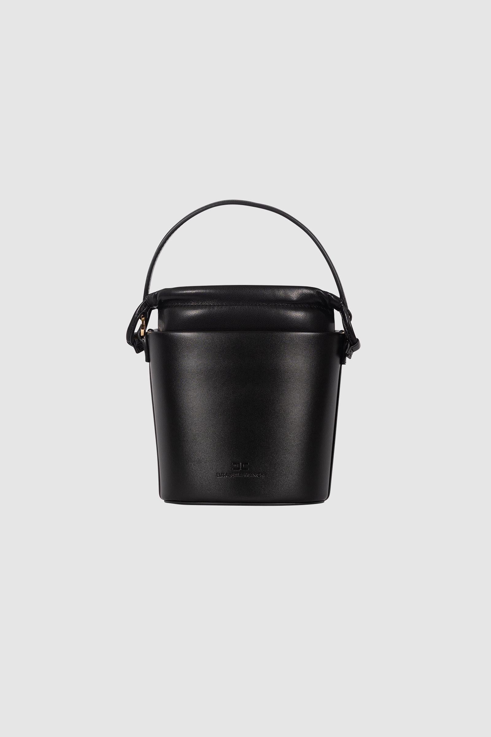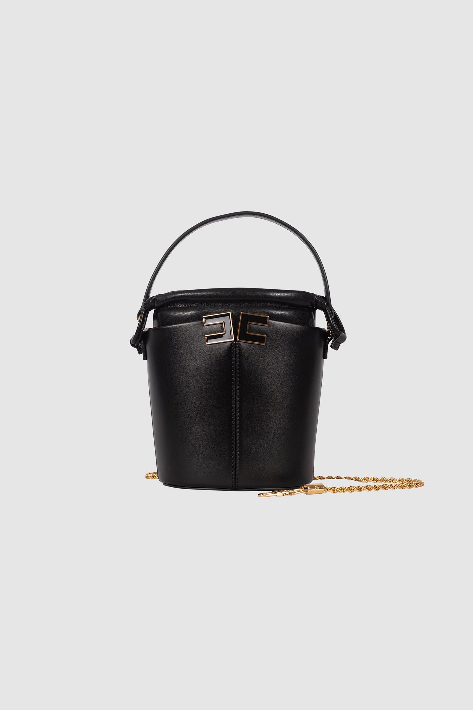Borsa con design a secchiello. Si caratterizza per il taglio a V sul davanti impreziosito dal logo in metallo dorato e smaltato internamente. Presenta manico, tracolla amovibile e chiusura a sacchetto.Dettaglio in metallo dorato con logo