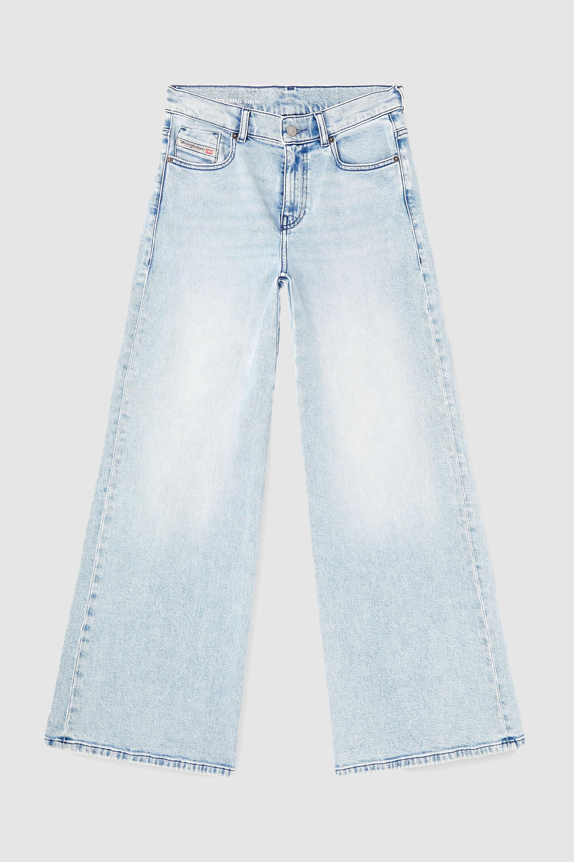 Vestibilità svasata con vita media e gamba ampia. La silhouette senza tempo è aderente in vita e si ammorbidisce dalla coscia alla caviglia. Parte della selezione DNA di Diesel, è realizzato in denim elasticizzato con una percentuale di cotone biologico. Il lavaggio pulito in azzurro è fresco e infinitamente versatile. La modella indossa una taglia 26 ed è alta 175 cm / 5'7''