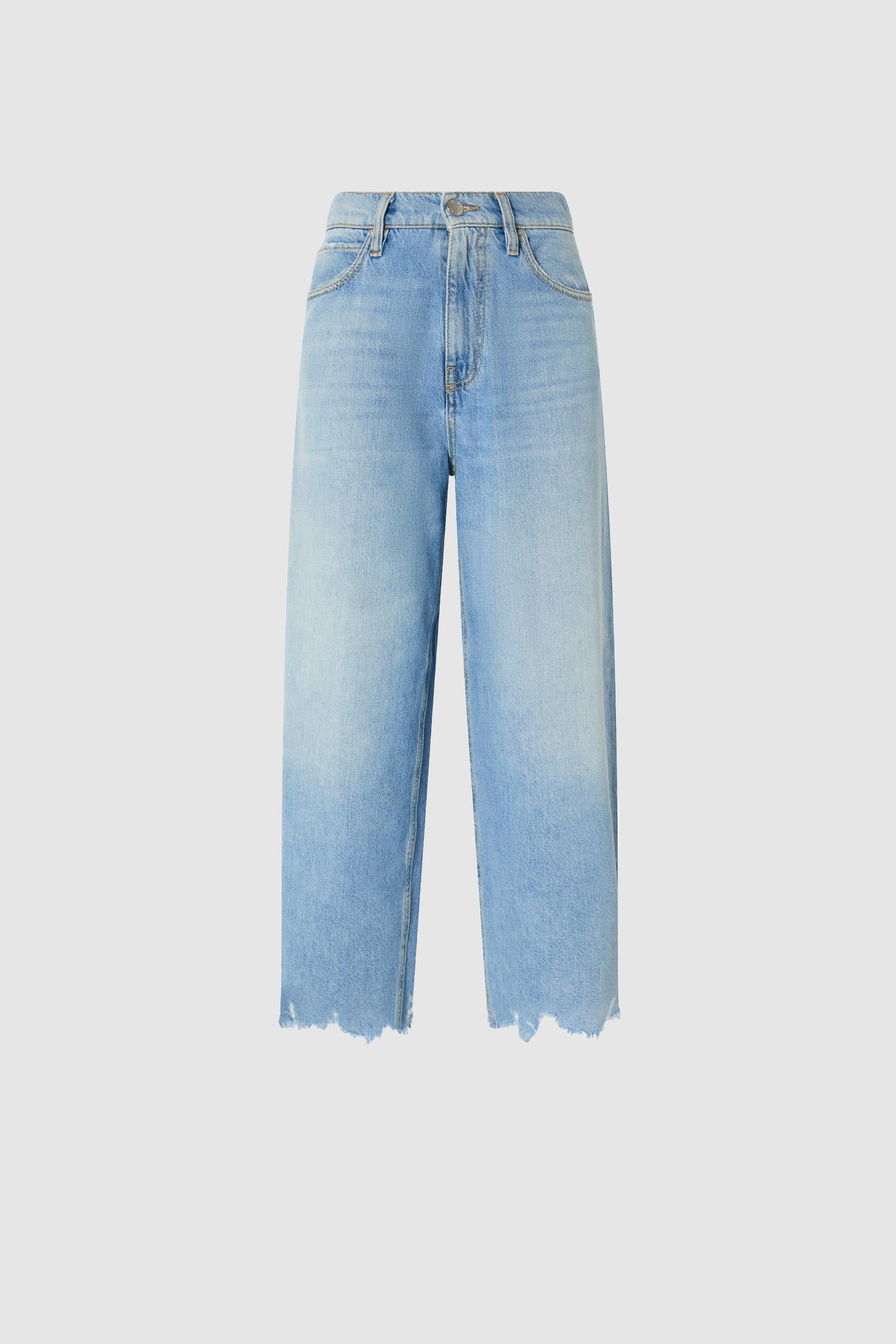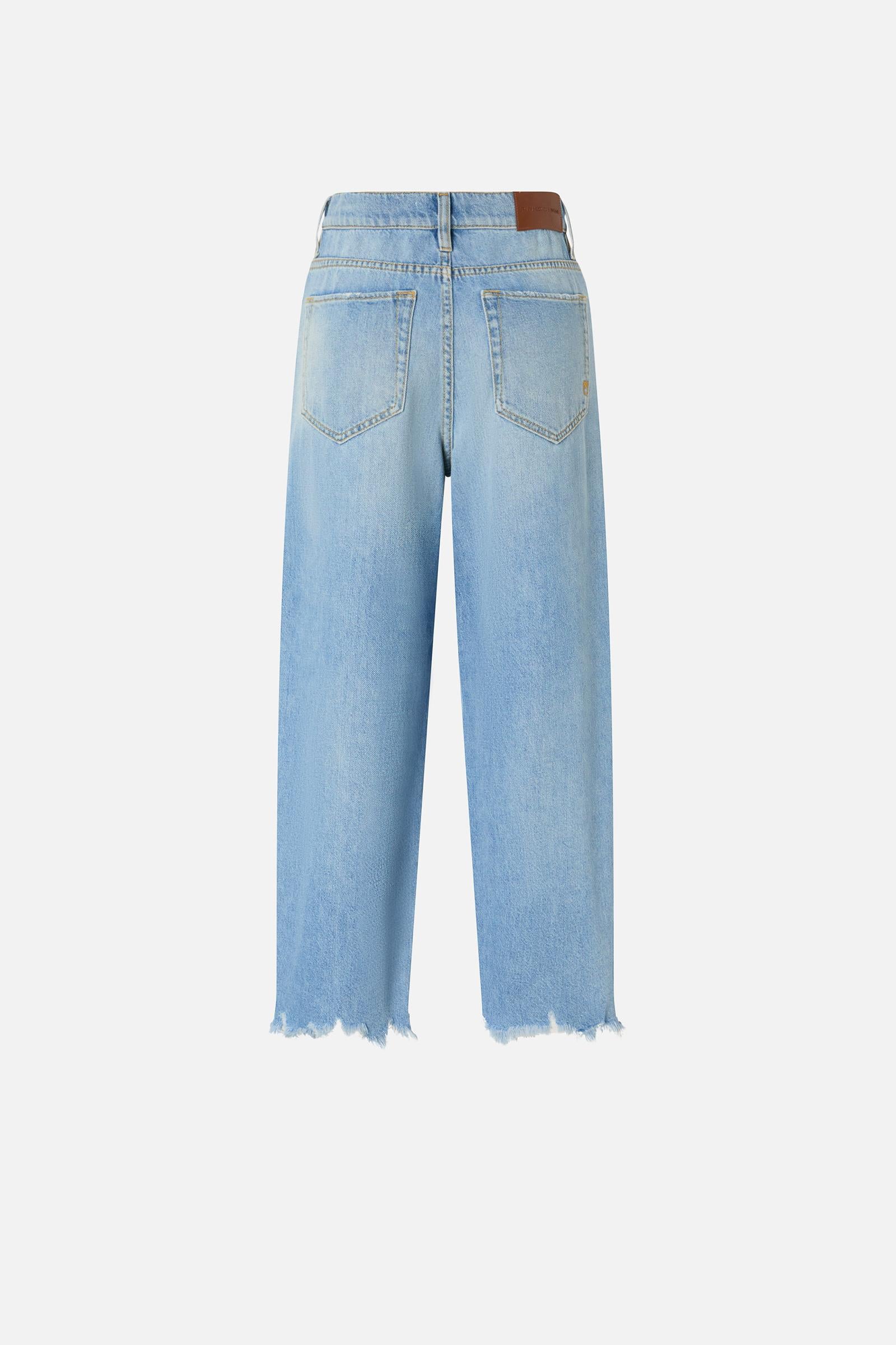 Jeans cinque tasche da donna dalla silhouette egg-fit realizzati in denim soft touch di misto cotone e lyocell dal lavaggio light wash, che dona al capo una tonalità chiara e contemporanea. La linea ampia e arrotondata della gamba di questi jeans è completata da fondo capo con orlo sfrangiato e irregolare, con rotture create ad hoc per un effetto vissuto. Vita regular con cavallo leggermente sceso, chiusura con zip e bottone a chiodo in metallo. La vestibilità di questi jeans balloon è estremamente di tendenza per questa stagione, ed è protagonista dei look quotidiani più cool.