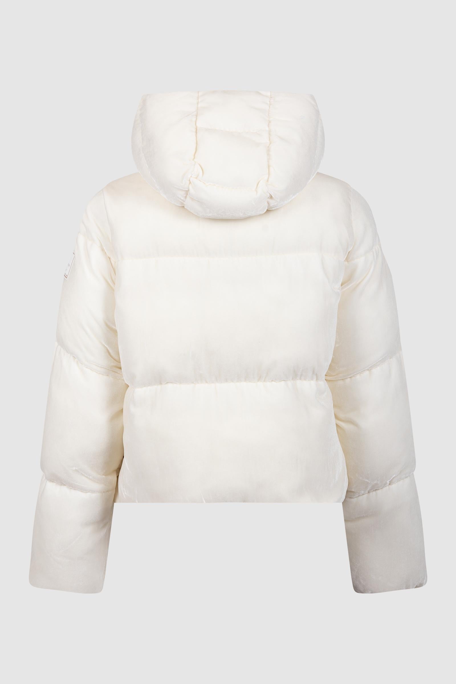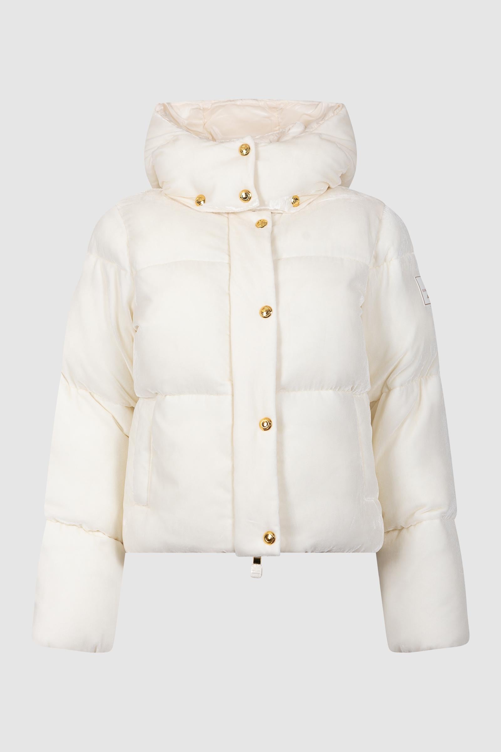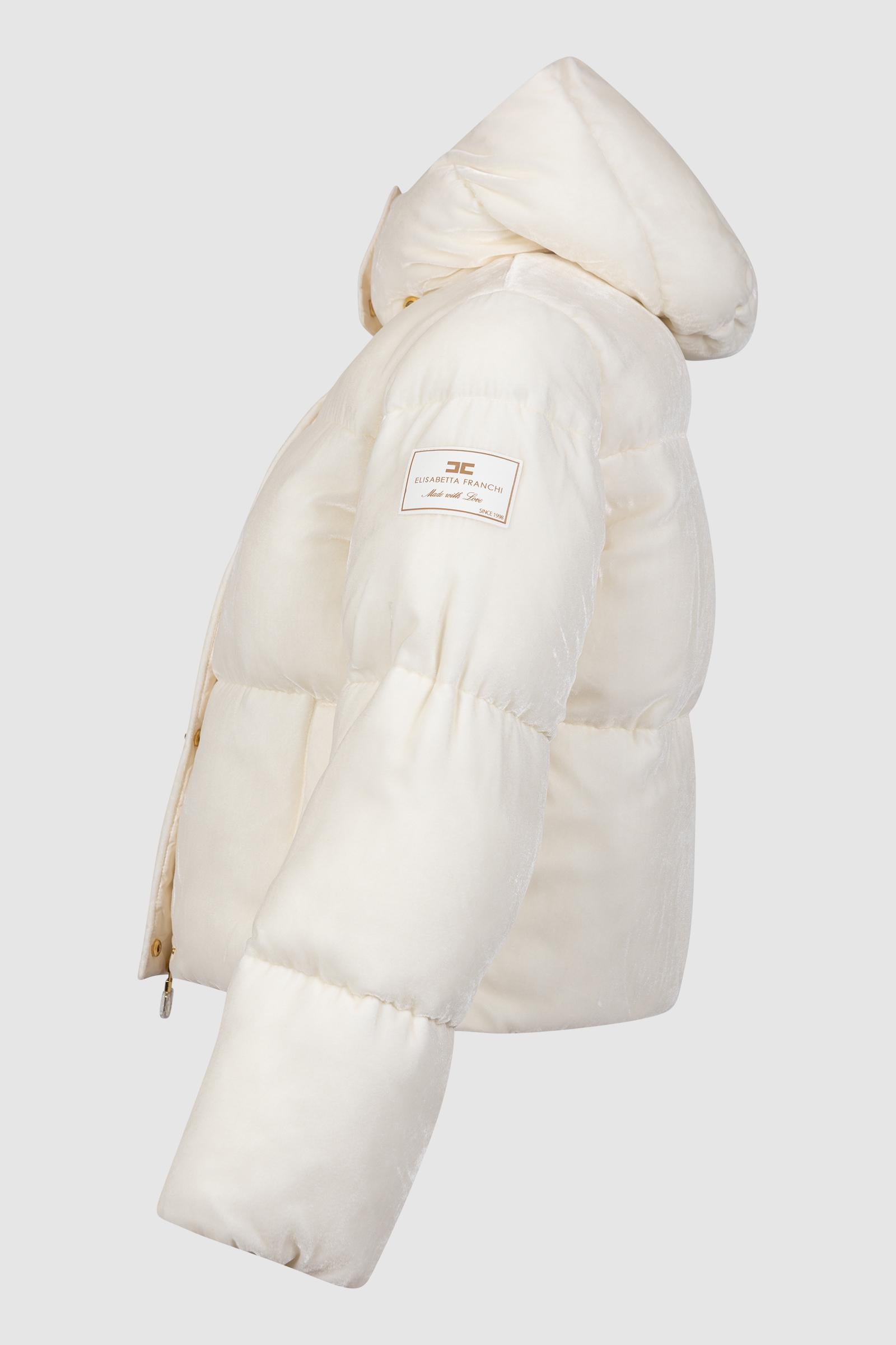 Piumino corto elegante firmato Elisabetta Franchi, realizzato in velluto bianco dal finish morbido e luminoso. Un capo raffinato e contemporaneo che coniuga il calore di un piumino con la femminilità senza tempo del velluto, impreziosito dai dettagli dorati iconici del brand.