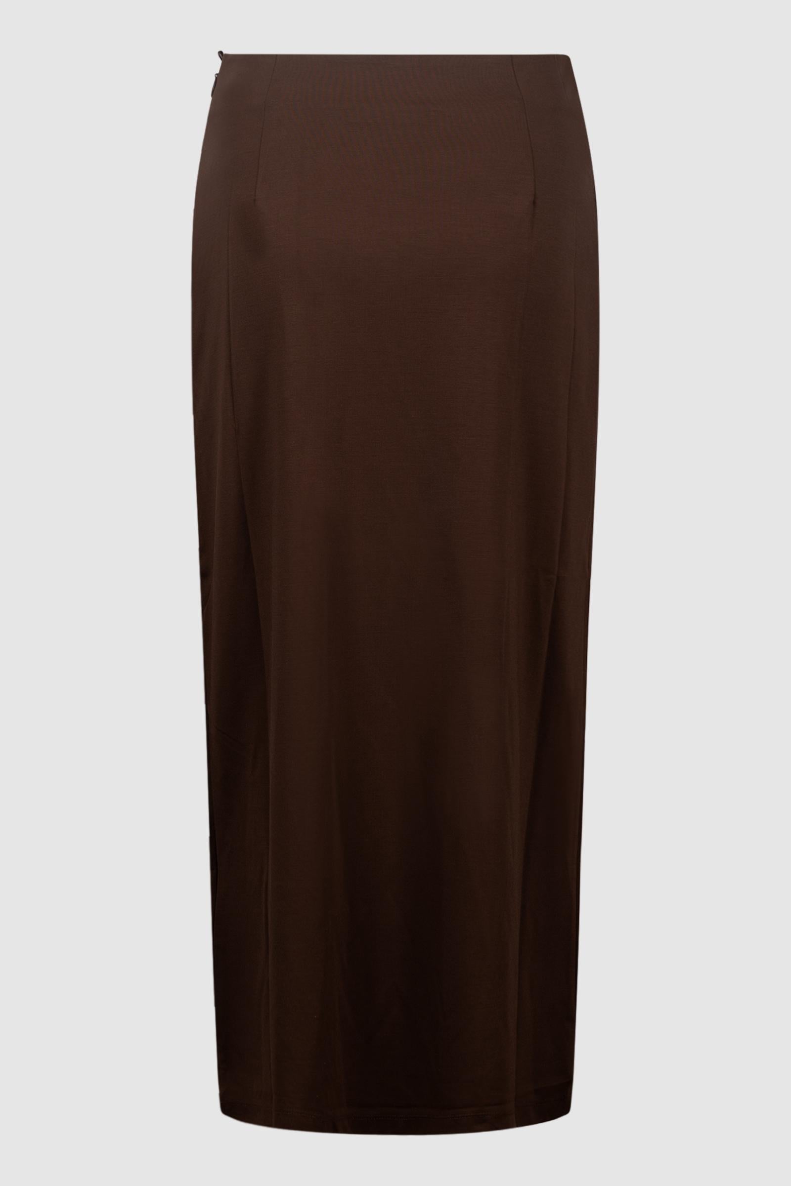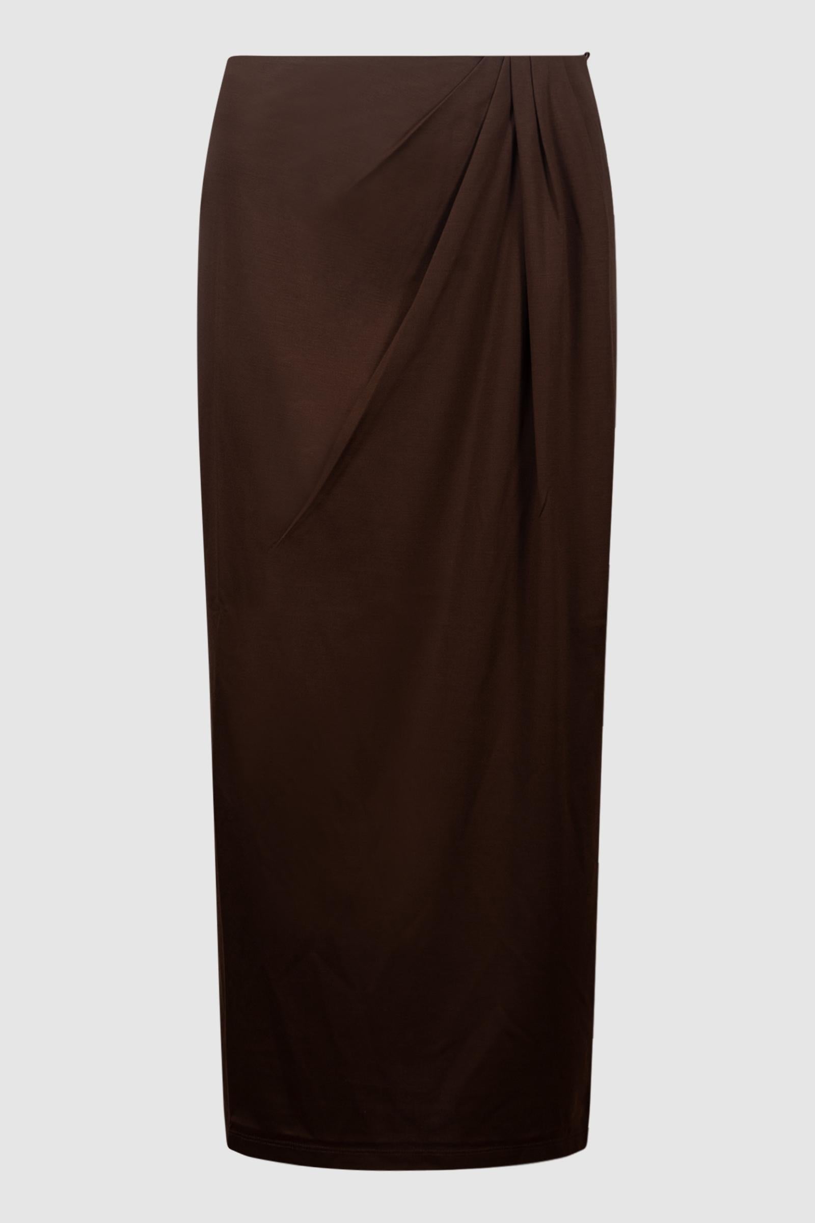 Gonna lunga con piega asimmetrica drappeggiata sul davanti, che dona movimento alla silhouette.