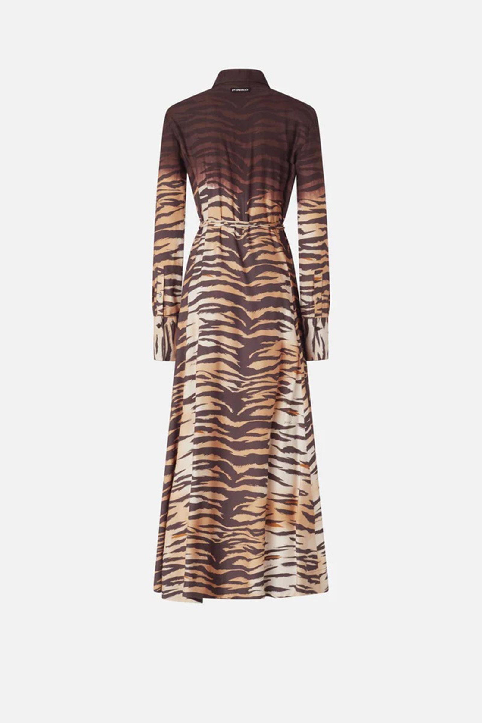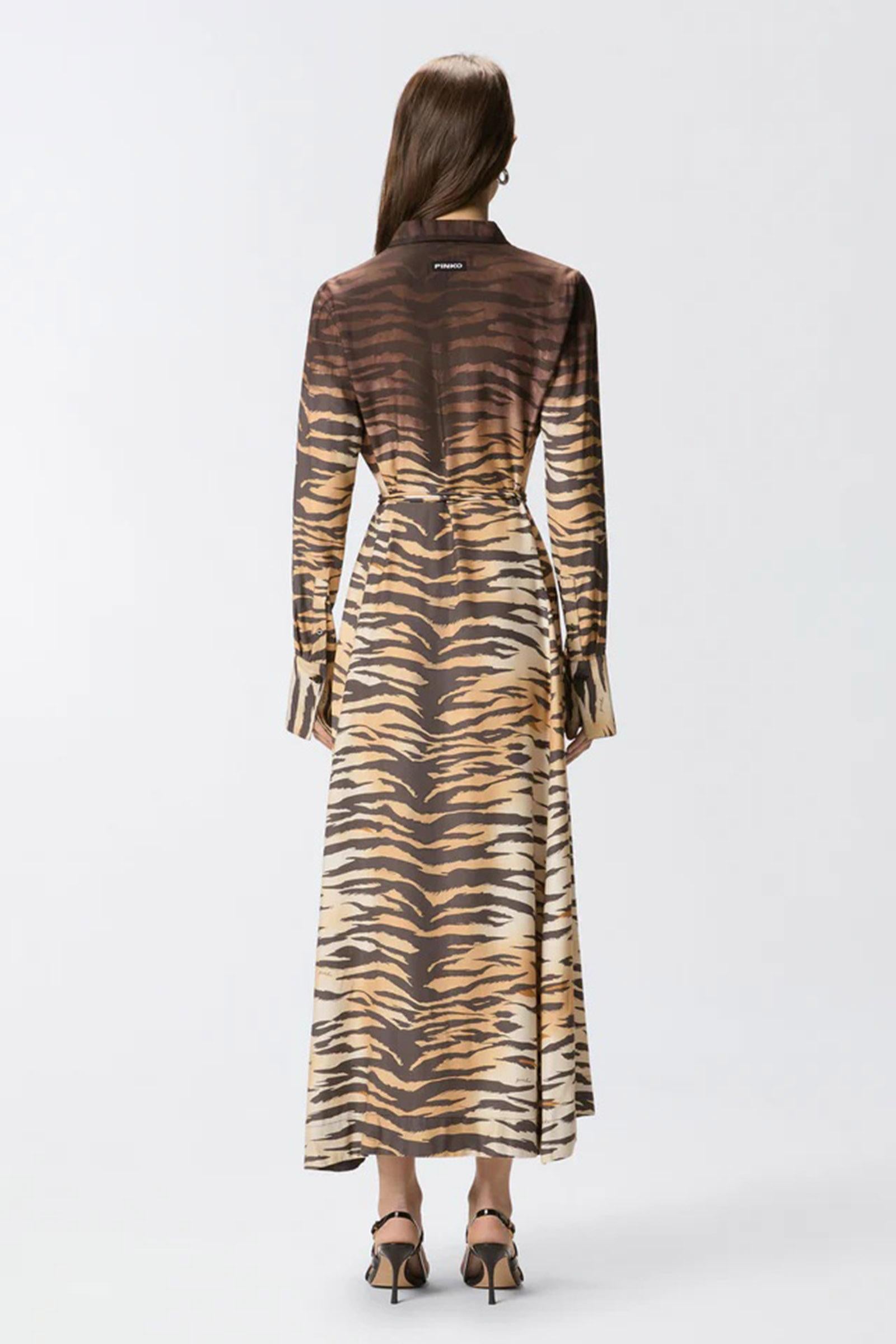 Abito chemisier lungo con gonna leggermente svasata, abbottonatura frontale, colletto a camicia, maniche con bottone sui polsi e sottile cintura in vita da annodare in base al proprio gusto. Realizzato in tessuto twill dalla mano fluida e lucente, particolarmente adatto anche per la stagione estiva, il modello si distingue per la seducente stampa animalier tigrata con parte superiore più scura dall'effetto sfumato, che viene piazzata a mano su ogni capo per trasformarlo in una creazione unica e inimitabile. Il vestito è completato dall'etichetta con logo lettering PINKO sul retro.1° Tessuto Esterno: VISCOSA 100% - 2° Tessuto Esterno: POLIESTERE 100% - Fodera: POLIESTERE 100%