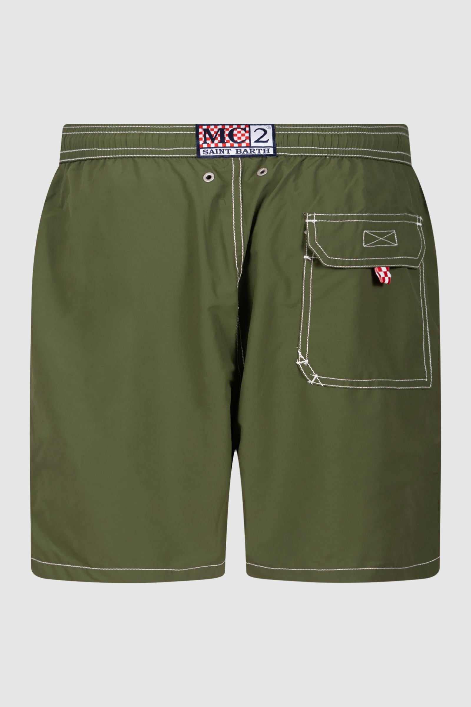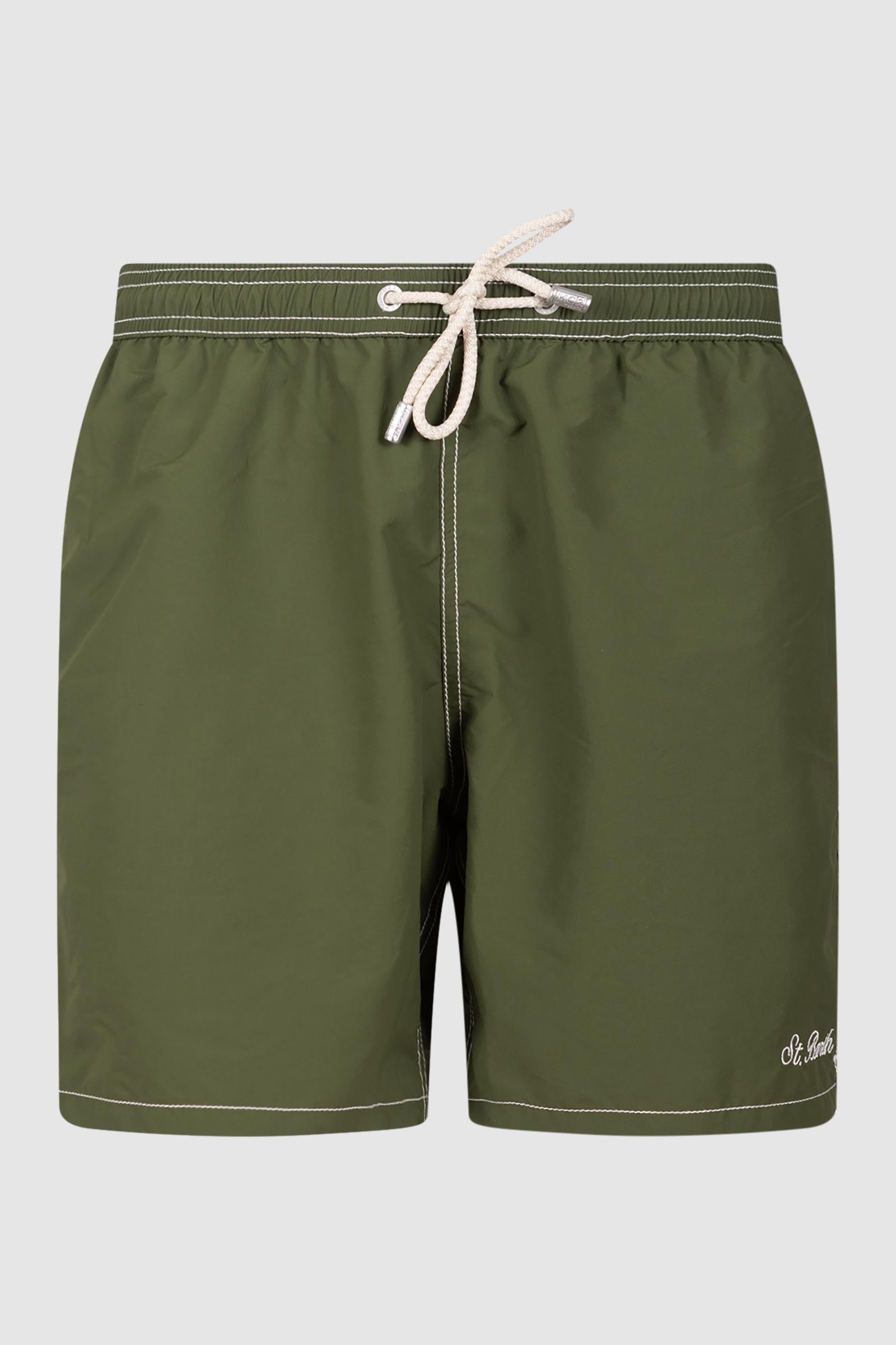 Linee essenziali e stile senza tempo per questo costume da bagno in tinta unita verde oliva. Il design pulito, arricchito da cuciture a contrasto e dalla discreta firma ricamata "St. Barth" sulla gamba, lo rende un capo sofisticato ma informale, perfetto per chi cerca eleganza anche in spiaggia.