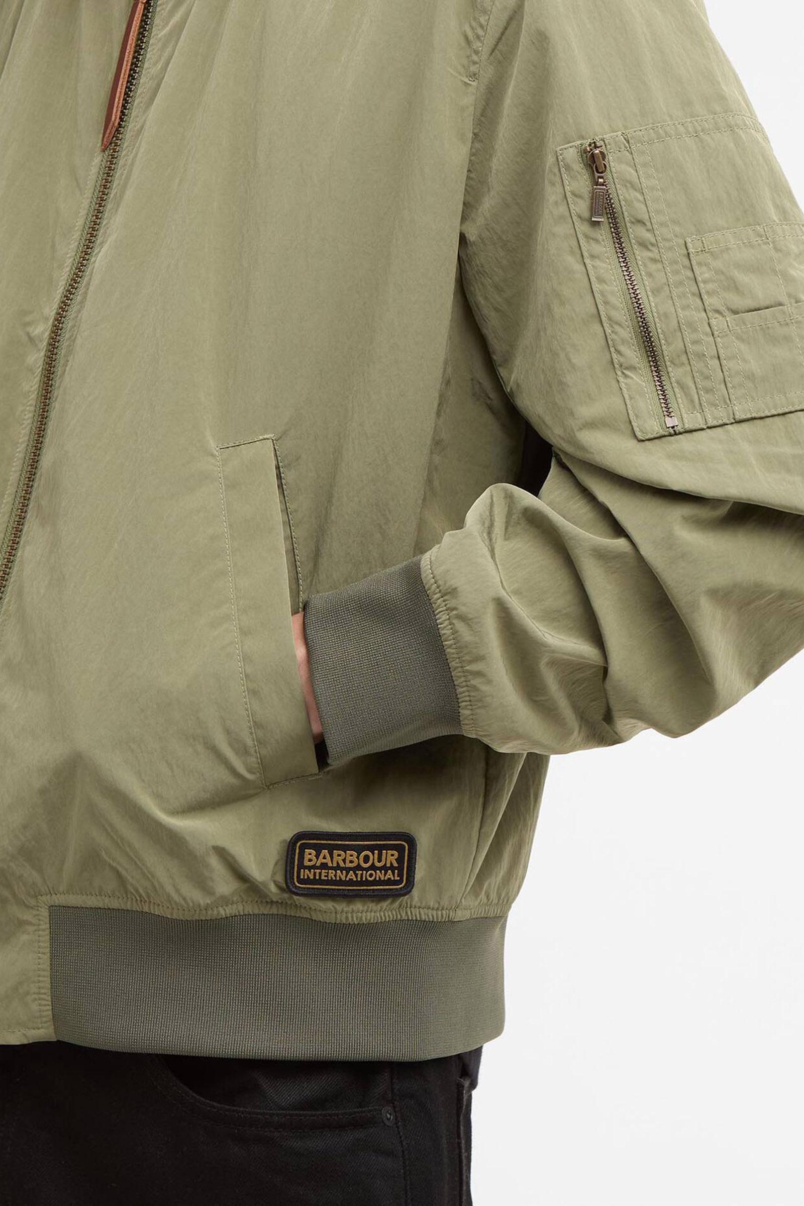 Badge intessuto Barbour International nero e oro antico in basso, a sinistra.
