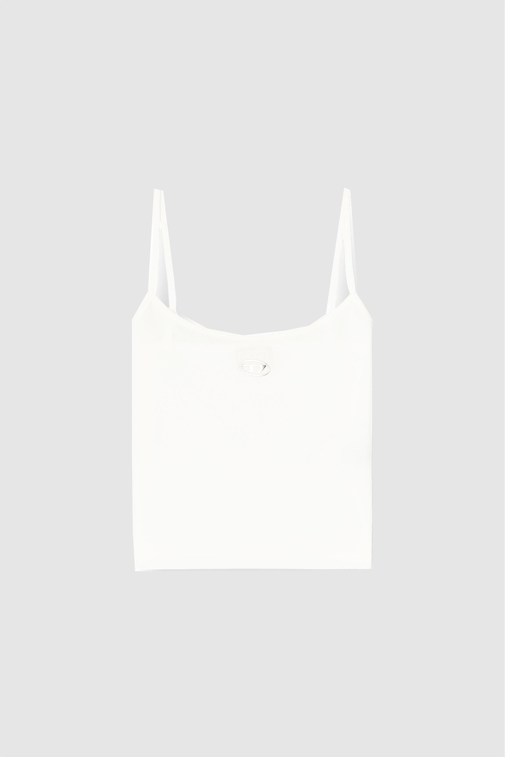Top slim fit con spalline sottili e scollo rotondo. Realizzato in cotone elasticizzato a costine fini, garantisce comfort e libertà di movimento. Caratteristica distintiva è il logo Oval D metallizzato stampato a iniezione in rilievo sotto lo scollo.