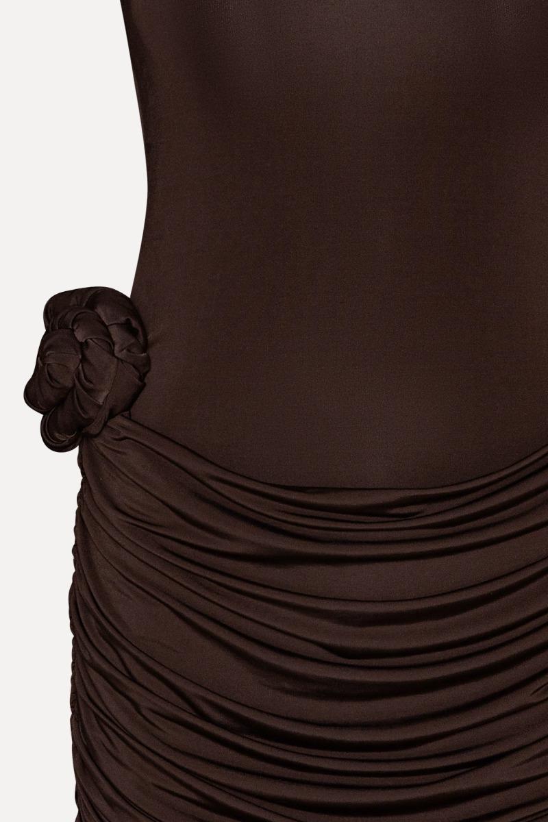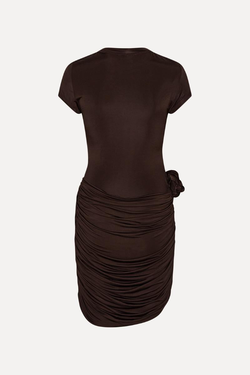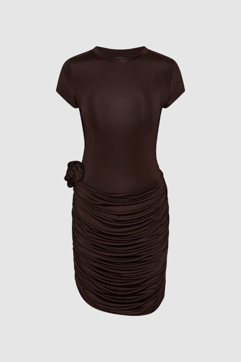 Il miniabito drappeggiato marrone scuro è realizzato in una tonalità marrone scuro con una silhouette liscia e aderente. L'abito presenta maniche corte e scollo rotondo, creando un profilo superiore pulito. I dettagli drappeggiati attraversano la gonna, aggiungendo morbide arricciature e texture, e sono accentuati da una rosetta in tessuto posizionata sui fianchi. La lunghezza arriva sopra il ginocchio. Realizzato in misto viscosa elasticizzata, il tessuto appare liscio e flessibile.