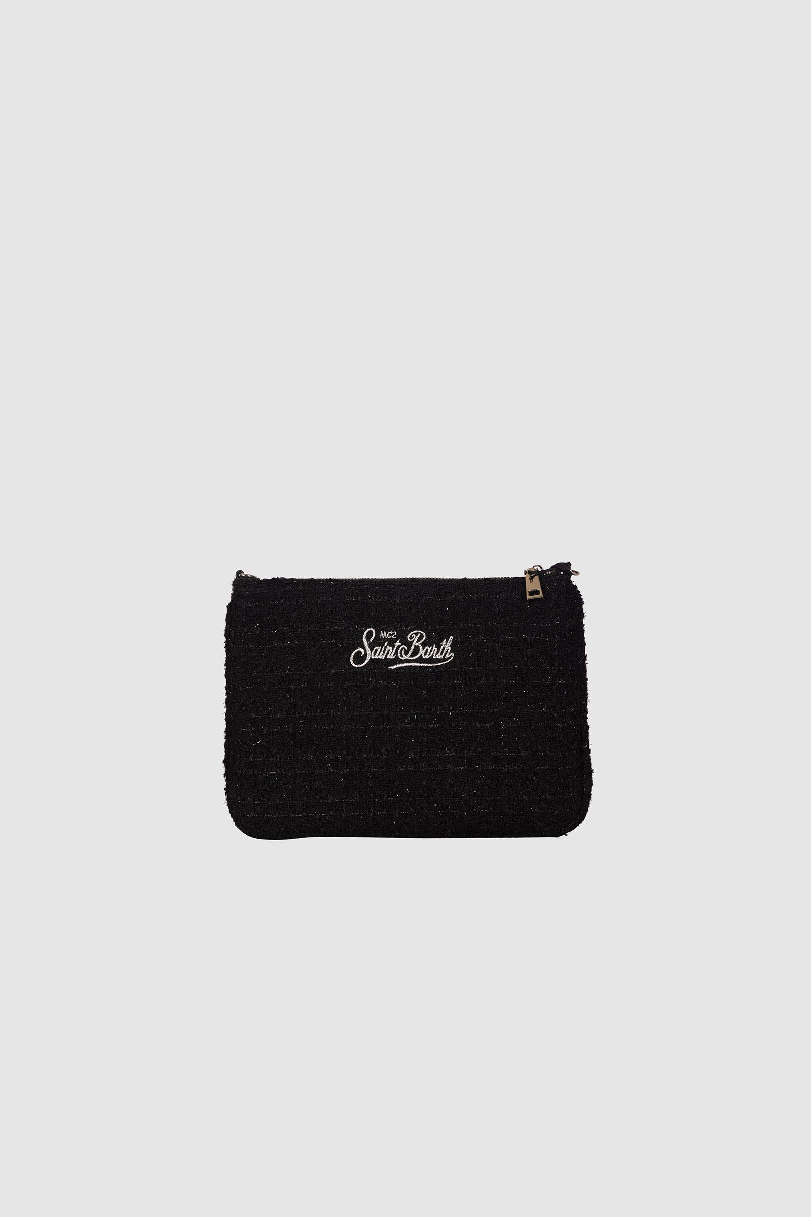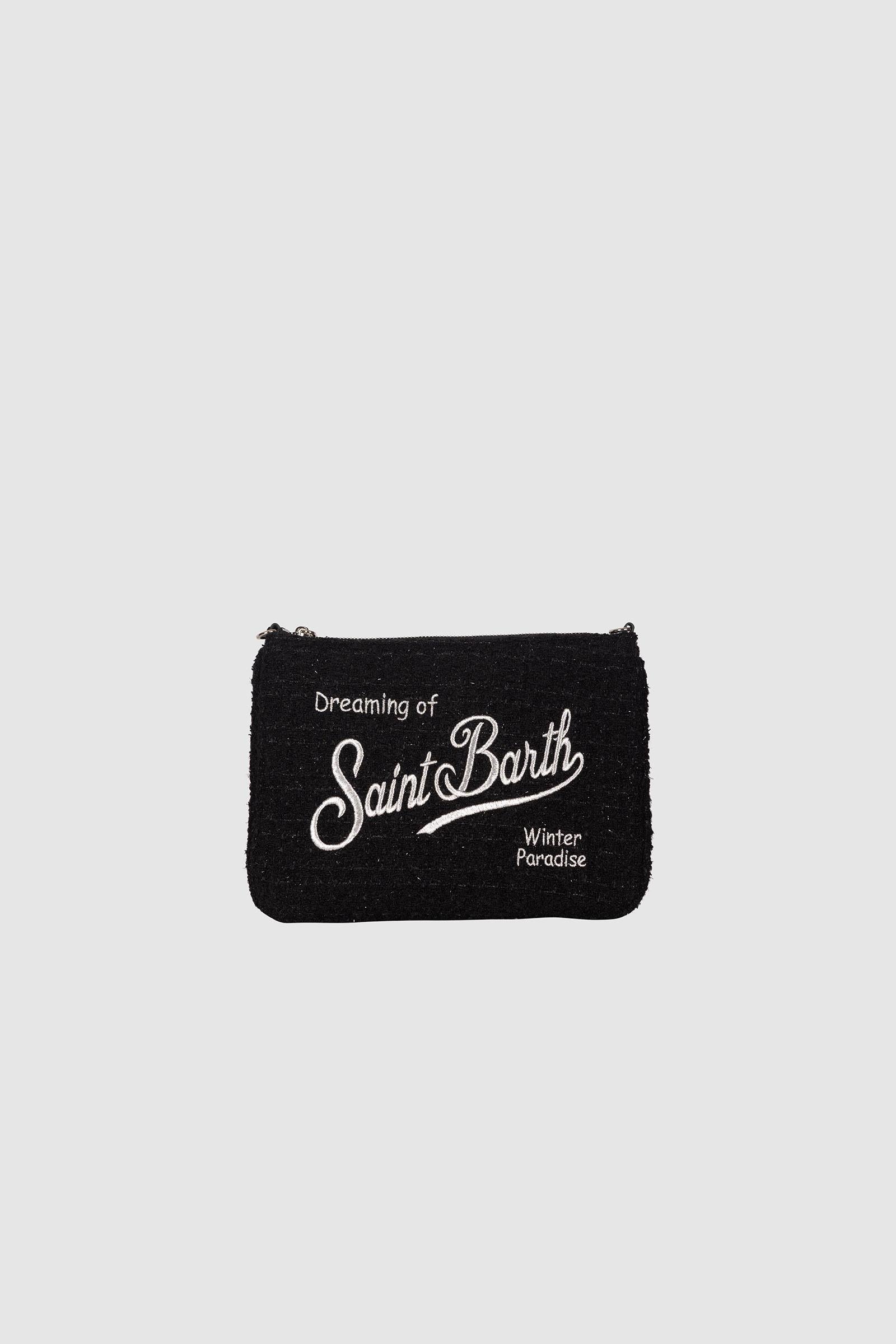 Raffinata e versatile, la pochette Dreaming of Saint Barth - Winter Paradise è l'accessorio perfetto per completare i tuoi look invernali. Realizzata in morbido tessuto effetto lana bouclé, presenta un'elegante tonalità nera impreziosita dal ricamo bianco frontale con la celebre scritta "Dreaming of Saint Barth - Winter Paradise". Il design minimal ma ricercato la rende ideale sia per l'uso quotidiano che per serate speciali o weekend fuori città.