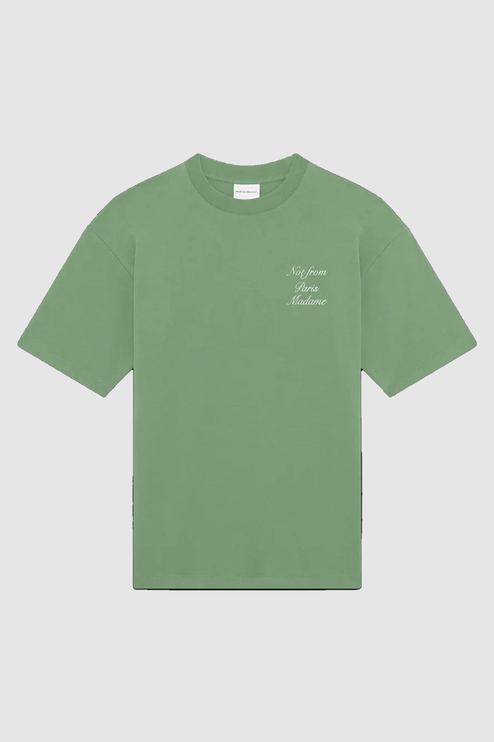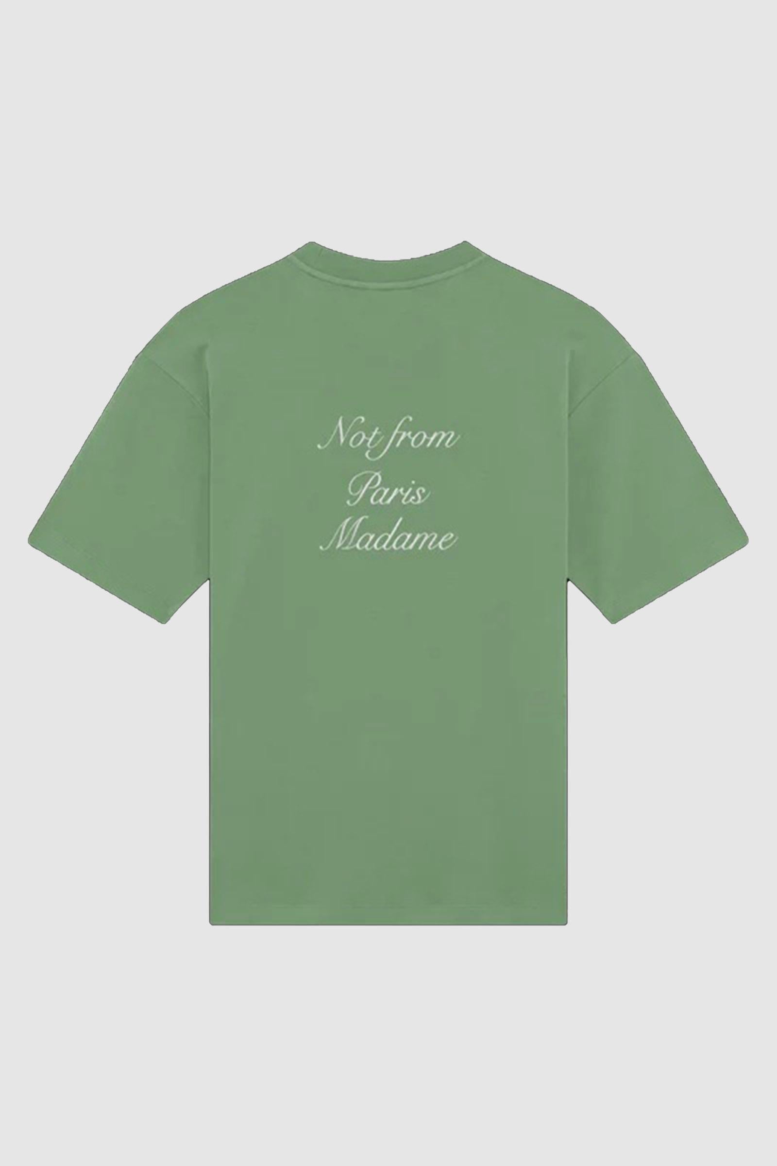 Questa t-shirt verde chiaro in interlock di cotone 100% con scollo a costine presenta lo slogan "Not from Paris Madame" stampato in stile calligrafico sul davanti e sul retro.