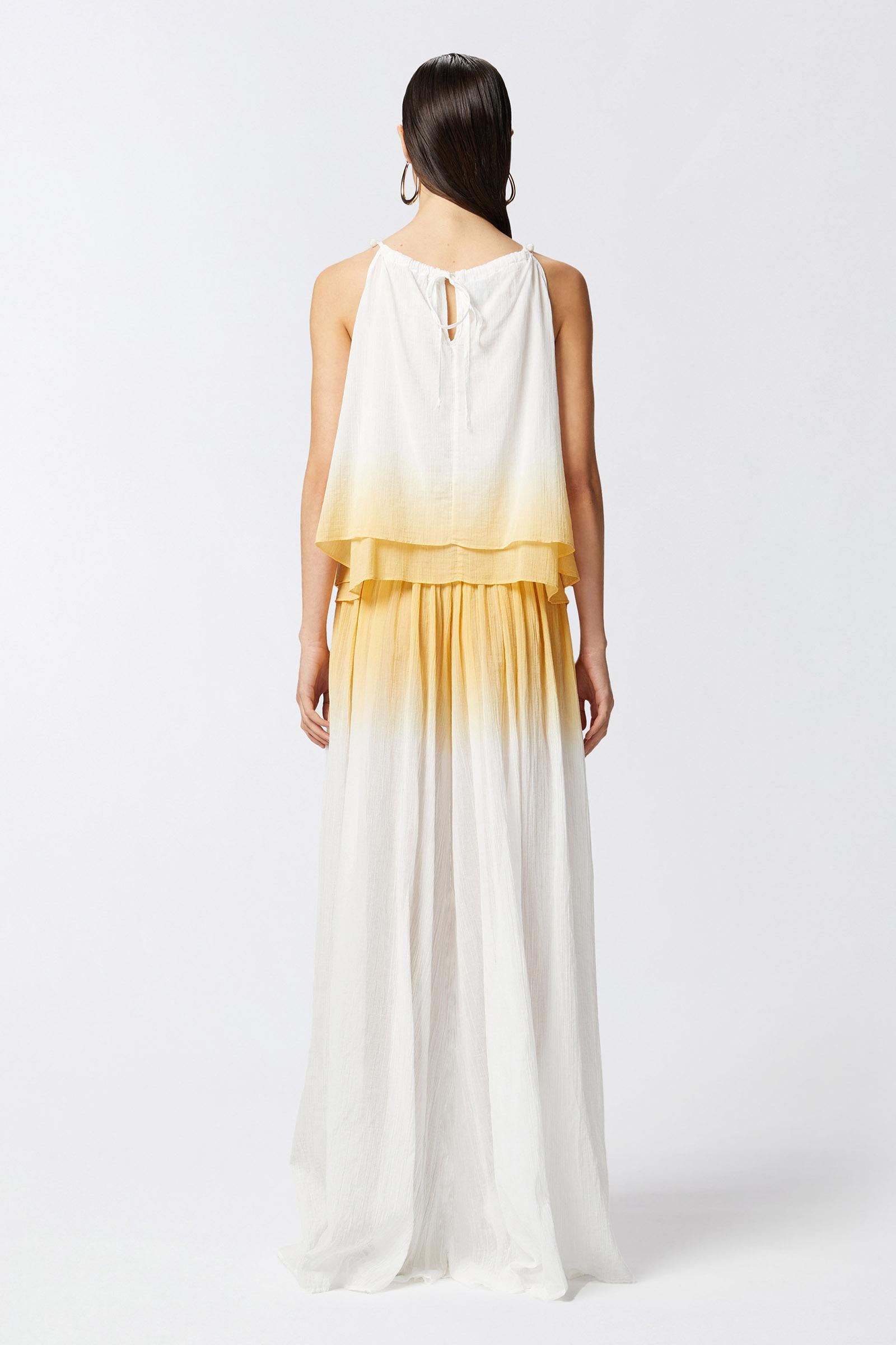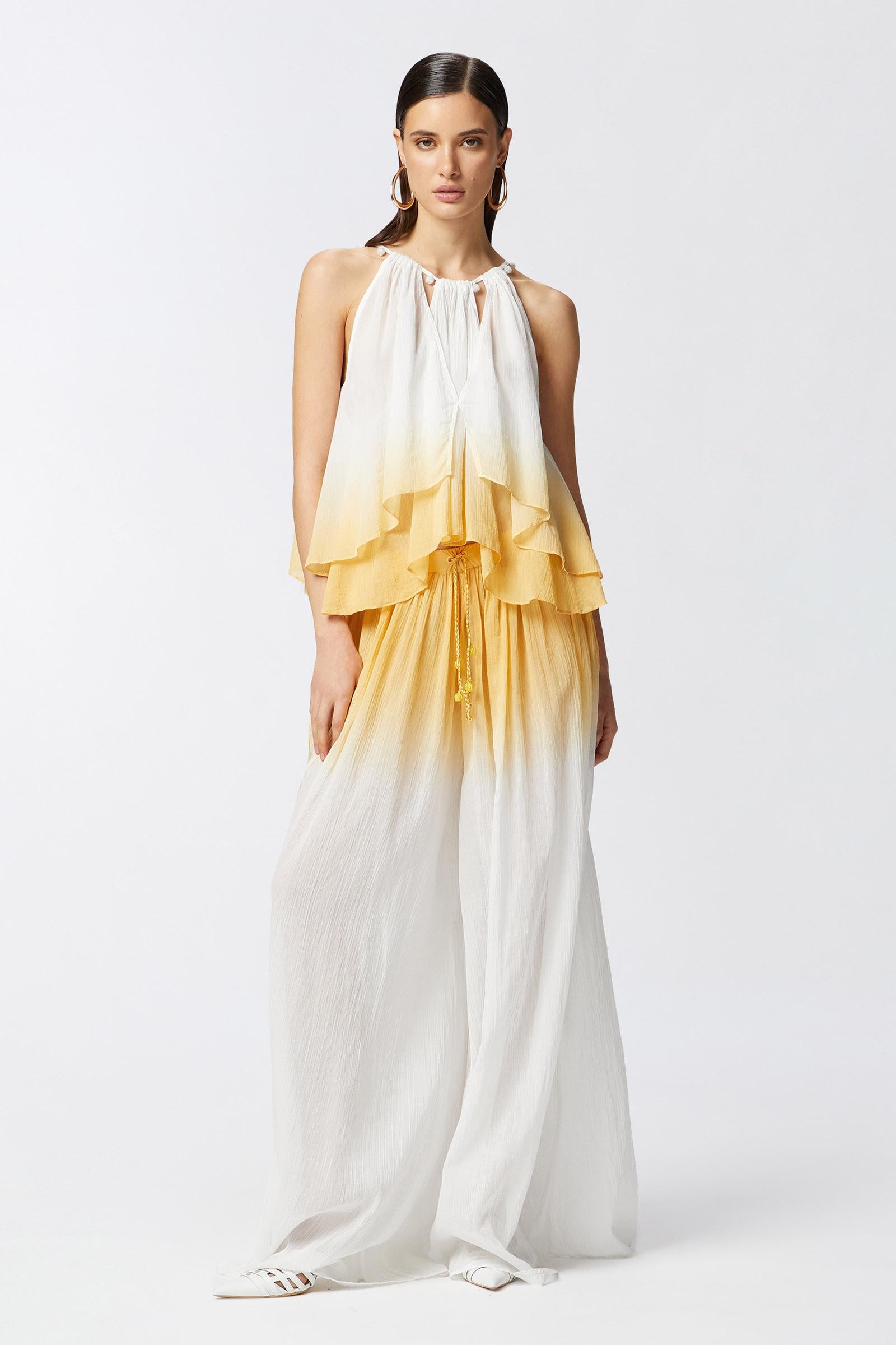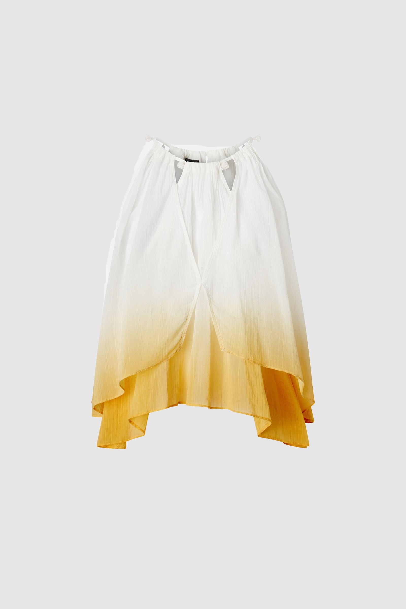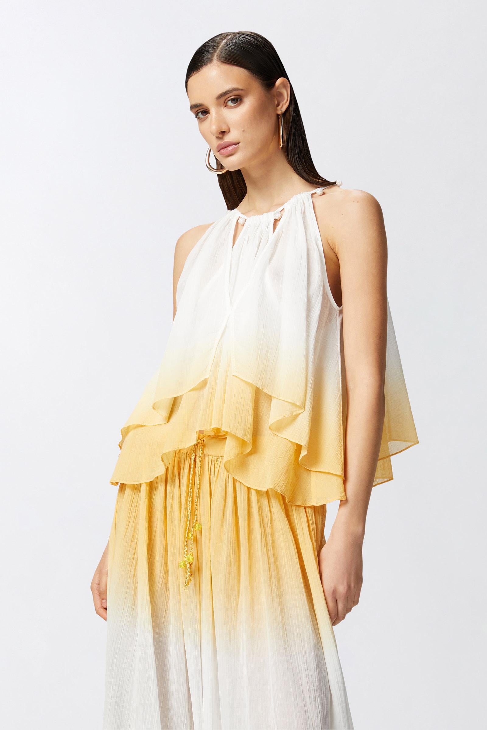 Top voluminoso senza maniche realizzato in leggerissima mussola di puro cotone tinta in capo, contraddistinto da una sfumatura di colore degradè che va dal basso verso l'alto, schiarendosi. Il particolare taglio dello scollo di questo top, costruito a balze e a strati, contribuisce a creare il volume ampio e arioso, enfatizzato dalla leggerezza del tessuto. Indossa il top con i pantaloni abbinati, che riprendono anche la stessa sfumatura, per creare un total look particolare, femminile e d'impatto, perfetto per una cerimonia di giorno.Tessuto Esterno: COTONE 100% - Ricamo: Vetro 100