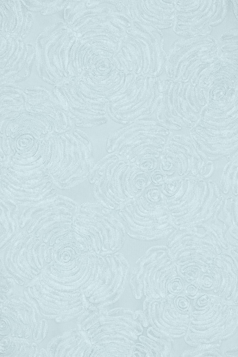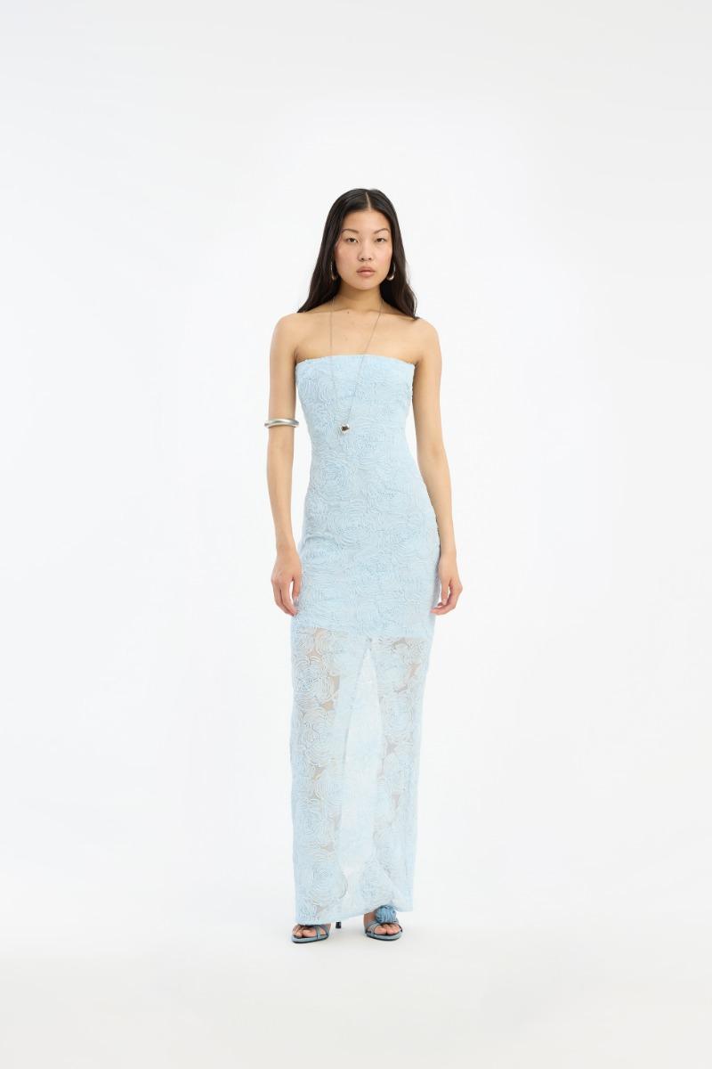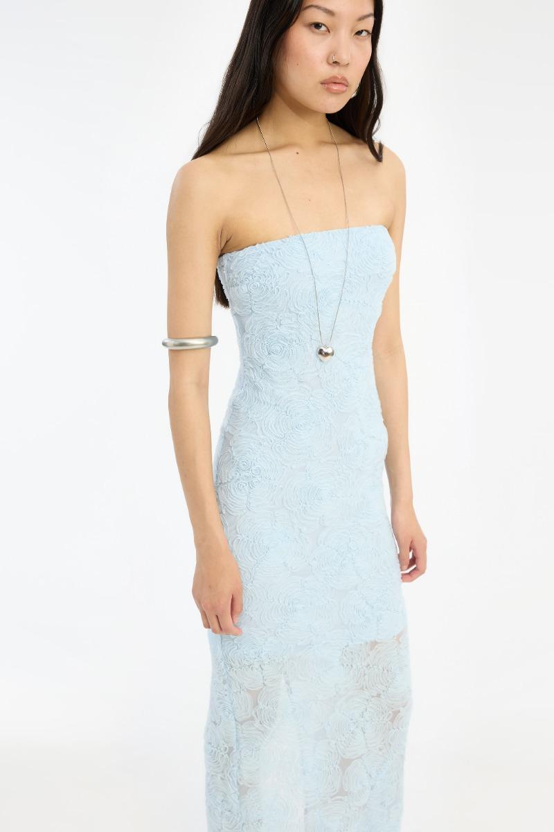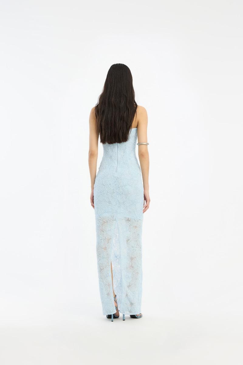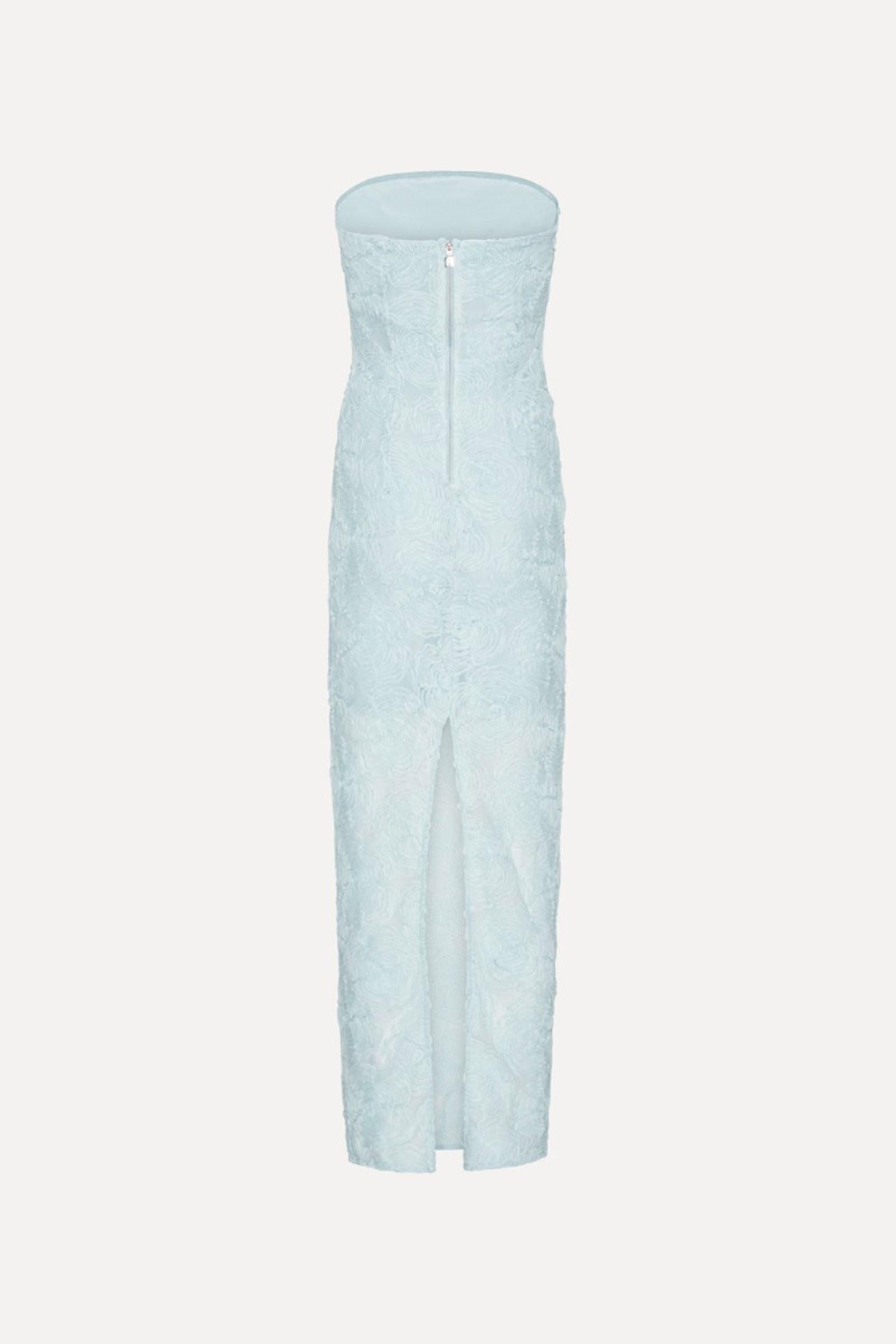 L'abito a tubino in rete blu è un abito lungo senza spalline con una silhouette aderente e una scollatura dritta. L'abito presenta una superficie in rete testurizzata con un motivo floreale che aggiunge volume alla forma pulita e allungata. Una cerniera centrale posteriore e uno spacco posteriore consentono facilità di movimento mantenendo un look elegante.