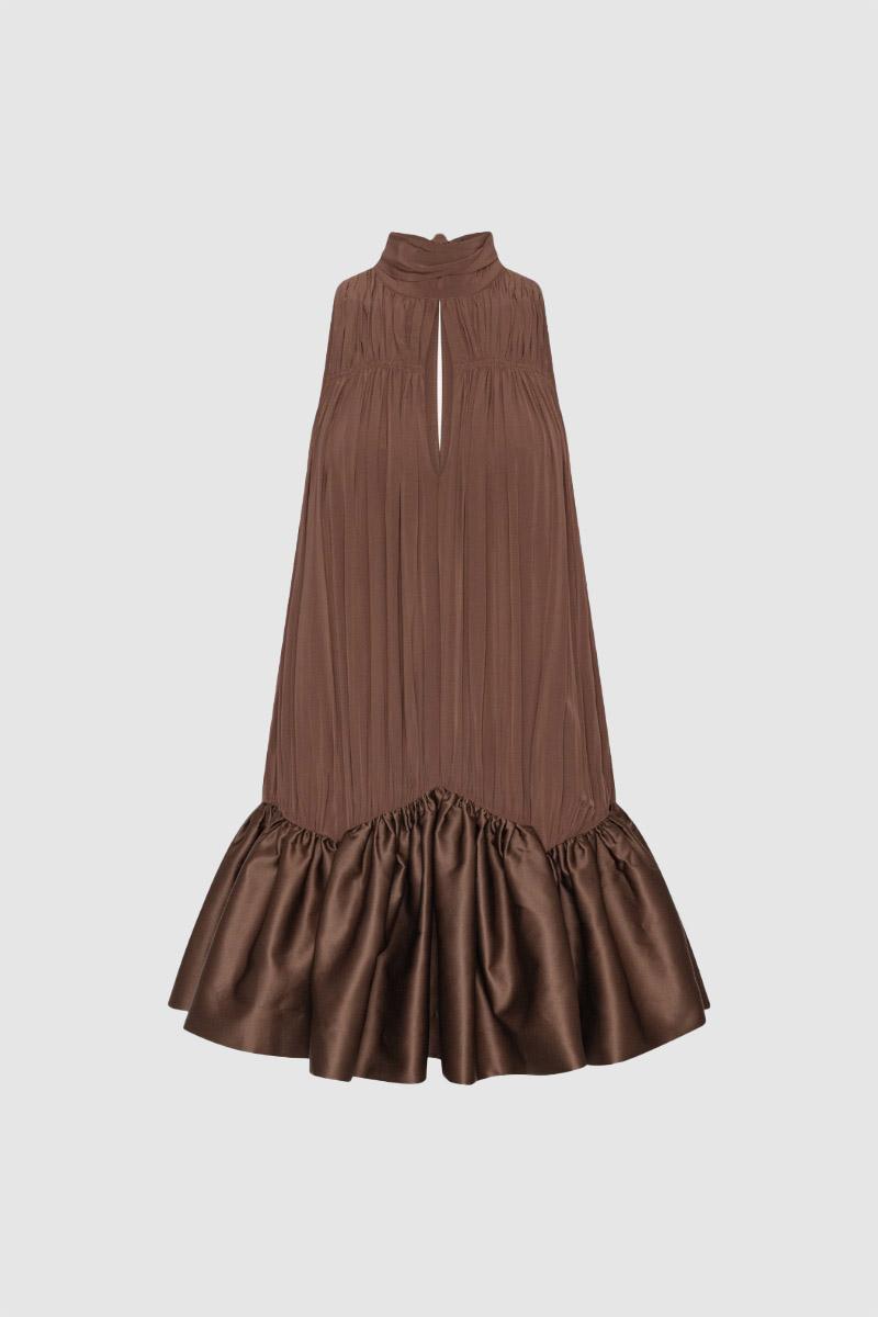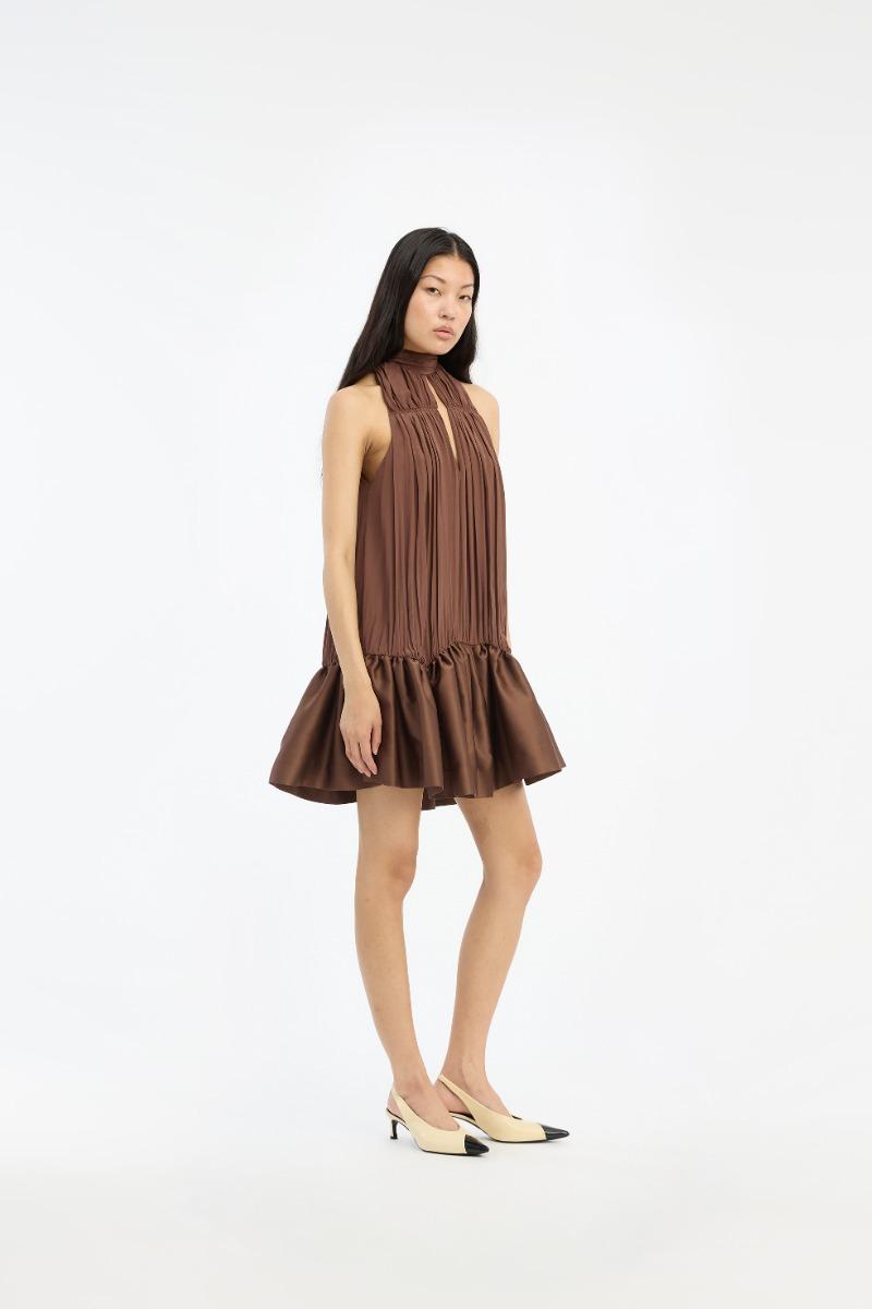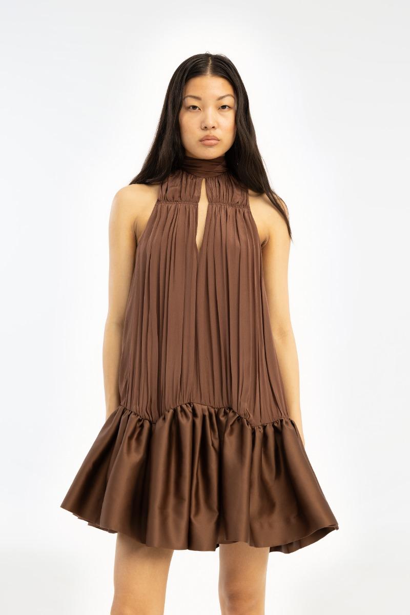 Il miniabito arricciato marrone scuro è un miniabito senza maniche con scollo alto all'americana e morbide arricciature sul davanti. La silhouette cade morbidamente dalla scollatura in una gonna voluminosa con orlo a balze. Sul retro, l'abito presenta un fiocco annodato al collo e uno spacco aperto sotto la scollatura. Realizzato in viscosa leggera con un morbido drappeggio e una leggera lucentezza.