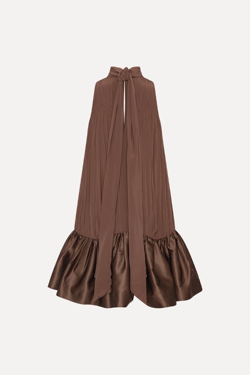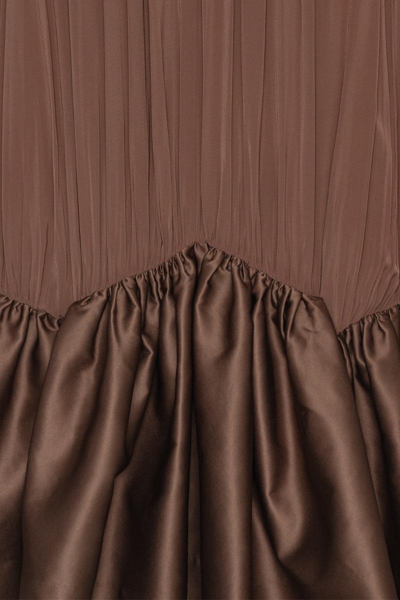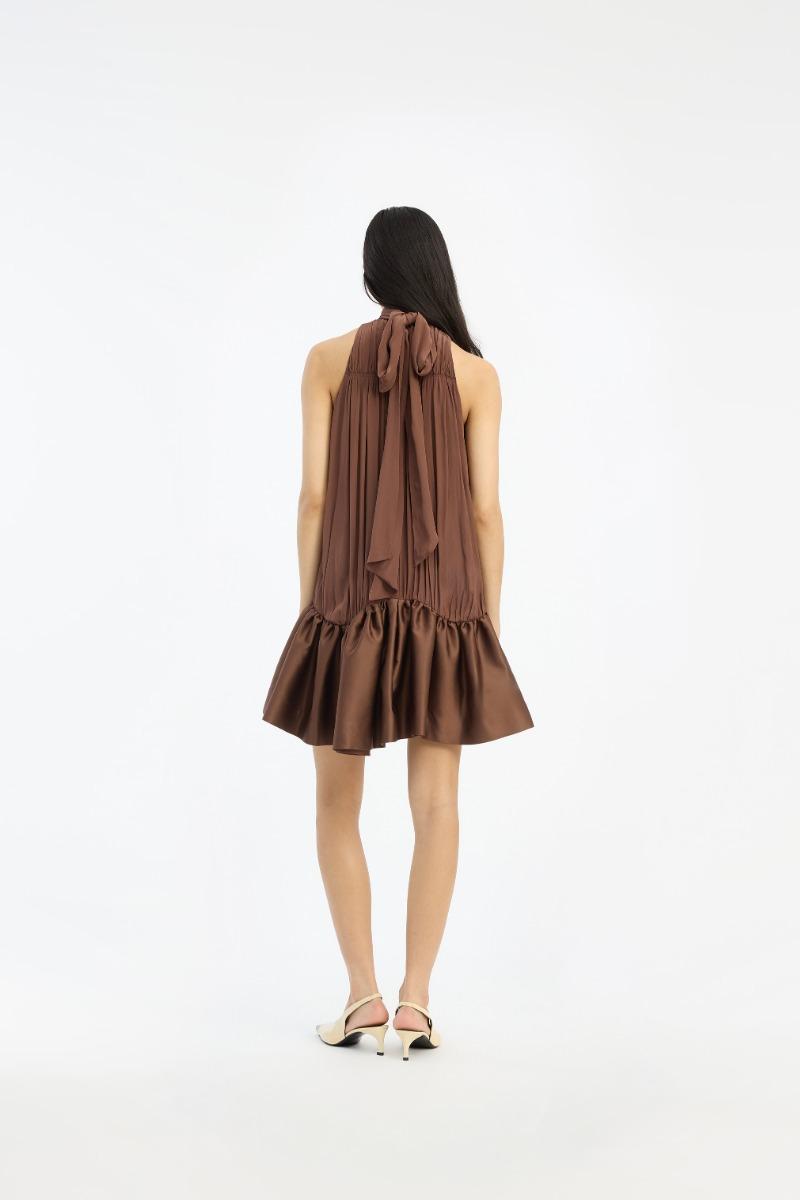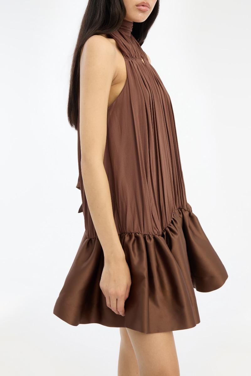 Il miniabito arricciato marrone scuro è un miniabito senza maniche con scollo alto all'americana e morbide arricciature sul davanti. La silhouette cade morbidamente dalla scollatura in una gonna voluminosa con orlo a balze. Sul retro, l'abito presenta un fiocco annodato al collo e uno spacco aperto sotto la scollatura. Realizzato in viscosa leggera con un morbido drappeggio e una leggera lucentezza.