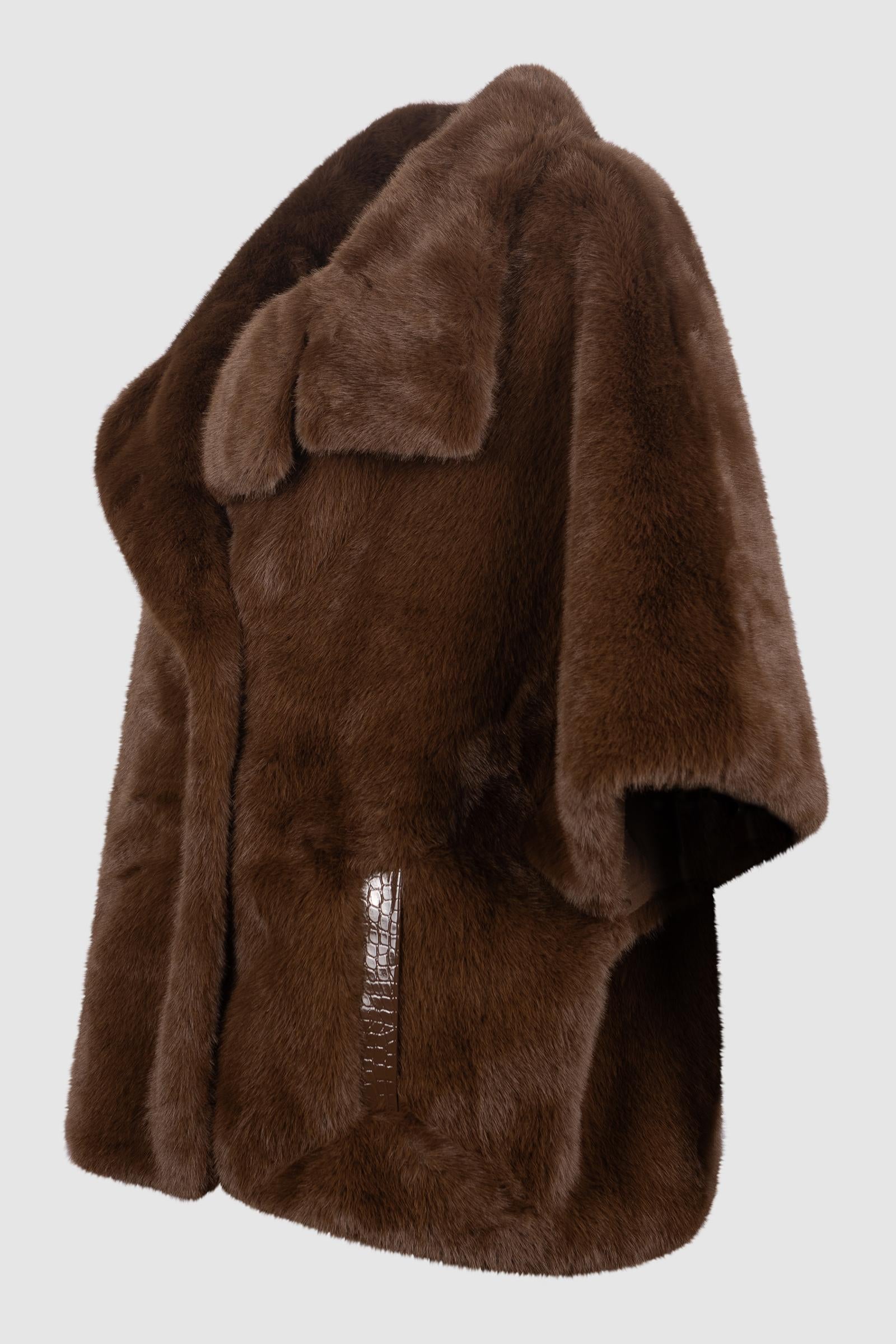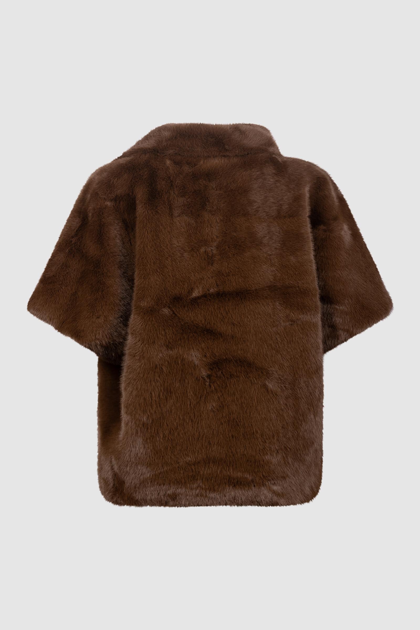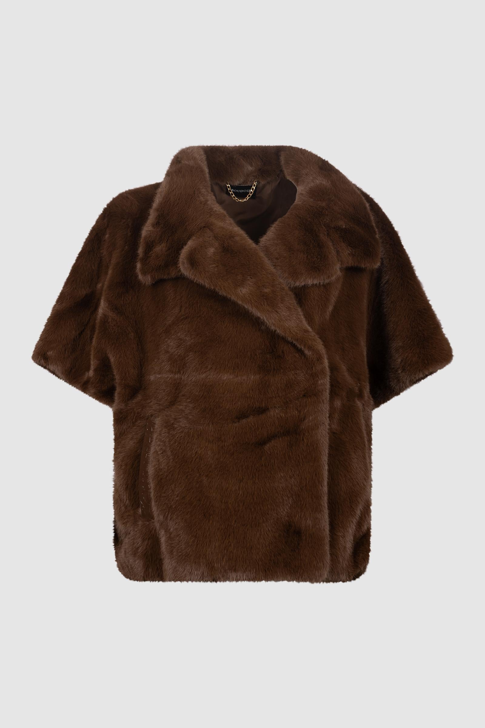 Realizzata con pelliccia sintetica di alta qualità, presenta una texture setosa e compatta che riproduce fedelmente l'effetto del pelo naturale. Il collo ampio a revers, la chiusura frontale nascosta e la linea morbida e avvolgente valorizzano la silhouette con eleganza.