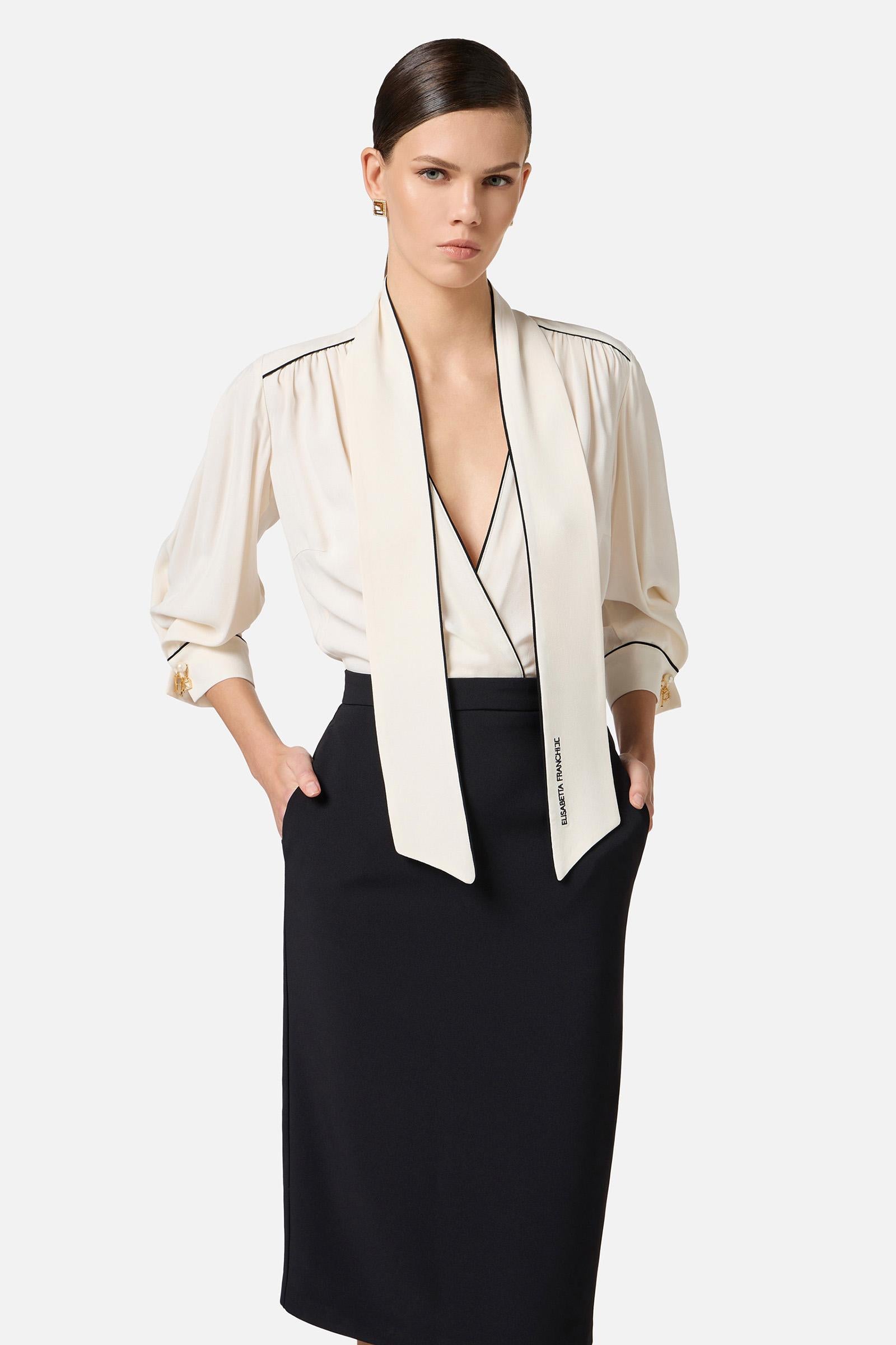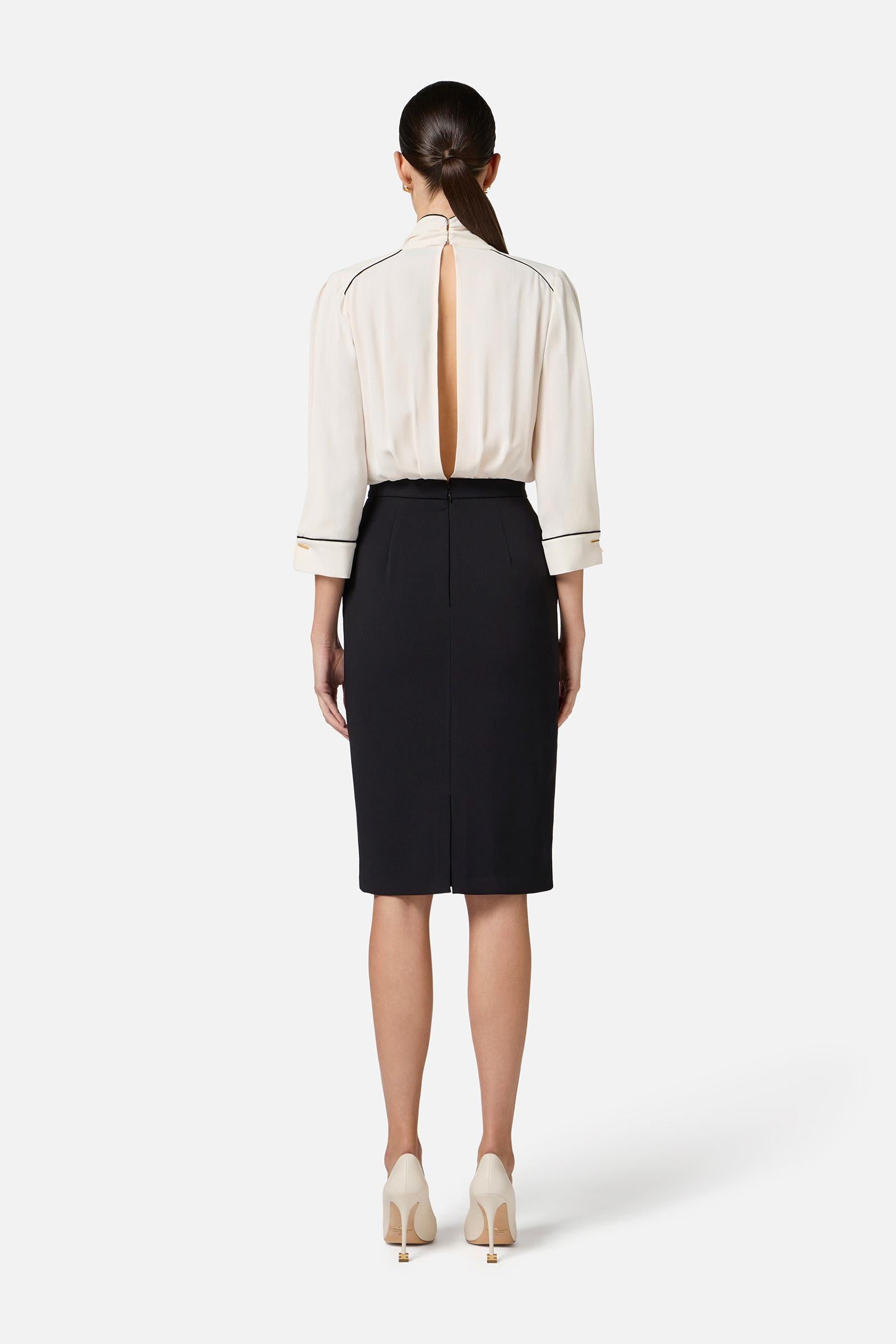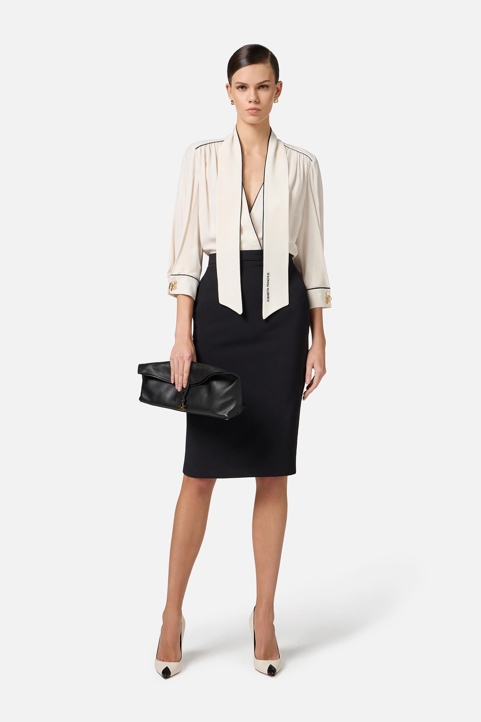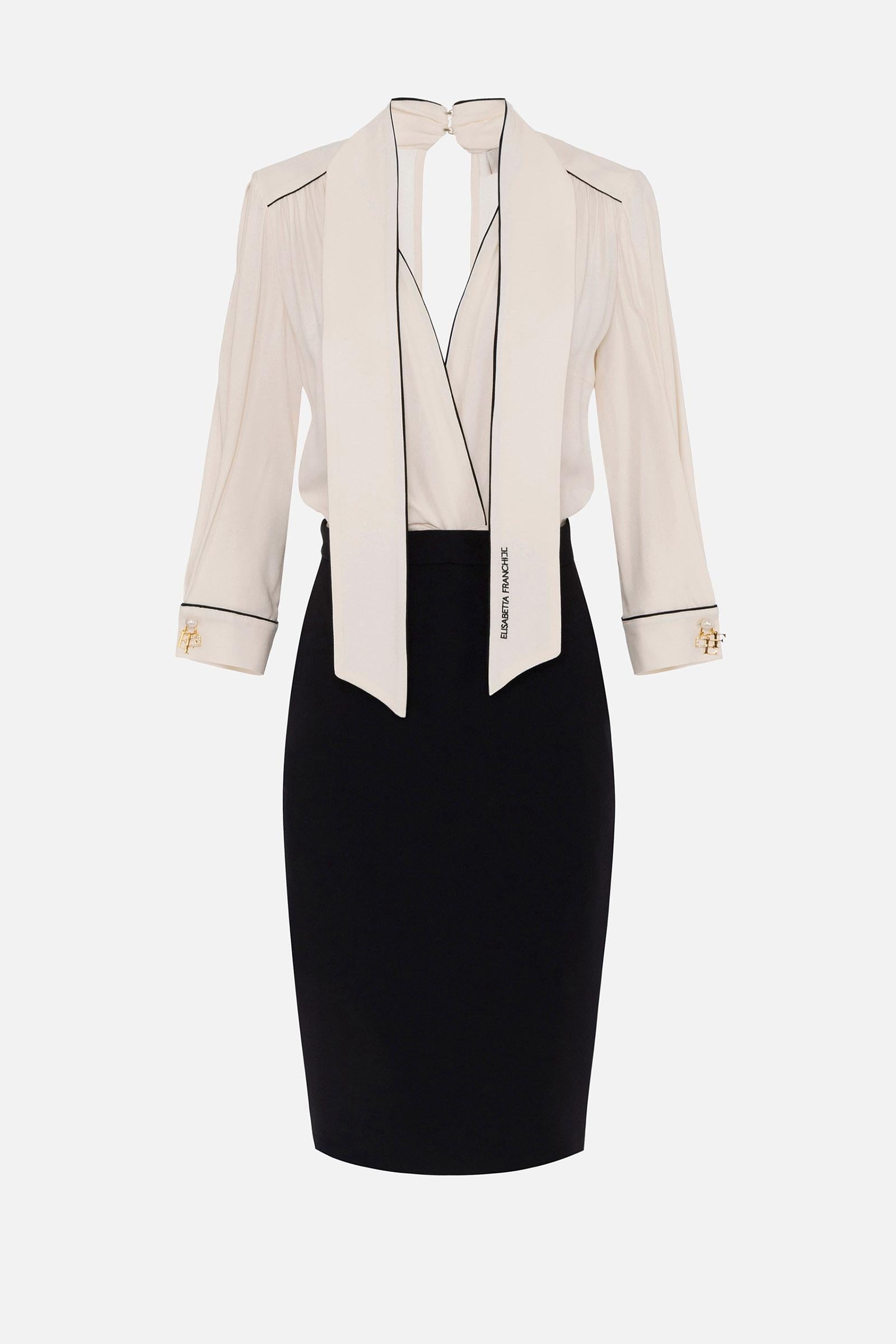 Abito due pezzi con camicia amovibile in georgette di viscosa e gonna in crêpe. La camicia ha scollo a V con sciarpa logata e dettagli di piping a contrasto, la gonna ha linea a tubino con lunghezza sotto al ginocchio. Vestibilità slim. Composizione: 100%Viscosa