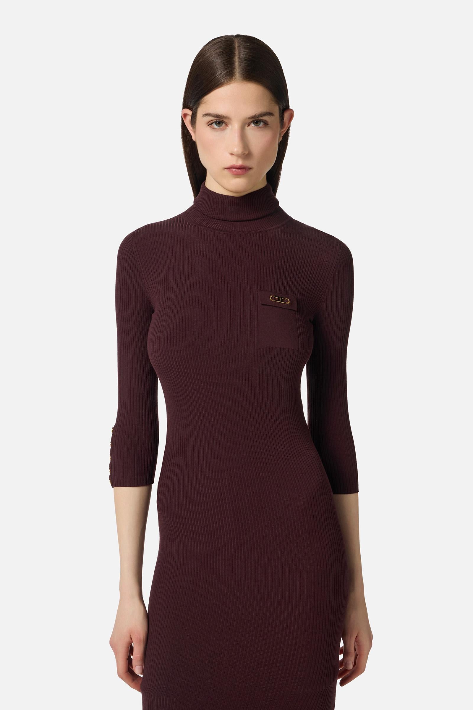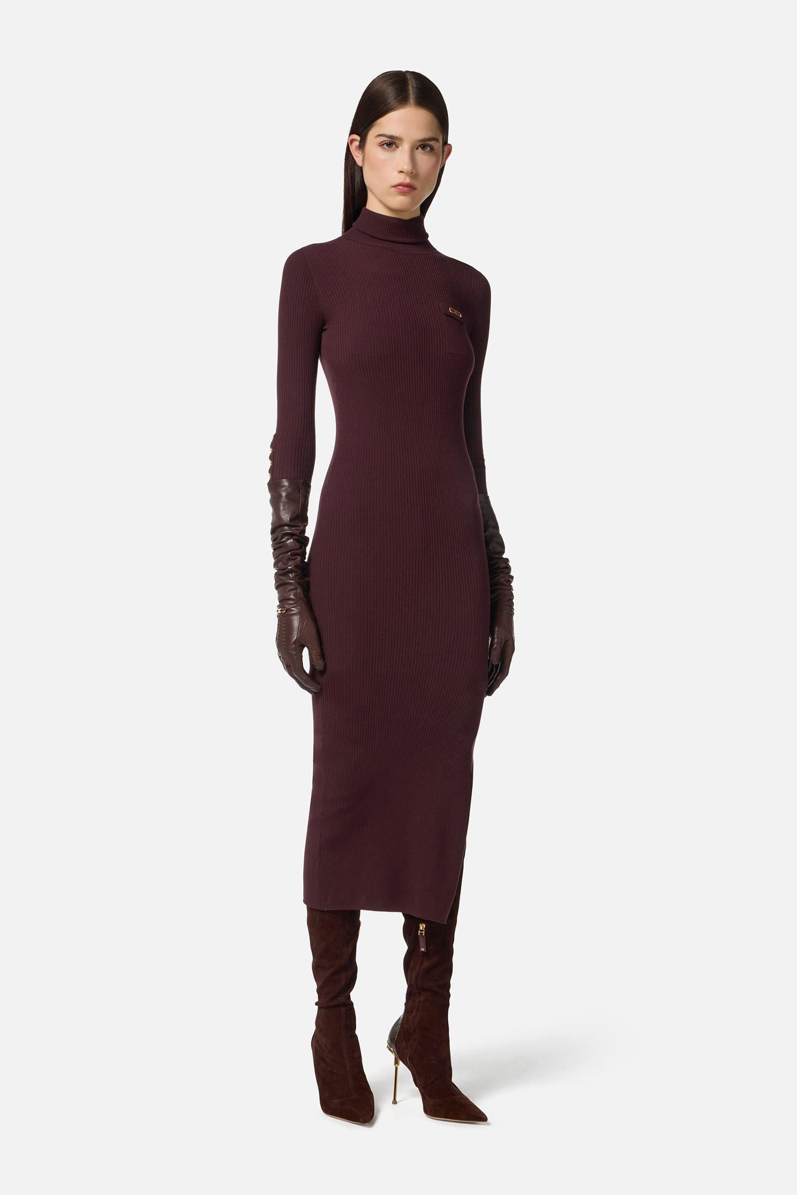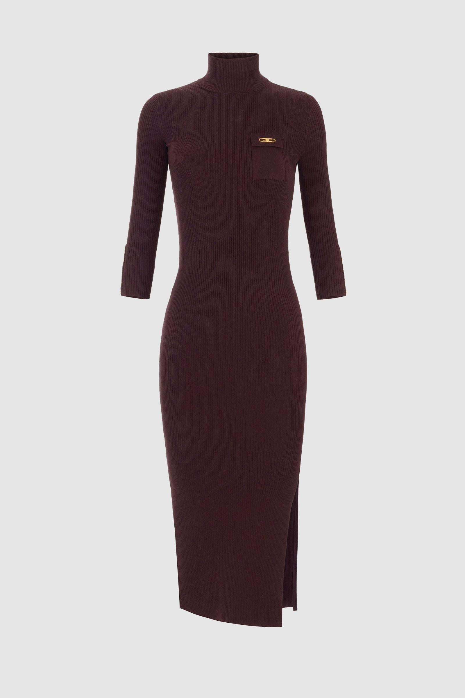 Abito in maglia dalla vestibilità aderente. Il vestito ha collo dolcevita, maniche ¾ con bottoni e si distingue per la gonna longuette con profondo spacco laterale. La lavorazione a costine arricchisce la linea essenziale del capo. Il taschino in raso con dettaglio logo regala un ultimo tocco di stile.Composizione articolo