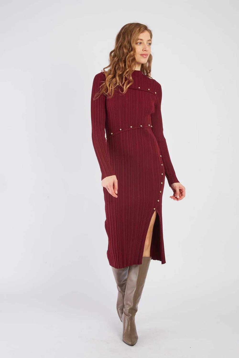 Abito midi in maglia fine con maniche lunghe ed elegante scollo a barca. Spacco frontale per un tocco femminile e moderno. Taglio aderente, ideale per l'inverno e le mezze stagioni.