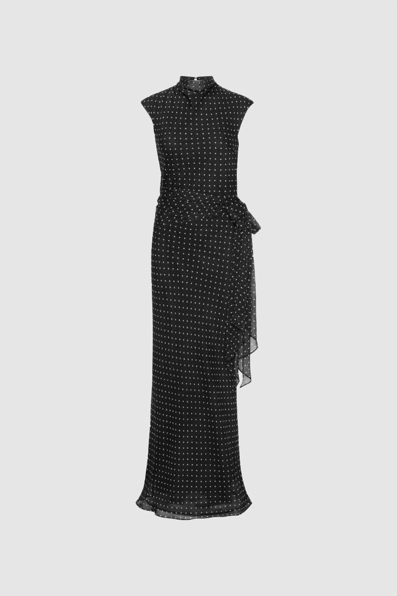 L'abito lungo W. Tie Black è realizzato in chiffon leggero con una piccola stampa a pois. L'abito presenta una scollatura alta con spacco posteriore, maniche ad aletta e un dettaglio drappeggiato con laccetto in vita che si estende in un pannello laterale fluido. La gonna lunga cade dritta con un sottile effetto trasparente sull'orlo. L'abito è foderato.