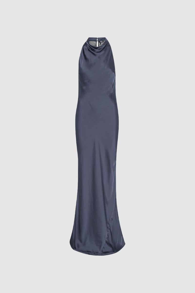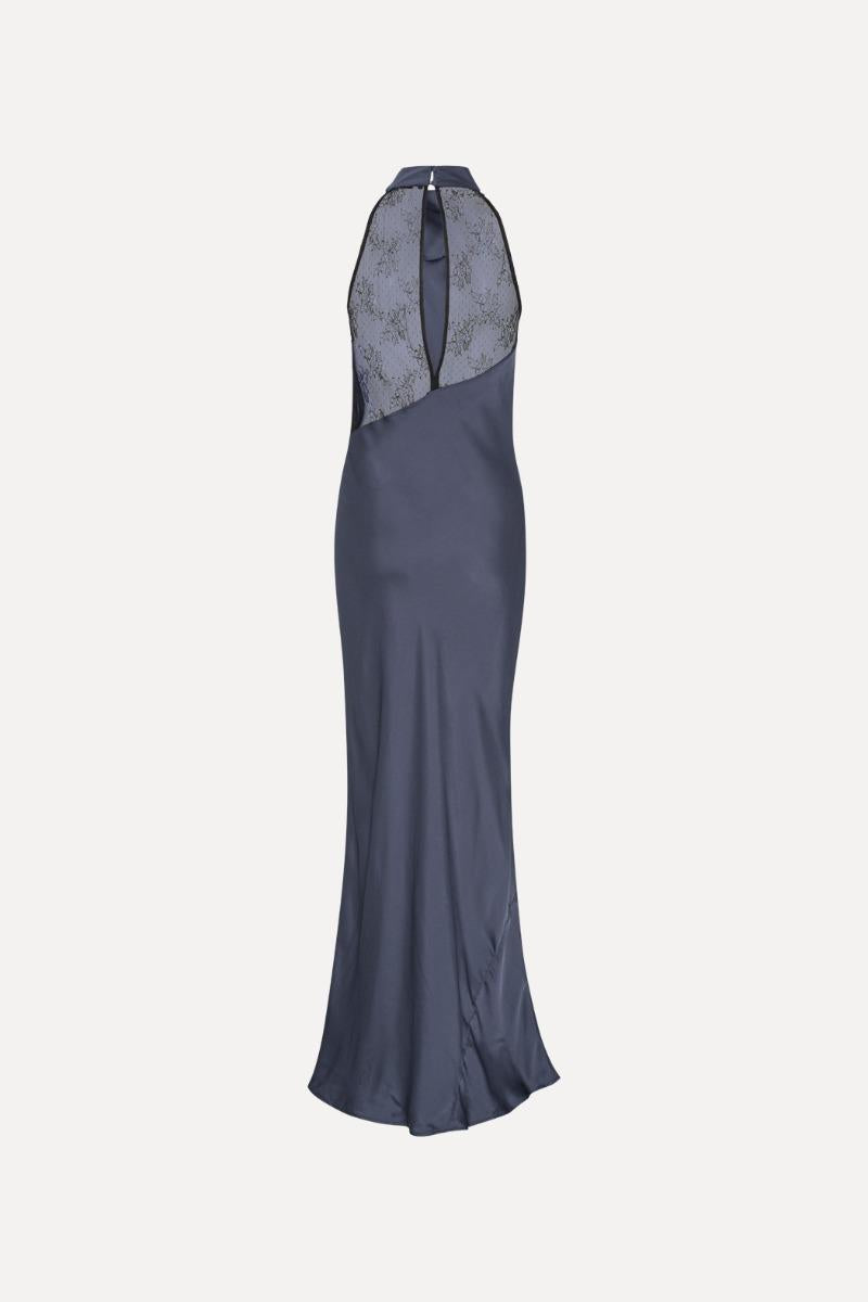 L'abito lungo in pizzo blu scuro è un abito senza maniche con scollo all'americana e una silhouette lunga e dritta. Presenta un davanti delicatamente drappeggiato con arricciature sul seno e una schiena scollata con inserti in pizzo trasparente. Il modello presenta una cucitura arricciata nella parte bassa della schiena e una delicata chiusura con bottoni sul collo.