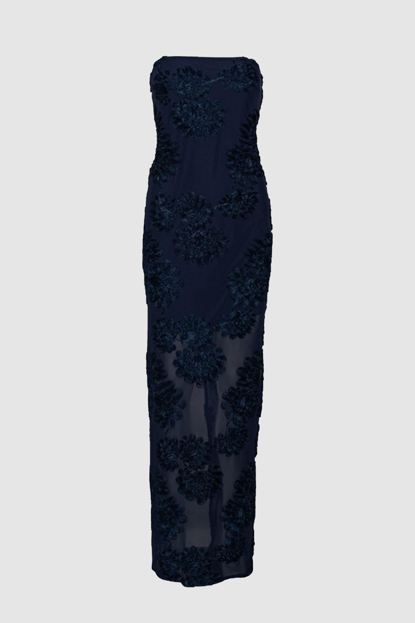 L'abito lungo in rete 3D presenta una scollatura senza spalline e una silhouette aderente. È decorato con applicazioni floreali 3D su tutto il corpo, che aggiungono volume e texture. L'abito ha una lunghezza maxi con uno spacco sul retro per facilitare i movimenti. Una cerniera nascosta sul retro ne facilita la chiusura. Composizione 1: 95% Poliestere (Riciclato) 5% Elastan - Composizione 2: 100% Poliestere. Fodera: 88% Poliestere 12% Elastan