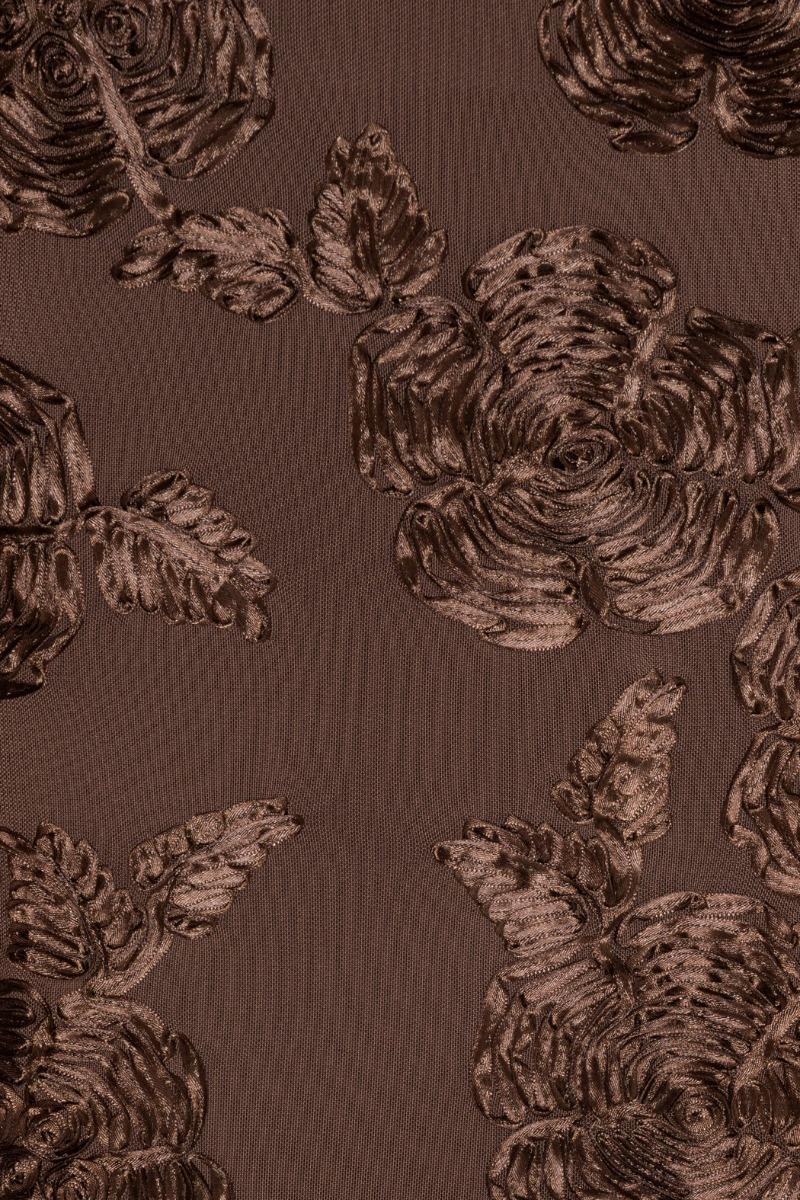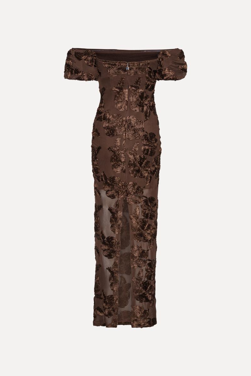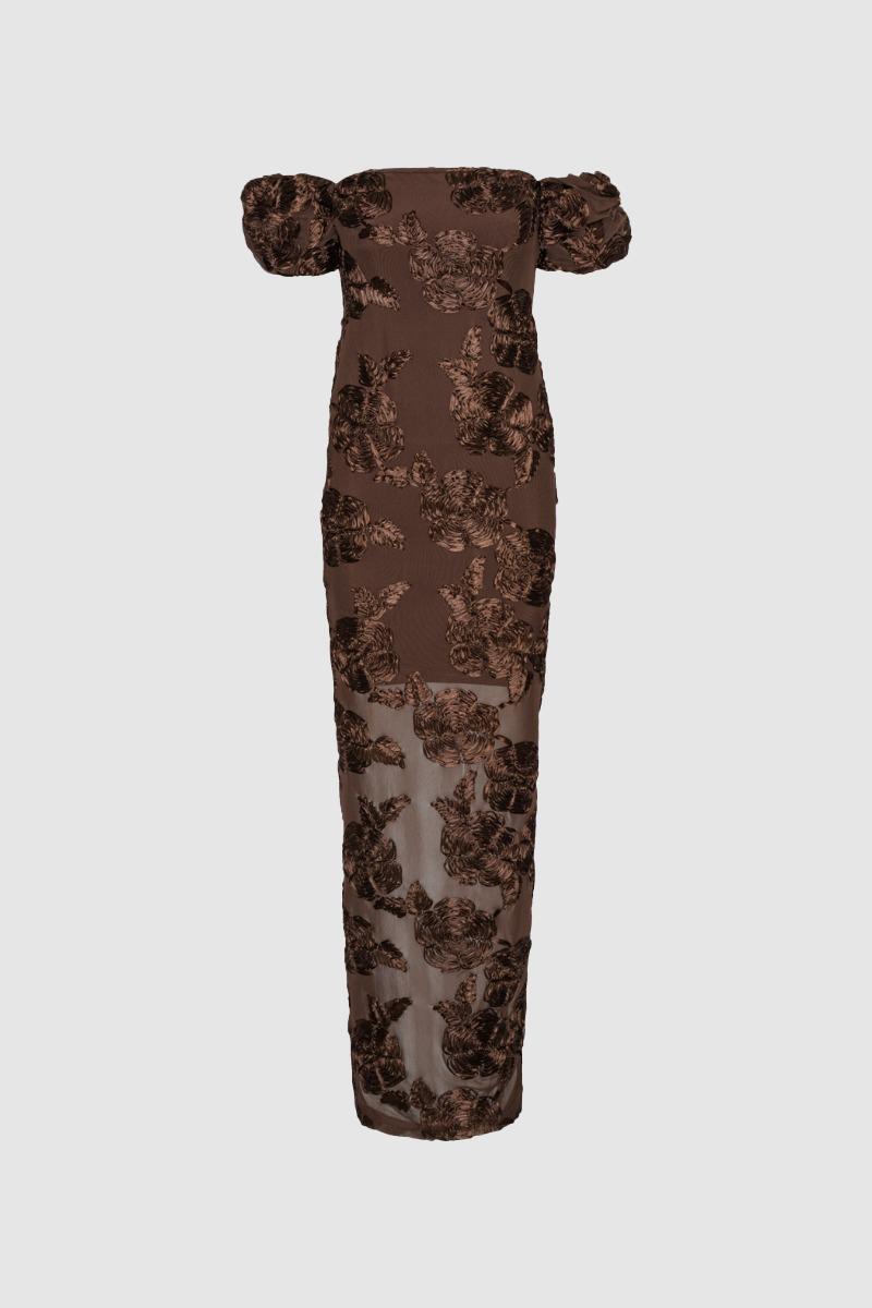 L'abito lungo in rete floreale marrone scuro presenta una silhouette a spalle scoperte con maniche corte voluminose e una linea aderente, lunga fino a terra. La base trasparente è impreziosita da ricami floreali tono su tono. L'abito è foderato.