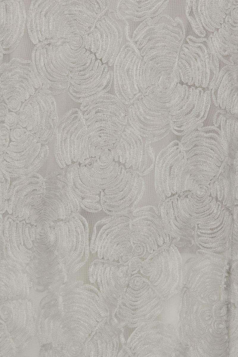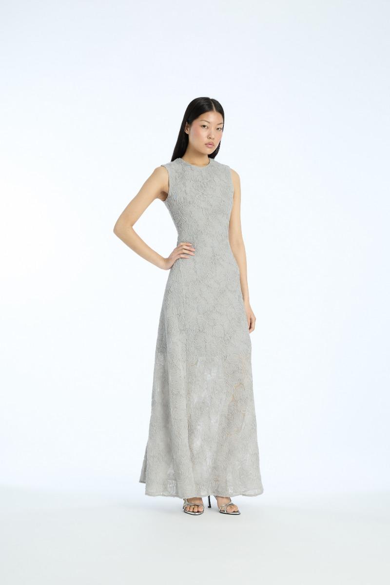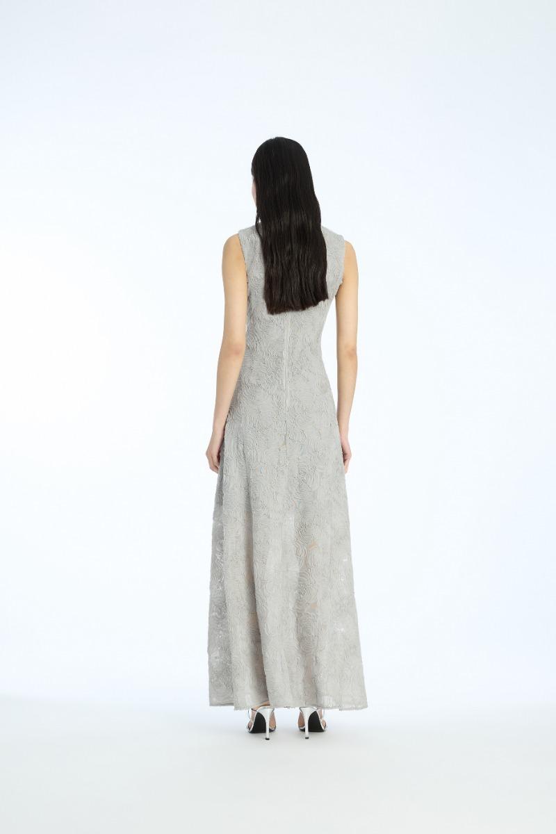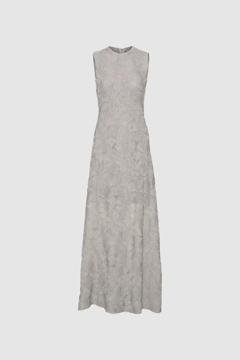 L'abito lungo in rete grigio-viola è un abito senza maniche lungo fino al pavimento, realizzato in rete con un motivo floreale testurizzato all-over. Presenta uno scollo rotondo, un corpetto aderente e un orlo svasato. L'abito ha una chiusura con zip nascosta sul retro ed è foderato per una maggiore copertura.