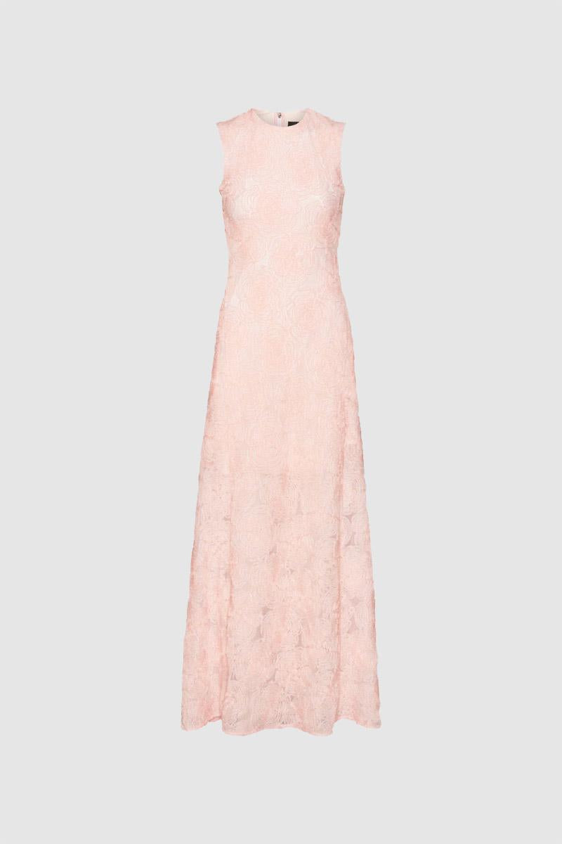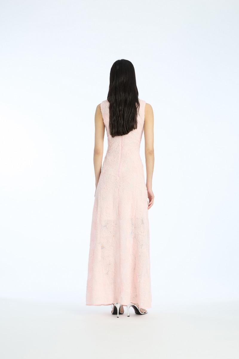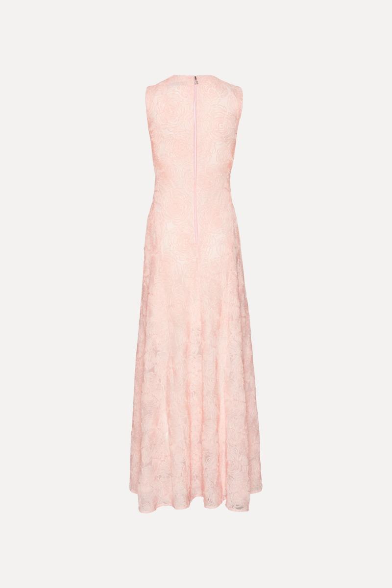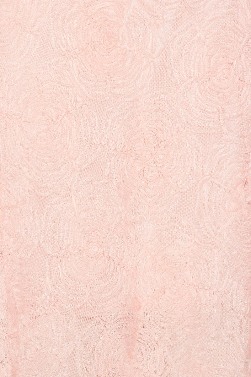 L'abito lungo in rete rosa chiaro è un abito lungo senza maniche con corpetto aderente e orlo fluido. L'abito è realizzato in rete trasparente ricamata con motivi floreali tono su tono e presenta uno scollo rotondo. È foderato.
