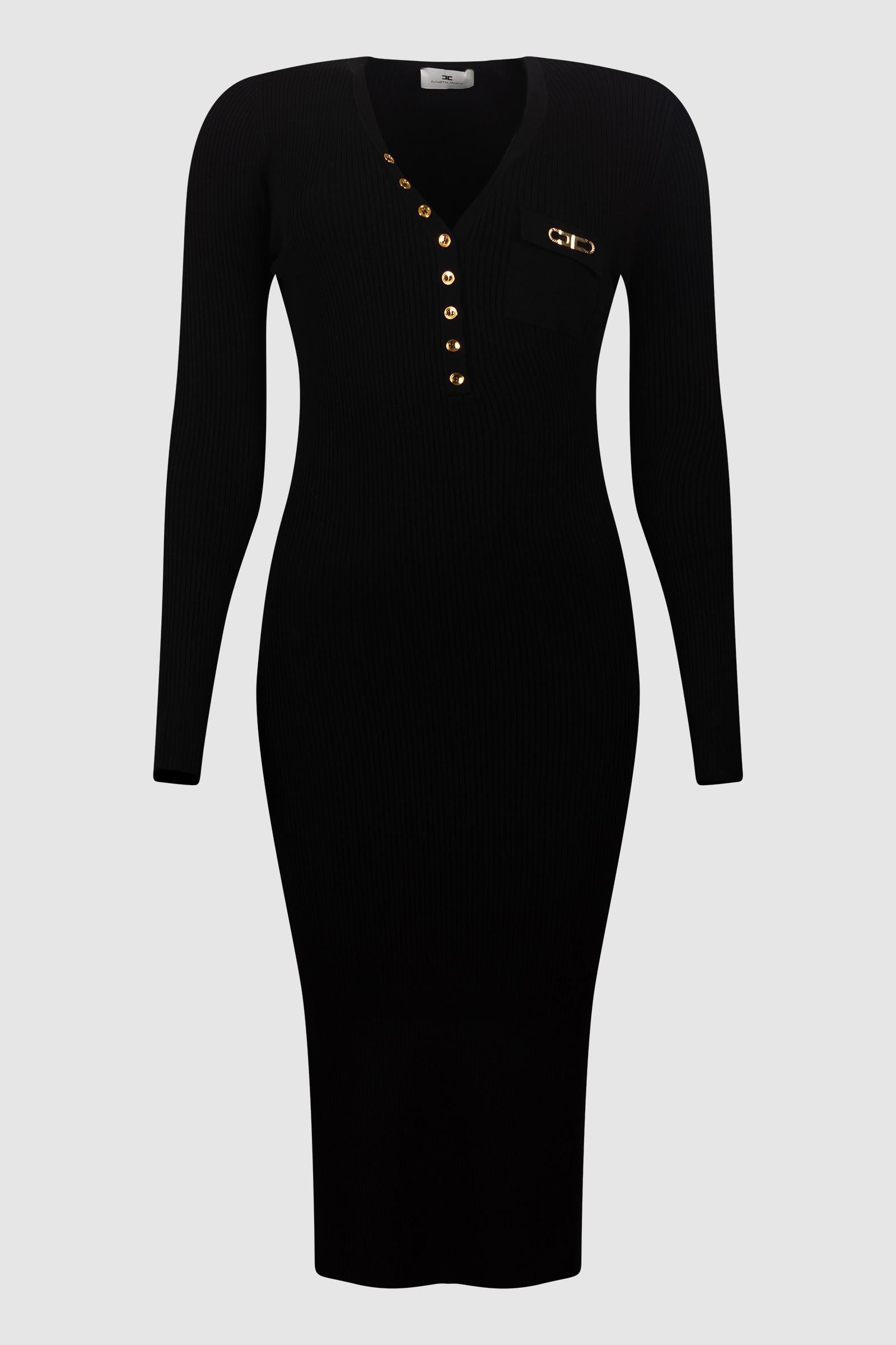 Raffinato e sensuale, questo abito lungo in maglia firmato Elisabetta Franchi incarna lo stile elegante e contemporaneo del brand. Realizzato in morbida maglia a costine, segue armoniosamente le linee del corpo, valorizzandone la silhouette. Il profondo scollo a V con bottoni dorati logati e la tasca applicata sul petto, impreziosita da una mini fibbia dorata, donano al capo un tocco sofisticato e iconico.