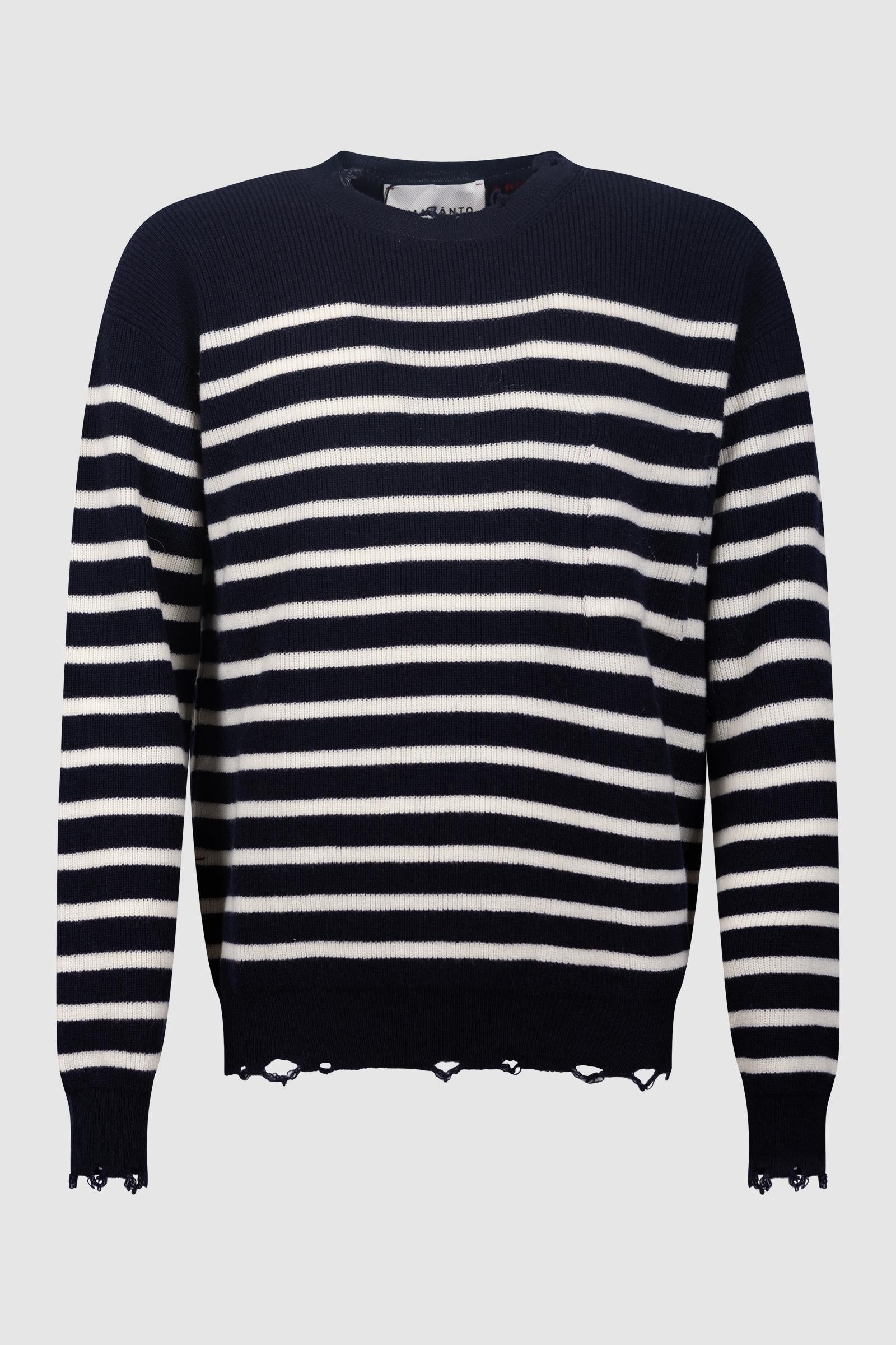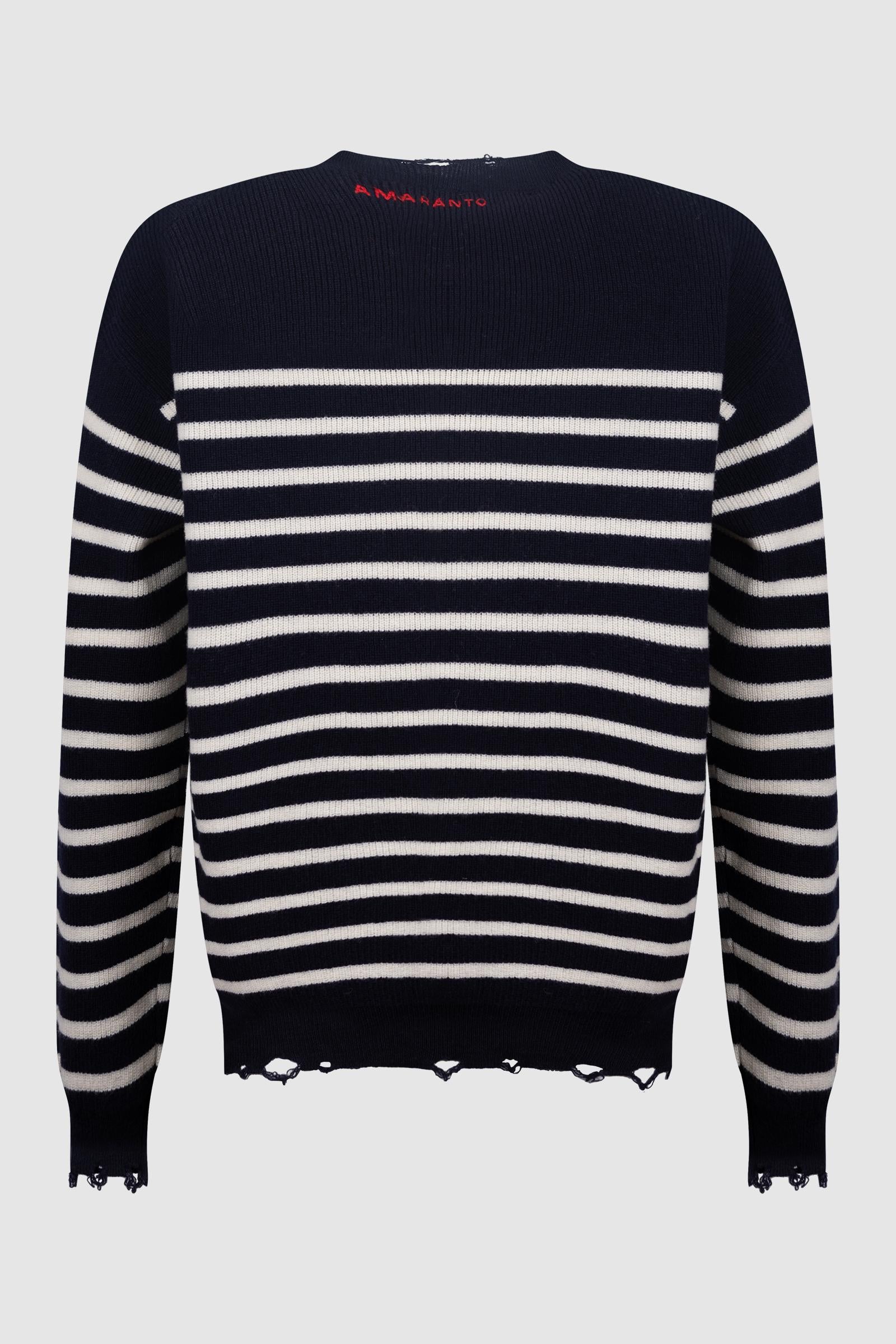 Il maglione a righe firmato Amaranto unisce lo stile marinière a un tocco contemporaneo e distintivo. Realizzato in morbida maglia, presenta un motivo a righe orizzontali bianche e blu navy e dettagli sfrangiati sul fondo e sui polsini che aggiungono carattere e originalità. Il taglio regolare e il girocollo classico lo rendono un capo versatile, perfetto per un look casual ma curato.