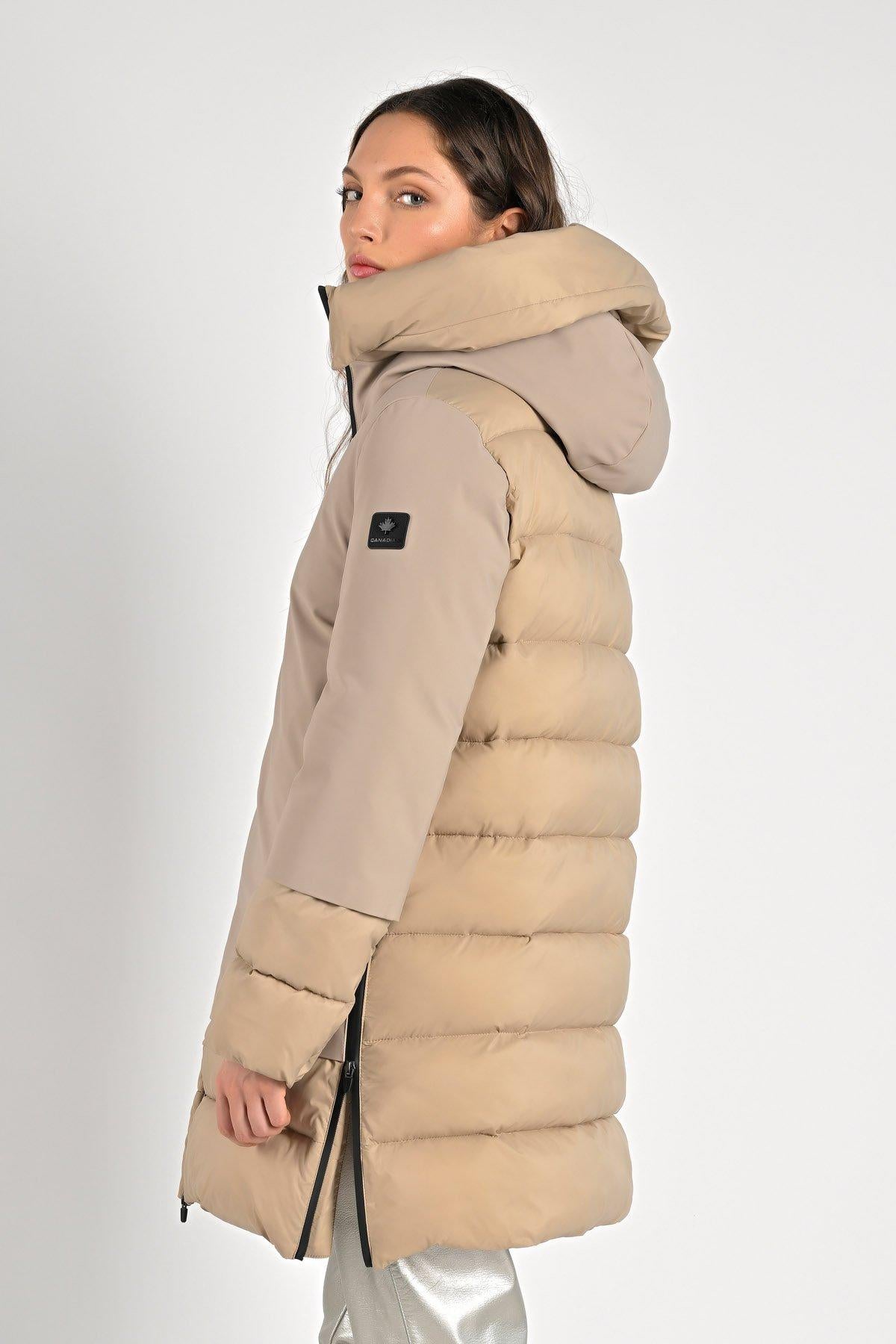 E' un fantastico mix and match tra un piumino e un cappotto e, ne siamo certe, risolverà con uno stile impeccabile, ogni vostro outfit invernale. Idrorepellente e traspirante, questo capospalla è realizzato in nylon ed è imbottito da poliestere, ha una chiusura a zip e un pratico cappuccio integrato pronto all'uso. I giochi di contrasto tra lucido e opaco, liscio e trapuntato sono le caratteristiche che lo rendono davvero speciale. Anche se il suo design ha un aspetto sportivo, riuscirà a essere estremamente elegante se indossato sopra un abito di maglia magari dello stesso colore con stivaletti di vernice, una clutch coordinata e qualche bijoux dorato. Composizione: esterno: 39% poliammide 46% poliestere 15% elastane - interno 100 % poliammide - imbottitura: 100% poliestere