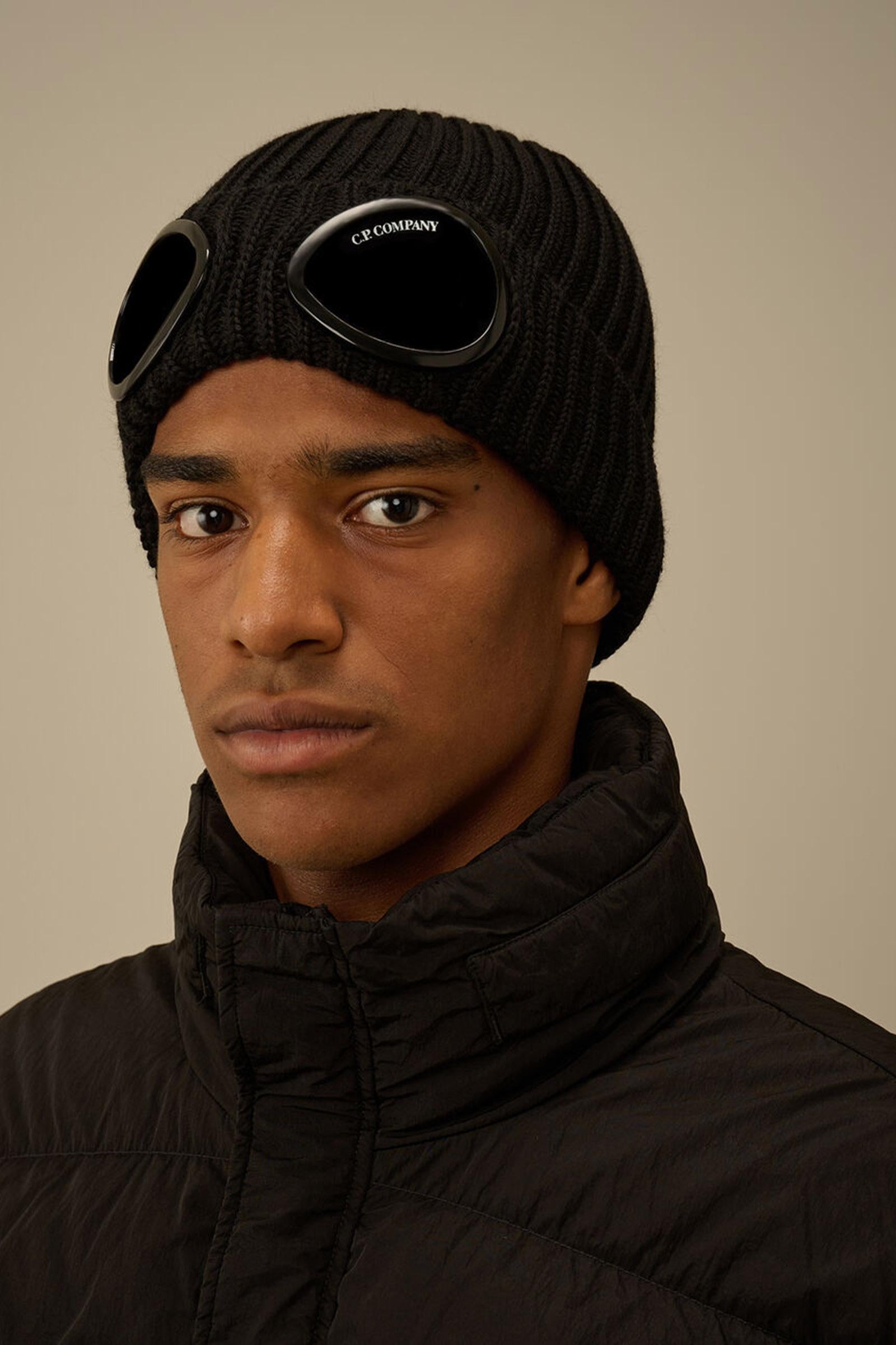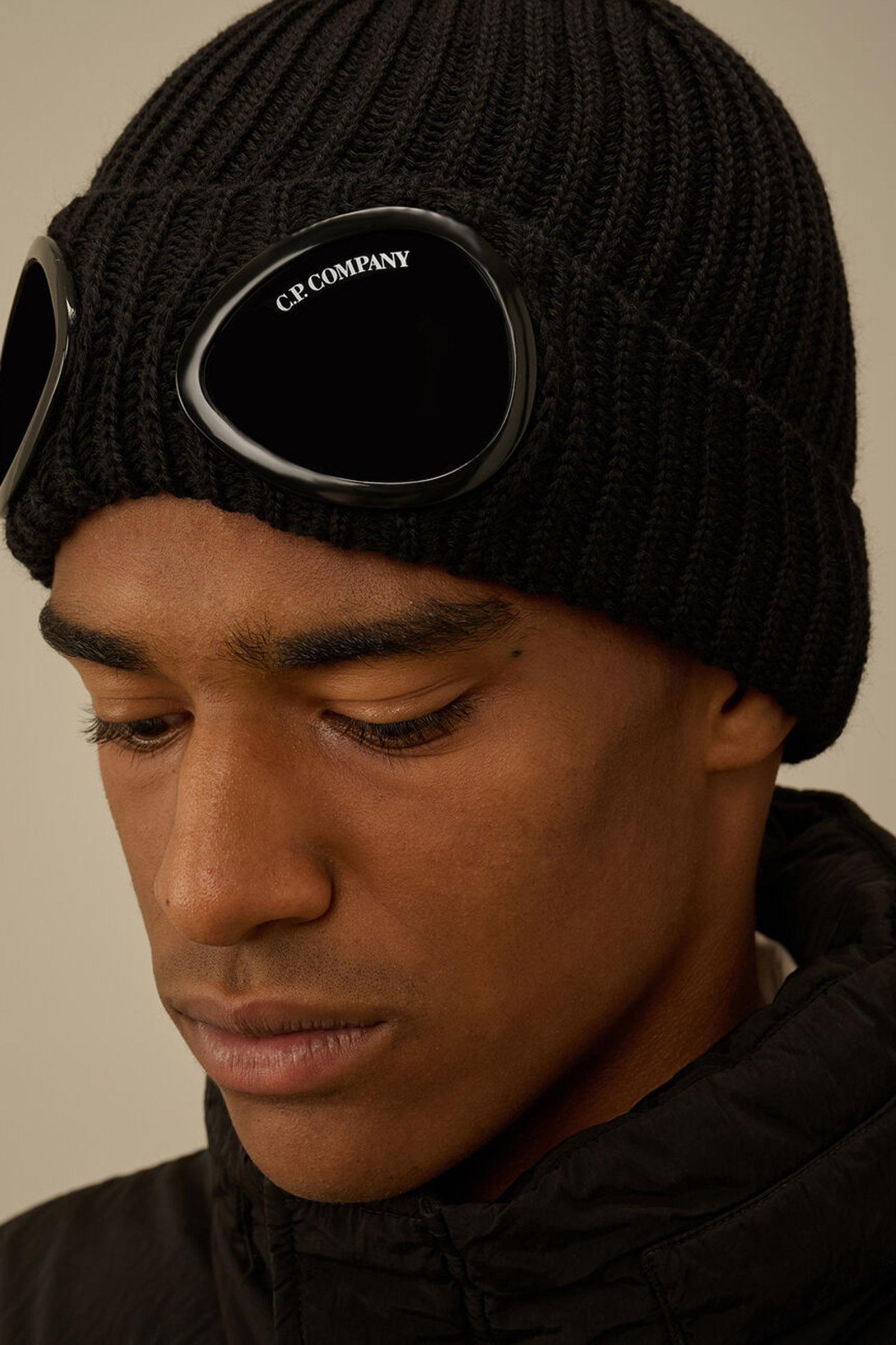 Beanie realizzato in lana merino extrafine, che garantisce morbidezza e calore. Il beanie presenta una lavorazione in maglia a costine, risvolto e le iconiche lenti Goggle di C.P. Company.