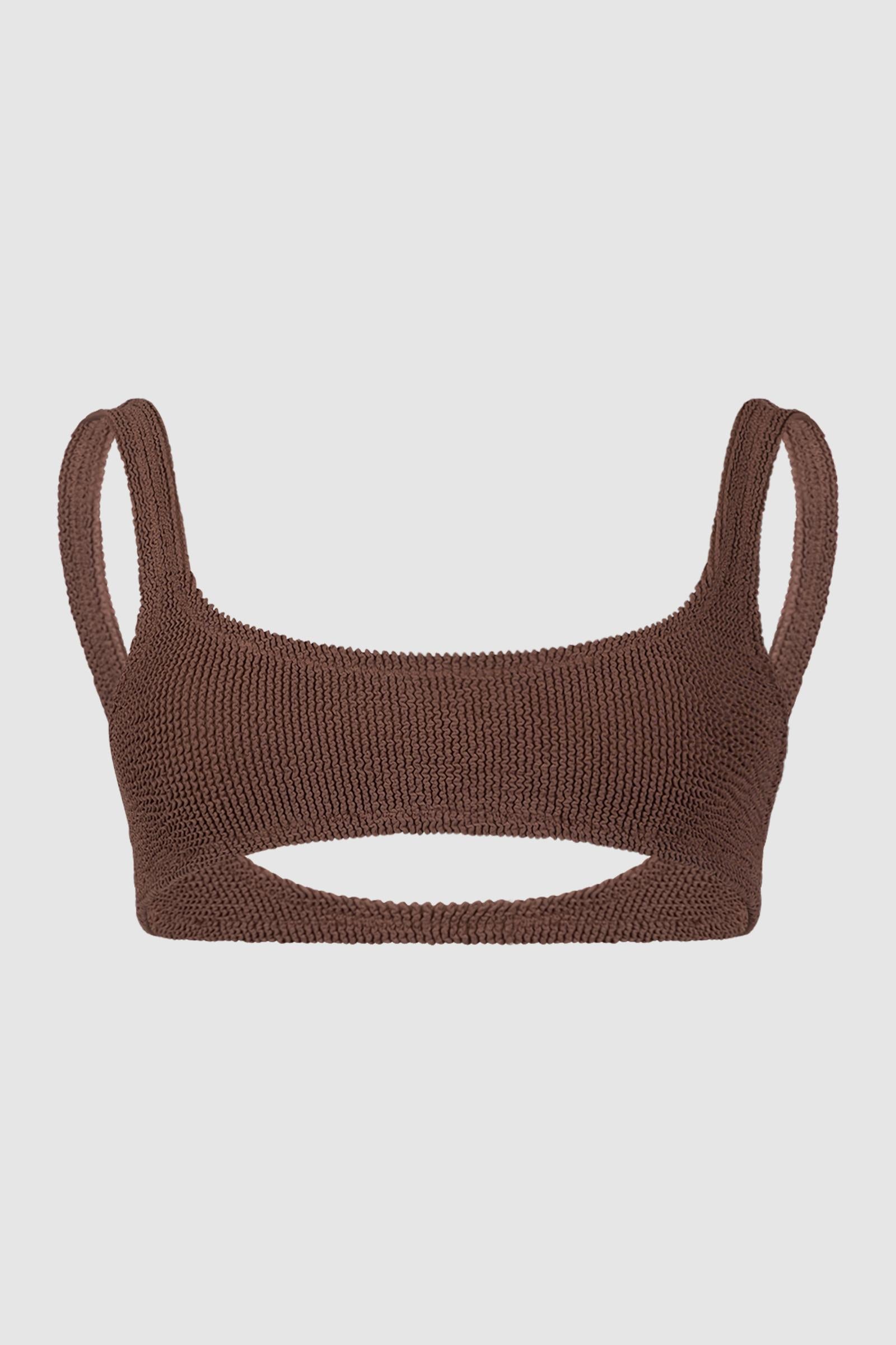 Dona un tocco bohémien e raffinato ai tuoi look da spiaggia con questo top bikini in crochet firmato St. Barth. Realizzato in maglia stretch lavorata a mano, presenta una forma bralette con spalline larghe e un taglio cut-out sotto il seno che aggiunge un twist moderno e sensuale. Perfetto per il mare, ma anche per un aperitivo vista tramonto abbinato a shorts o gonne leggere.