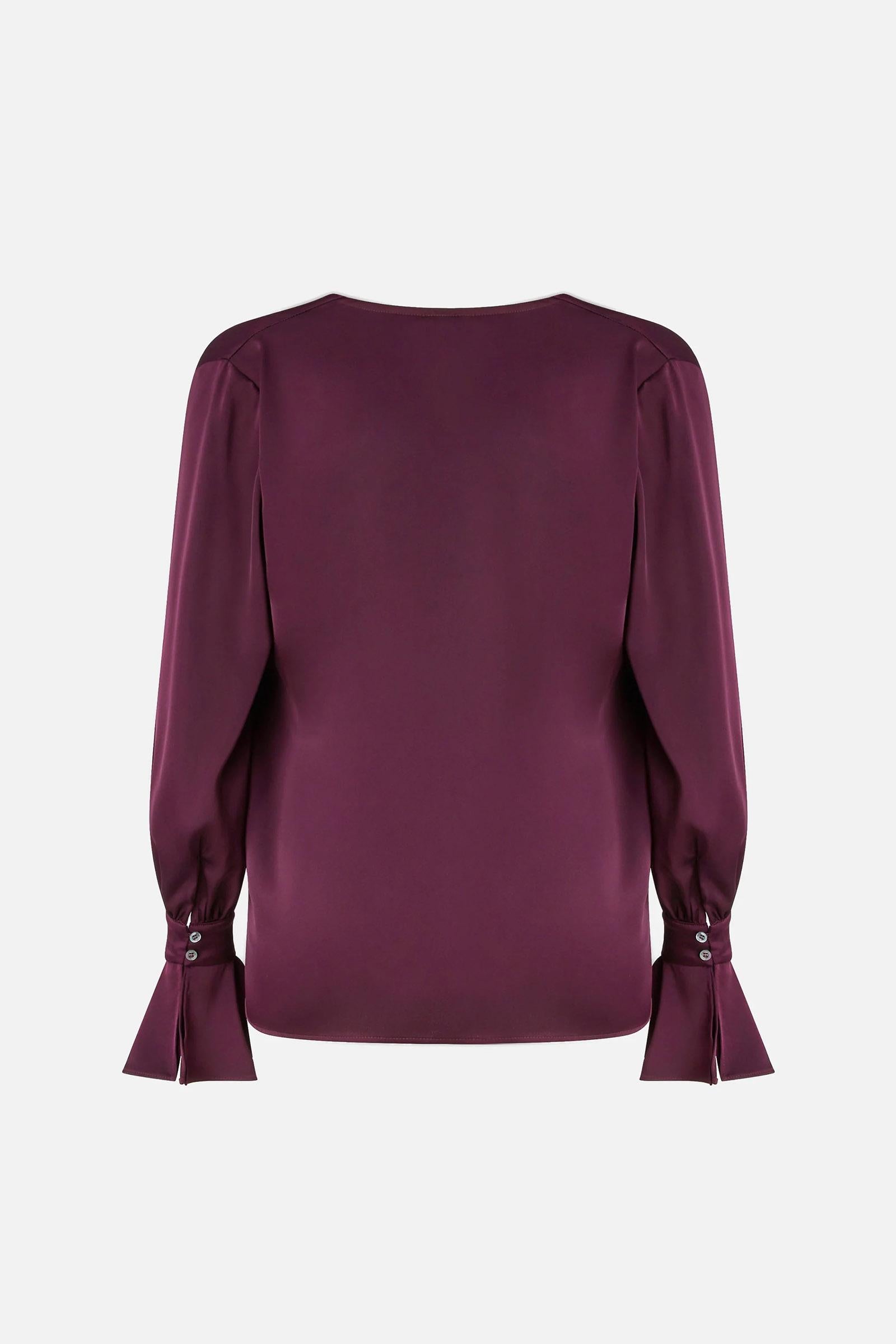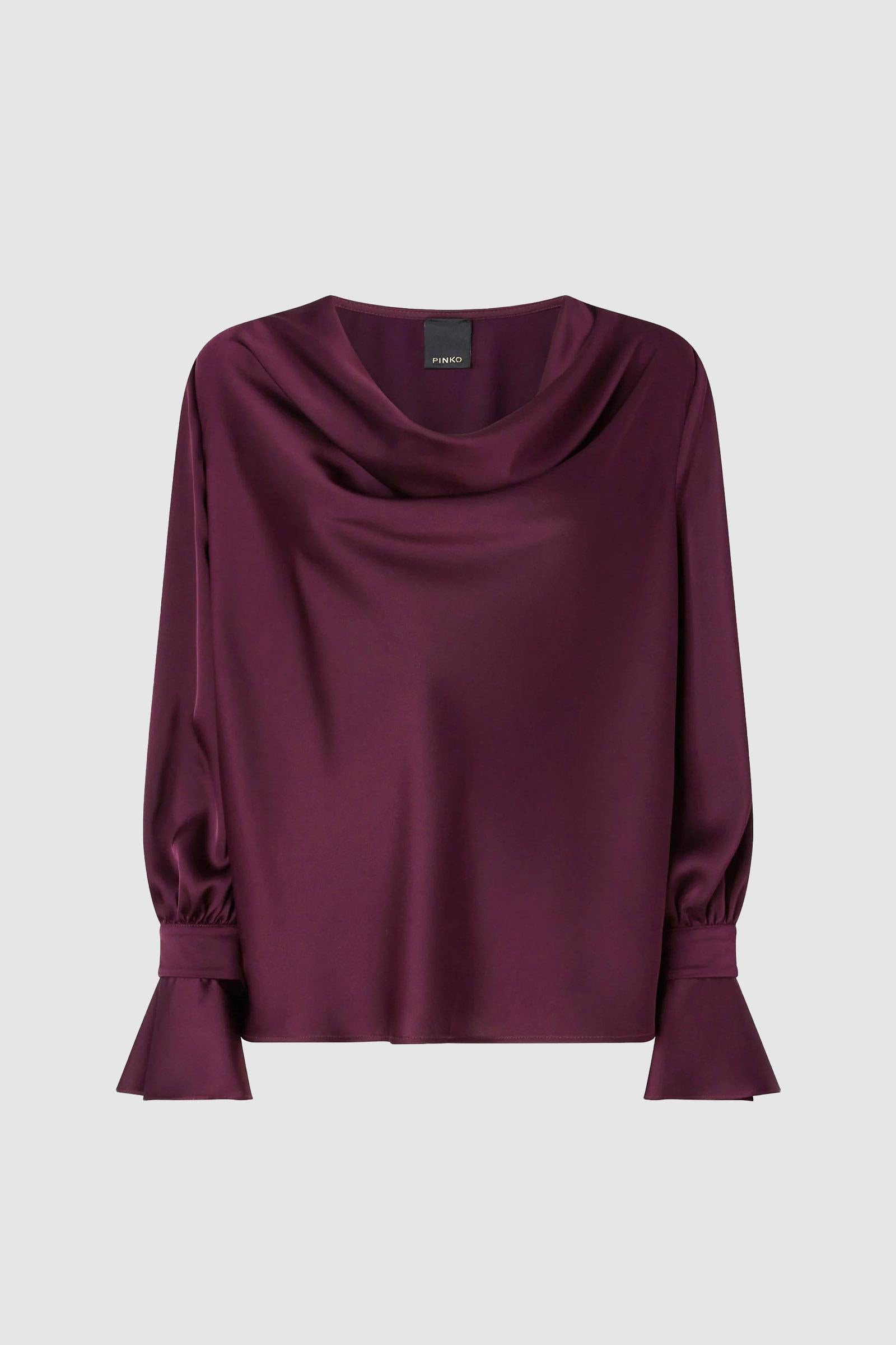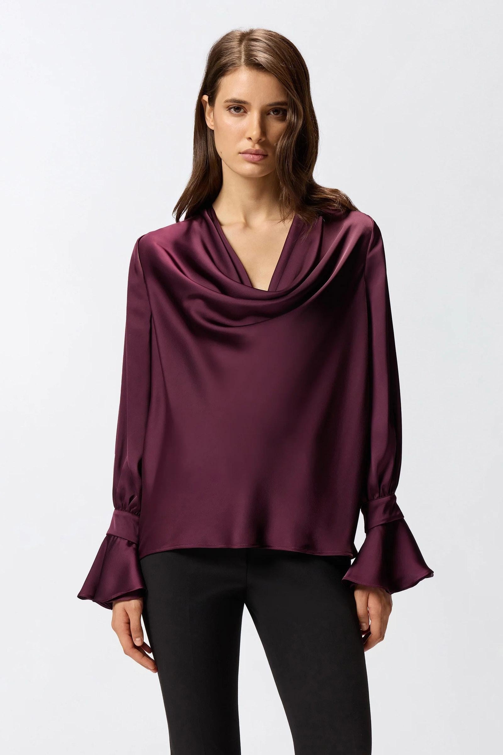 Blusa a maniche lunghe dalla vestibilità morbida realizzata in tessuto crêpe satin e caratterizzata da uno scollo drappeggiato e da polsini con bottoni e svasatura. Scegli questo modello per un effetto fluido e scivolato che esalta con eleganza e raffinatezza le linee e la silhouette femminile.Tessuto Esterno: POLIESTERE 100%